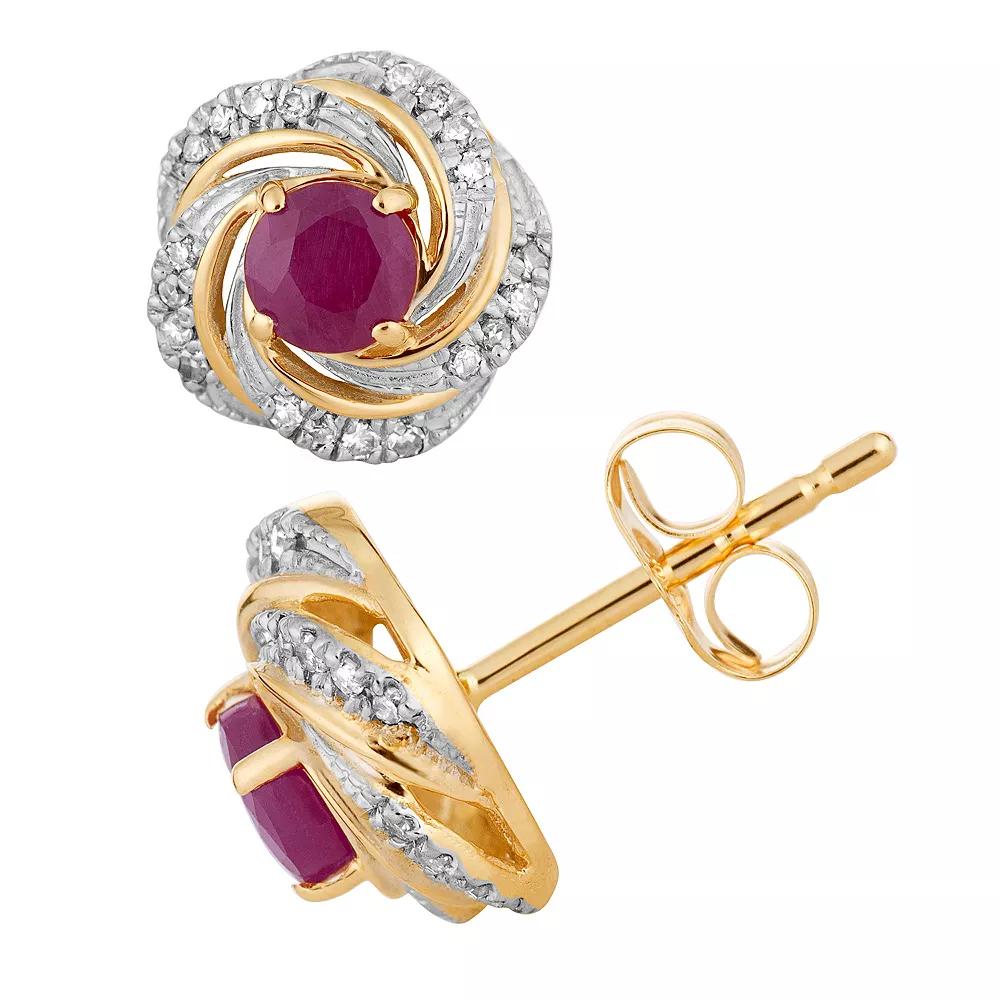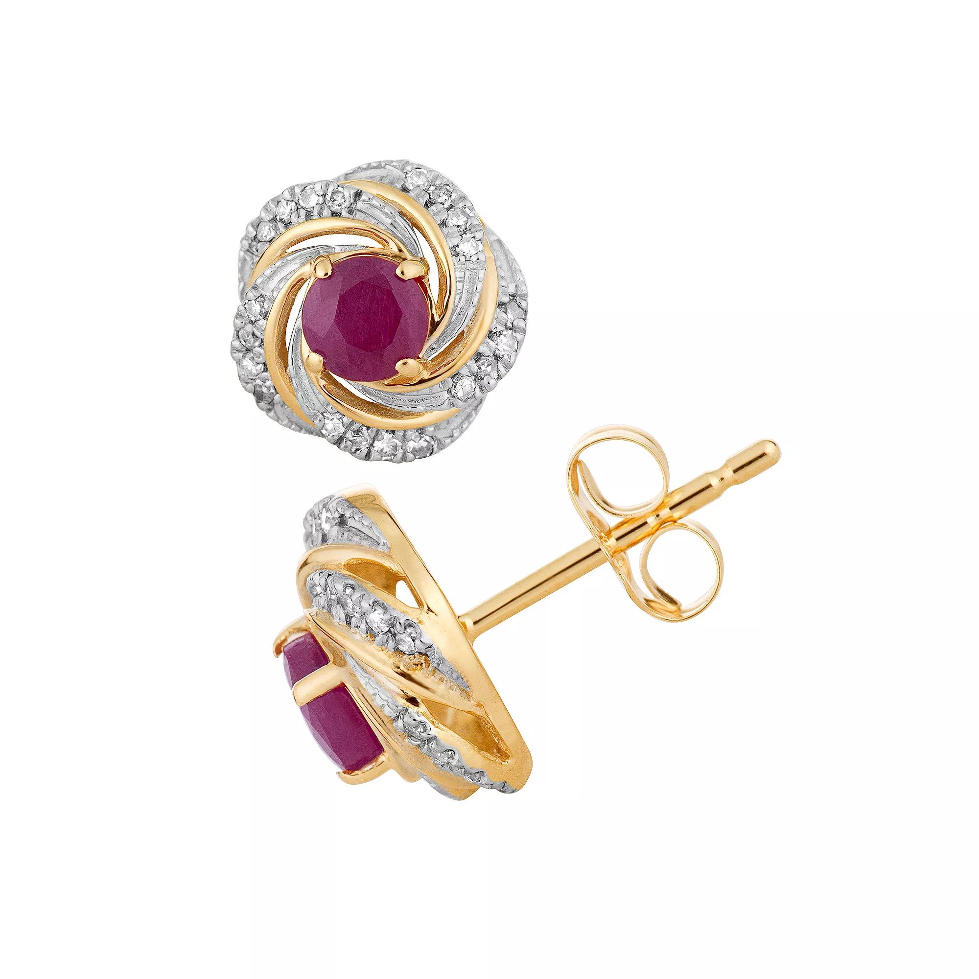 Achieve a transcendant look whenever you wear these 10k gold ruby and diamond stud earrings.EARRING DETAILS Length: 9.15 mm Backings: post Metal: 10k gold Finish: polished Packaging: boxed STONE DETAILS Stone type: ruby Total weight: 3/4 ct. Center stone size: 4 mm Shape: round Setting: prong DIAMOND DETAILS Total weight: 1/8 ct. Color grade: I-J Clarity: I2-I3 Shape: round Setting: prong Gemstones may have been treated to enhance their appearance. Special care may be required. Please visit our Gemstone Treatment & Special Care Guide for more information.Image(s) may be enlarged to show detail.Diamond weights are approximate. Diamond total weights may vary between .01 and .08 ct. Some diamonds have fewer than 17 facets. Gender: female. Age Group: adult.