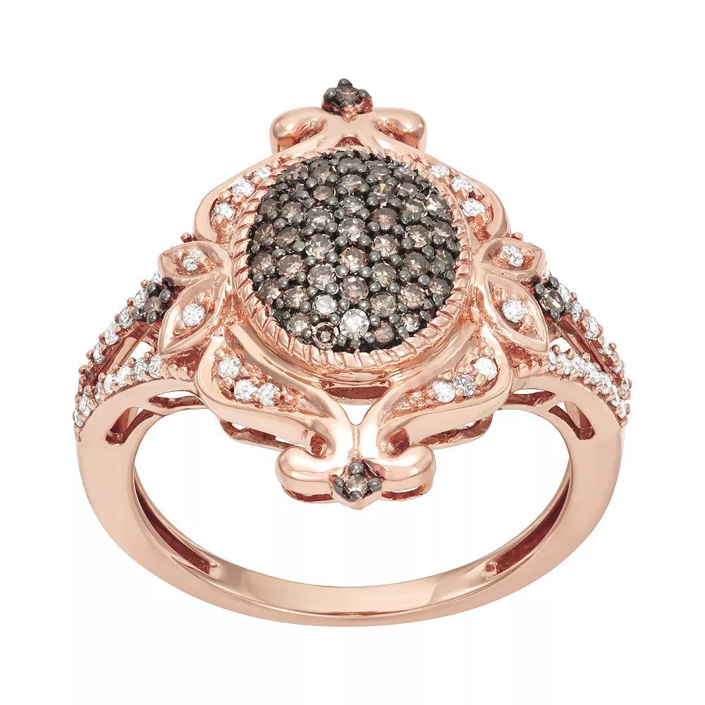An elegant look is effortless whenever you wear this brown and white diamond cocktail ring. An elegant look is effortless whenever you wear this brown and white diamond cocktail ring. Width: 21 mm Metal: 10k rose gold Finish: polished Packaging: boxedDIAMOND DETAILS Total weight: 1/2 ct. Shape: round Setting: prong Gemstones may have been treated to enhance their appearance. Special care may be required. Please visit our Gemstone Treatment & Special Care Guide for more information. Diamond weights are approximate. Diamond total weights may vary between .01 and .08 ct. Some diamonds have fewer than 17 facets. Image(s) may be enlarged to show detail. Please note, due to the high value of this item, a signature may be required upon delivery. Size: 9. Gender: female. Age Group: adult.