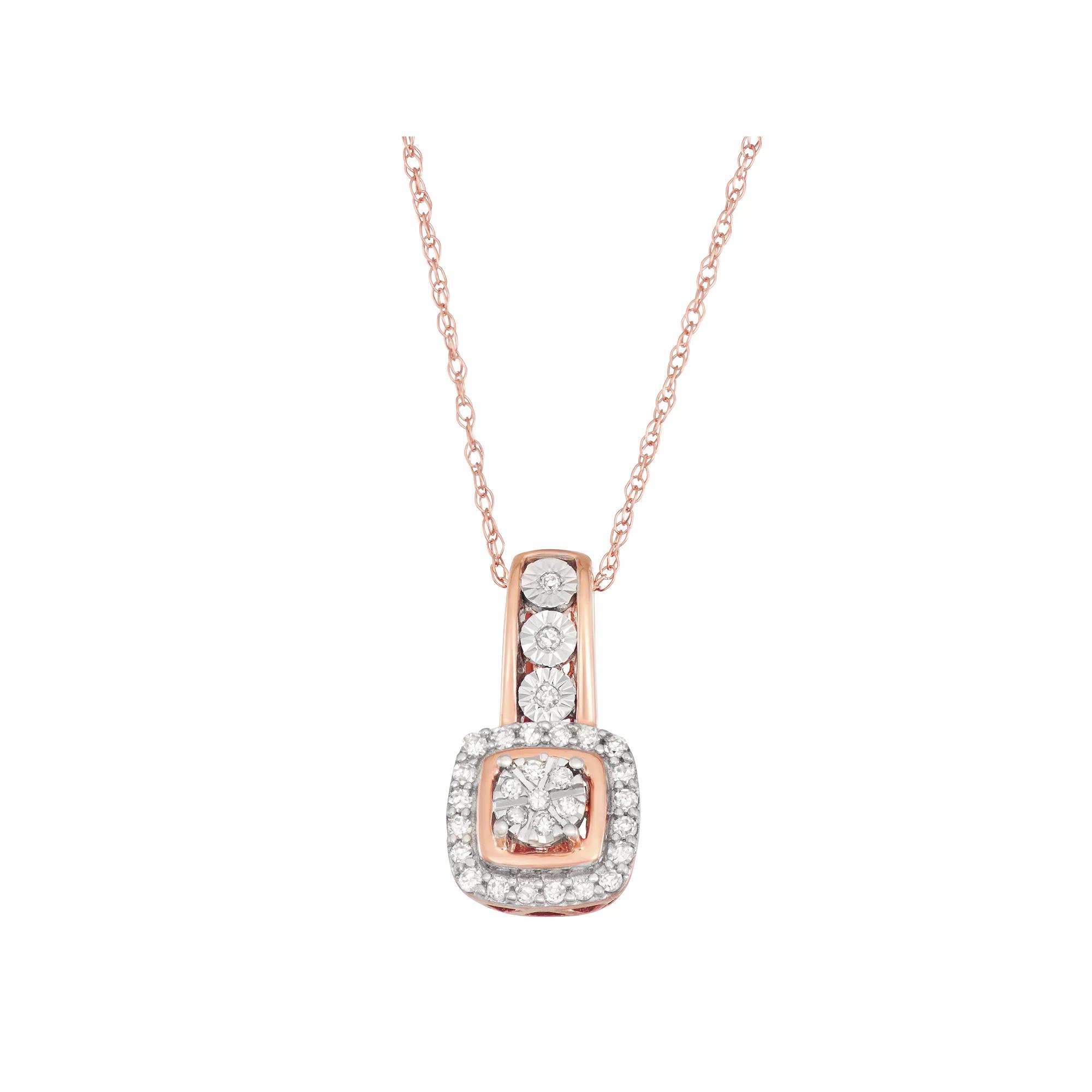 Accessorize with elegant style when you wear this diamond drop pendant necklace. Clasp: spring-ring Nickel free Metal: 10k rose gold Chain length: 18 in. Packaging: boxed Finish: polished Pendant size: 0.82 in. x 0.23 in. Chain type: ropeDIAMOND DETAILS Total weight: 1/6 ct. Color grade: H-I Clarity: 11-12 Shape: round Setting: prong, miracle Diamond weights are approximate. Diamond Total Weights may vary between .01 and .13 ct. Some diamonds consist of fewer than 17 facets. Gemstones may have been treated to enhance their appearance. Special care may be required. Please visit our Gemstone Treatment & Special Care Guide for more information. Image(s) may be enlarged to show detail. Please note, due to the high value of this item, a signature may be required upon delivery. Size: 18". Color: White. Gender: female. Age Group: adult.