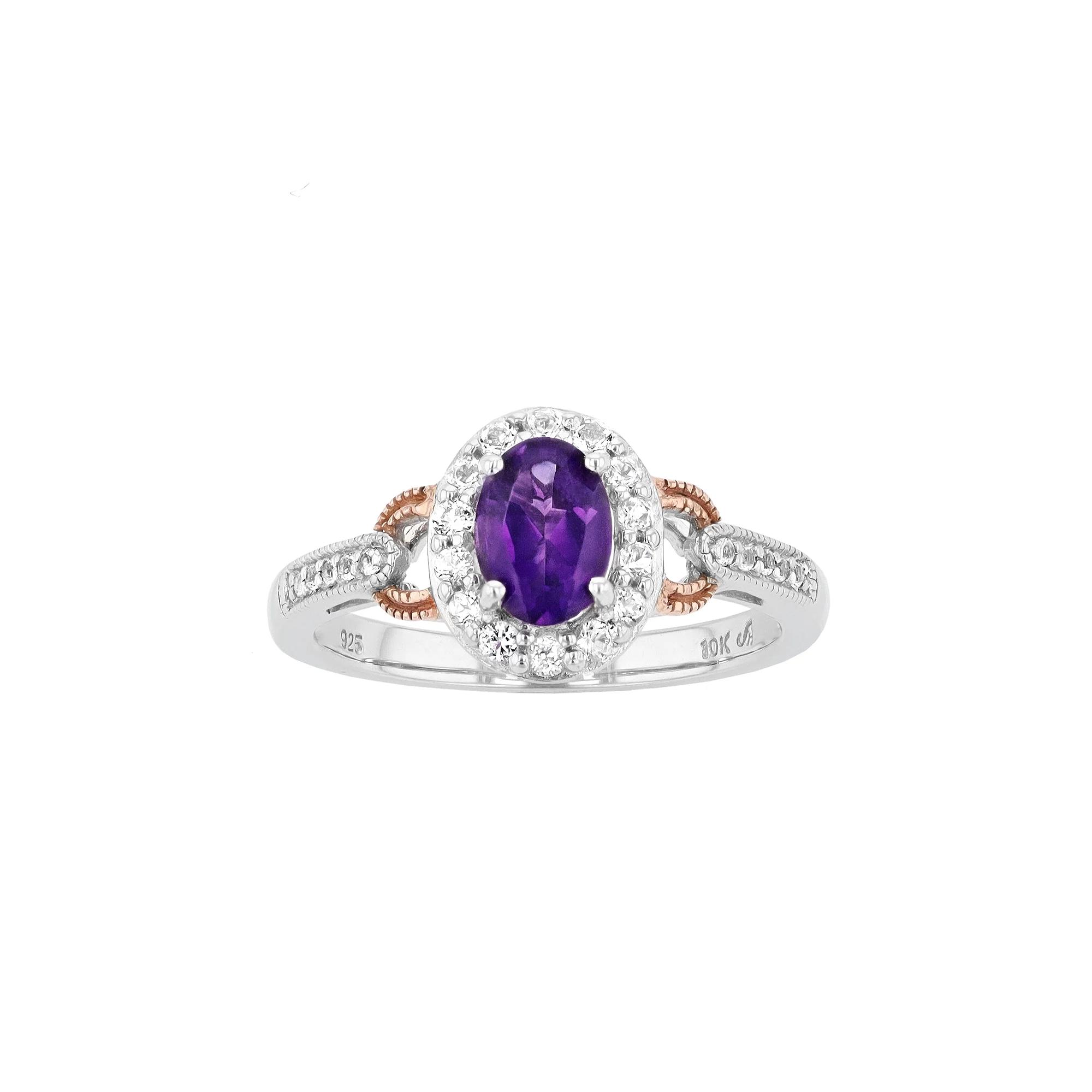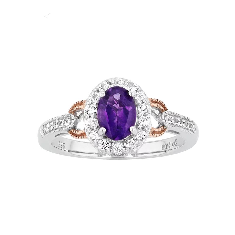 Make a statement with the 10k Rose Gold Over Silver Amethyst & White Topaz Halo Ring, featuring a stunning amethyst center stone surrounded by a halo of sparkling white topaz. Click on this JEWELRY & WATCHES GUIDE to learn about fit, styles, materials and more! Make a statement with the 10k Rose Gold Over Silver Amethyst & White Topaz Halo Ring, featuring a stunning amethyst center stone surrounded by a halo of sparkling white topaz. Click on this JEWELRY & WATCHES GUIDE to learn about fit, styles, materials and more! FEATURES Width: 10.41 mm Shank style: straight Nickel safe Metal: 10k rose gold, sterling silver Plating: rhodium Finish: milgrain, polished Packaging: boxedSTONE DETAILS Stone type: amethyst, white topaz Total weight: 1 ct. Center stone weight: 3/4 ct. Center stone size: 7 mm x 5 mm Shape: oval Setting: prong, shared prong Gemstones may have been treated to enhance their appearance. Special care may be required. Please visit our Gemstone Treatment & Special Care Guide for more information. Color: Two Tone. Gender: female. Age Group: adult.