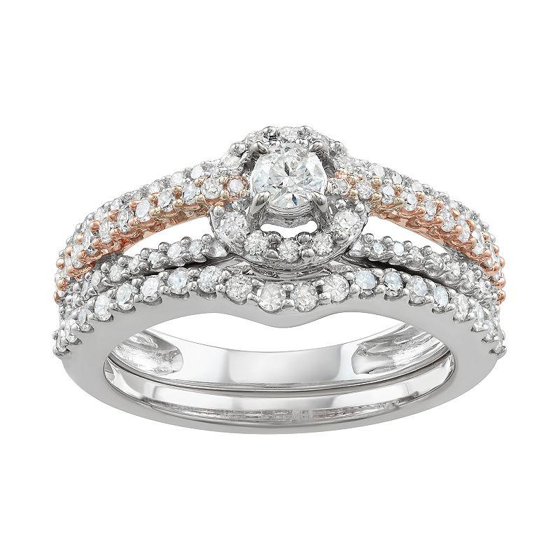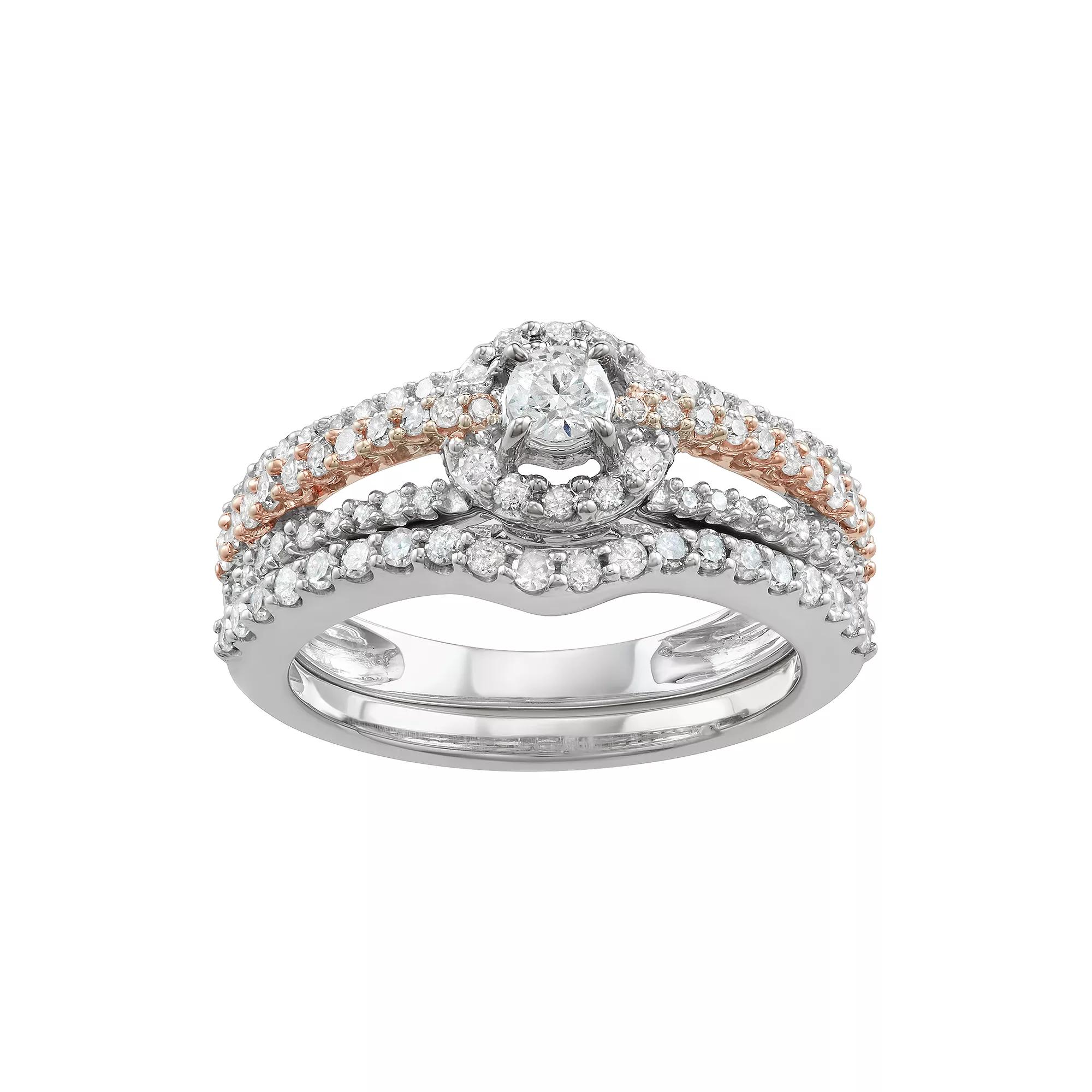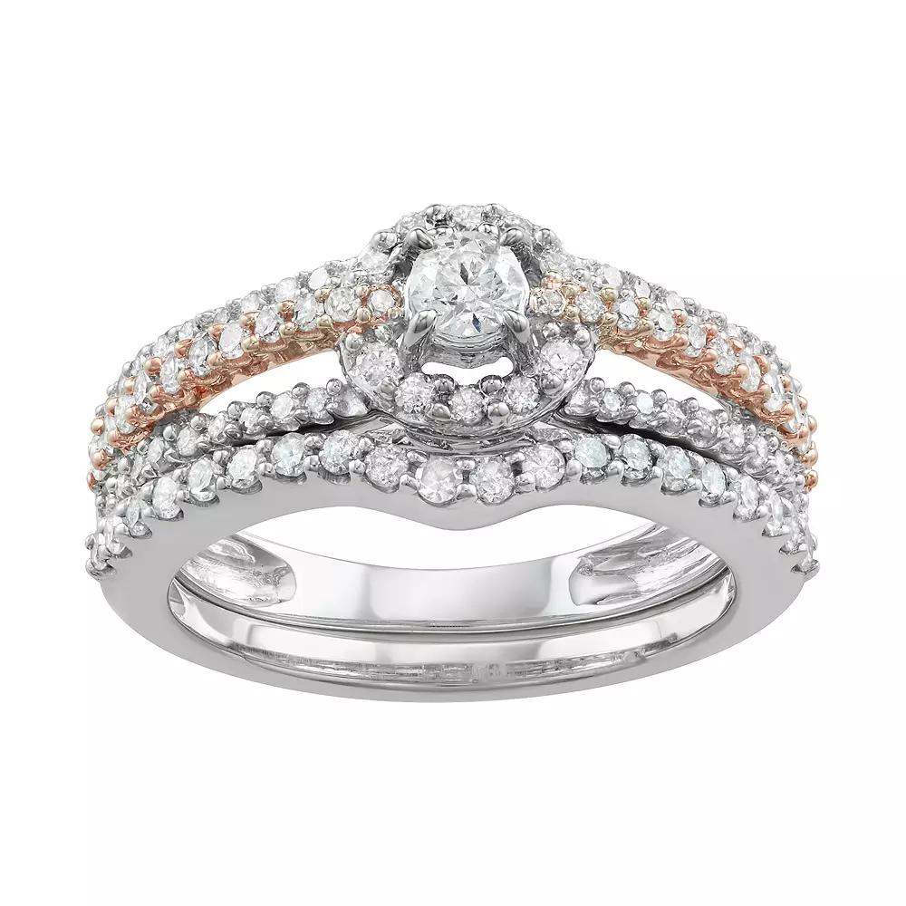 Showcase your unending love when you present her with this engagement ring set. Adorned with round-cut diamonds situated in a halo motif, this engagement ring set is sure to be cherished for a lifetime. SET INCLUDES Includes: engagement ring & wedding...