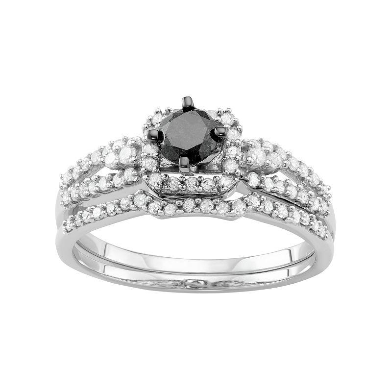 Profess your love in a captivating way when you present her with this stunning black and white diamond engagement ring set.SET DETAILS Includes: 2 rings Total width: 0.3 in. Metal: 10k white gold Plating: rhodium Packaging: boxed DIAMOND DETAILS Total weight: 1 ct. Center stone weight: 1/2 ct. Shape: round Color: black, white Color grade: H-I Clarity: I1-I2 Setting: prong Gemstones may have been treated to enhance their appearance. Special care may be required. Please visit our Gemstone Treatment & Special Care Guide for more information.Image(s) may be enlarged to show detail.Diamond weights are approximate. Diamond total weights may vary between .01 and .08 ct. Some diamonds have fewer than 17 facets.Please note, due to the high value of this item, a signature may be required upon delivery. Size: 9. Gender: female. Age Group: adult.