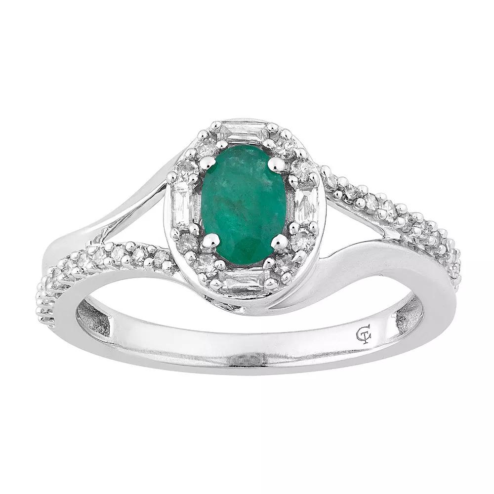 Enhance your wardrobe with the eye-catching style of this 10k white gold emerald and diamond oval halo ring.RING DETAILSWidth: 9.30 mmMetal: 10k white goldPlating: rhodiumFinish: polishedPackaging: boxedSTONE DETAILSStone type: emeraldTotal weight: 3/8 ct.Center stone size: 6 mm x 4 mmShape: ovalSetting: prongDIAMOND DETAILSTotal weight: 1/4 ct.Color grade: I-JClarity: I2-I3Shape: roundSetting: prongGemstones may have been treated to enhance their appearance. Special care may be required. Please visit our Gemstone Treatment & Special Care Guide for more information. Image(s) may be enlarged to show detail.Diamond weights are approximate. Diamond total weights may vary between .01 and .08 ct. Some diamonds have fewer than 17 facets.Please note, due to the high value of this item, a signature may be required upon delivery. Color: Green. Gender: female. Age Group: adult.
