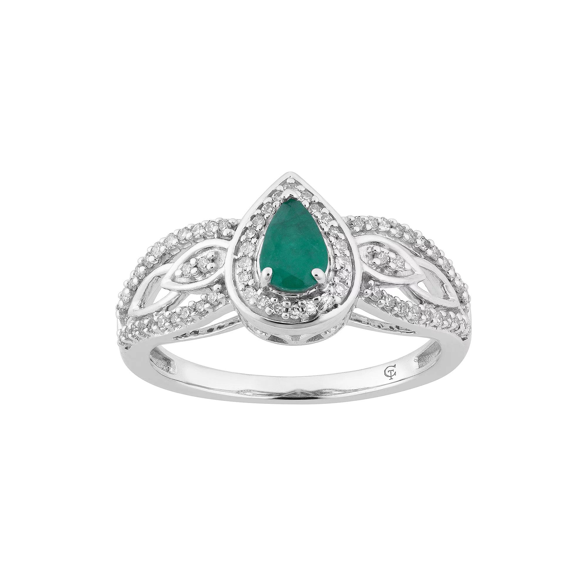 Intricately designed with open-worked details, diamonds, and a pear-shaped genuine emerald center stone, This 10k white gold teardrop ring is simply stunning.RING DETAILSWidth: 10.40 mmMetal: 10k white goldPlating: rhodiumFinish: polishedPackaging: boxedSTONE DETAILSStone type: emeraldTotal weight: 3/8 ct.Center stone size: 6 mm x 4 mmShape: pearSetting: prongDIAMOND DETAILSTotal weight: 1/4 ct.Color grade: I-JClarity: I2-I3Shape: roundSetting: prongGemstones may have been treated to enhance their appearance. Special care may be required. Please visit our Gemstone Treatment & Special Care Guide for more information. Image(s) may be enlarged to show detail.Diamond weights are approximate. Diamond total weights may vary between .01 and .08 ct. Some diamonds have fewer than 17 facets. Color: Green. Gender: female. Age Group: adult.