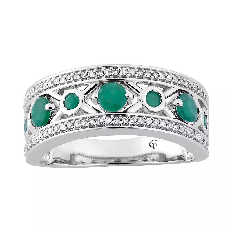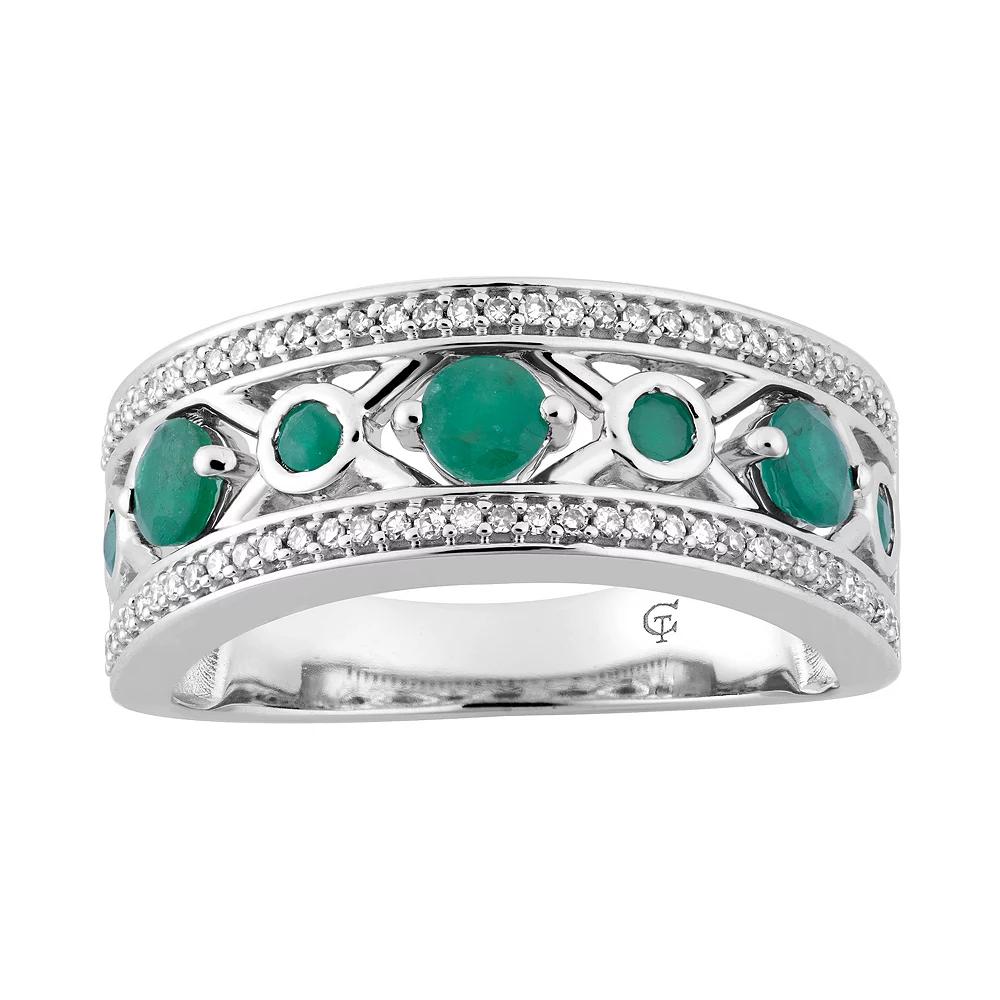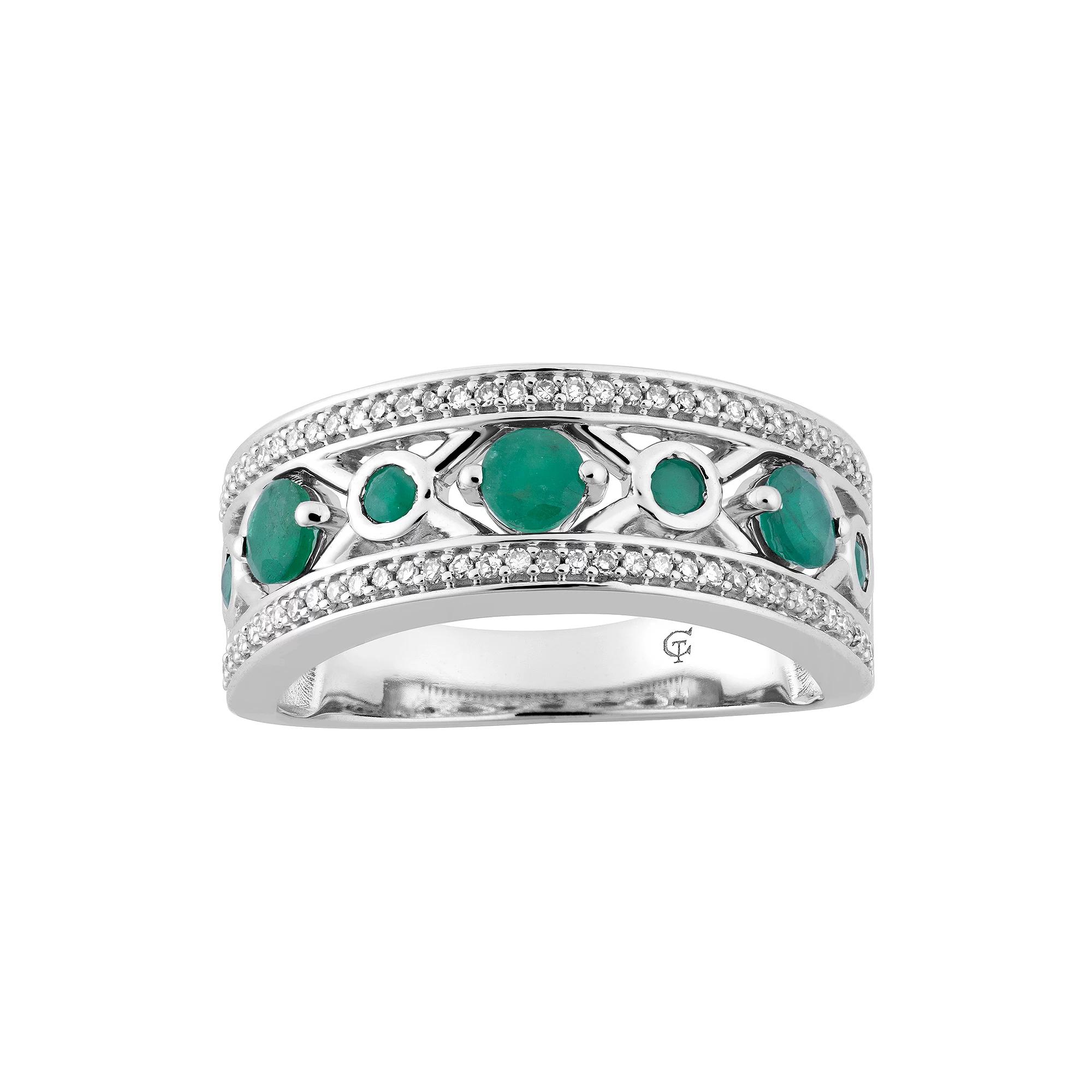 Decorated with alternating large and small round-cut emeralds set within an "X" pattern, this 10k white gold ring lends a touch of distinction to your ensembles.RING DETAILSWidth: 8.35 mmMetal: 10k white goldPlating: rhodiumFinish: polishedPackaging: boxedSTONE DETAILSStone type: emeraldTotal weight: Less than 1/10 ct.Center stone size: 6 mm x 4 mmShape: roundSetting: prongDIAMOND DETAILSTotal weight: 1/5 ct.Color grade: I-JClarity: I2-I3Shape: roundSetting: prongGemstones may have been treated to enhance their appearance. Special care may be required. Please visit our Gemstone Treatment & Special Care Guide for more information. Image(s) may be enlarged to show detail.Diamond weights are approximate. Diamond total weights may vary between .01 and .08 ct. Some diamonds have fewer than 17 facets. Color: Green. Gender: female. Age Group: adult.