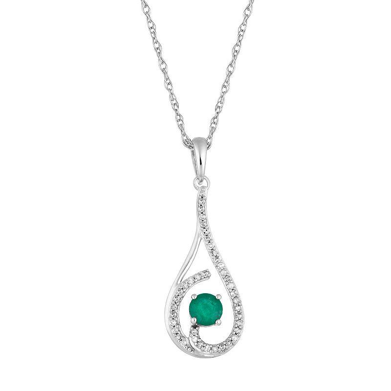 Accent your ensembles in an elegant way with this captivating 10k white gold emerald and diamond drop pendant. PENDANT DETAILSPendant size: 0.81 in. x 0.38 in.Chain length: 18 in.Chain type: ropeClasp: spring ringMetal: 10k white goldPlating: rhodiumFinish: polishedPackaging: boxedSTONE DETAILSStone type: emerald Total weight: 1/4 ct.Center stone size: 4 mmShape: round cutSetting: prongDIAMOND DETAILSTotal weight: 1/8 ct.Color grade: I-JClarity: I2-I3Shape: roundSetting: prongGemstones may have been treated to enhance their appearance. Special care may be required. Please visit our Gemstone Treatment & Special Care Guide for more information. Image(s) may be enlarged to show detail.Diamond weights are approximate. Diamond total weights may vary between .01 and .08 ct. Some diamonds have fewer than 17 facets. Size: 18. Color: Green. Gender: female. Age Group: adult.