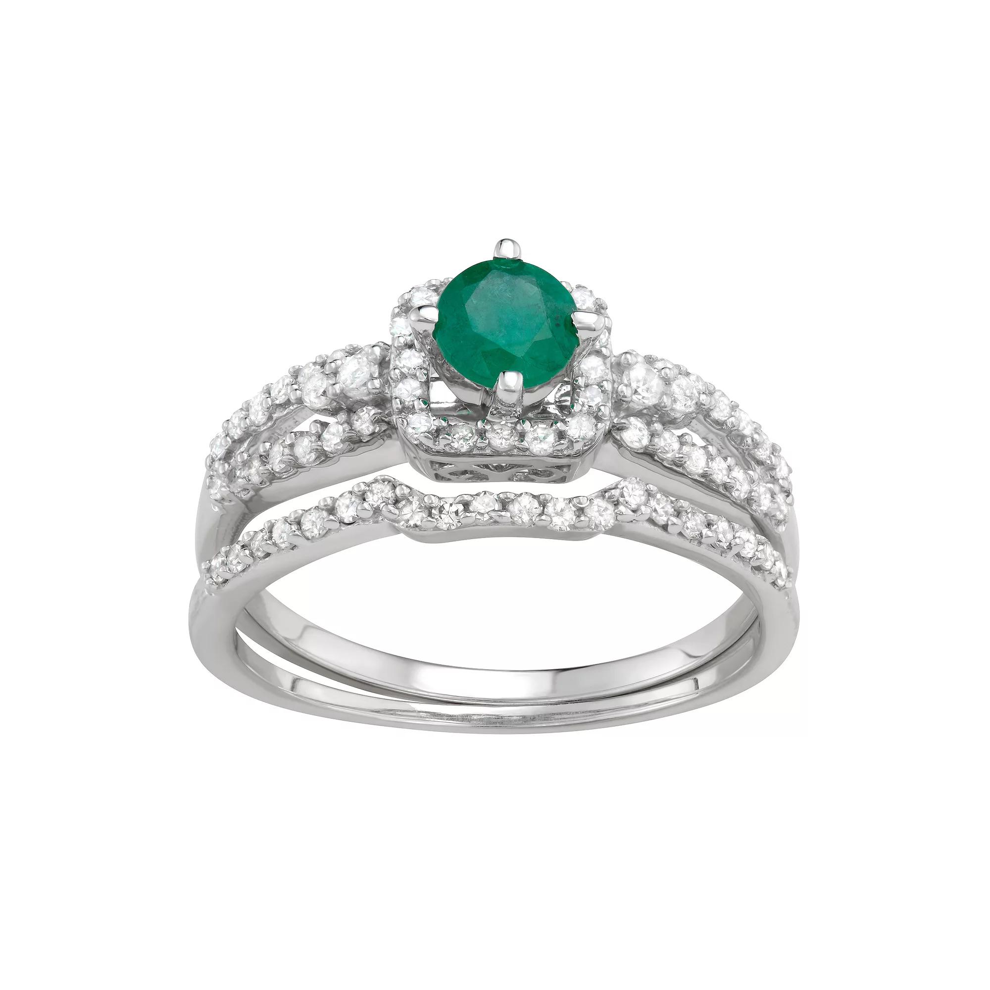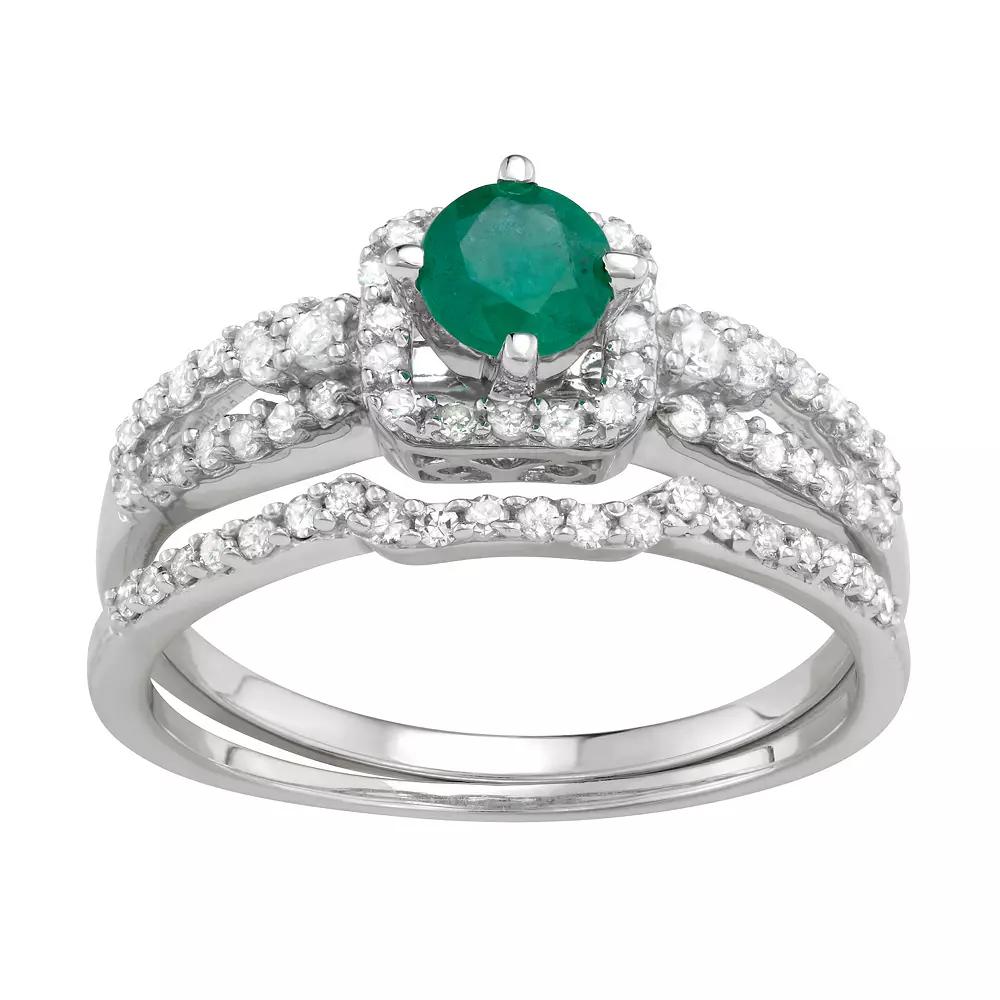 Beautifully appointed with an emerald center stone and round-cut diamonds, this 10k white gold engagement ring set celebrates your timeless commitment. Metal: 10k white gold Finish: polished Packaging: boxedSTONE DETAILS Stone type: emerald Total weight: 1/2 ct. Center stone size: 5 mm x 5 mm Shape: round Setting: prongDIAMOND DETAILS Total weight: 1 ct. Color grade: H-I Clarity: I1-I2 Shape: round Setting: prong Gemstones may have been treated to enhance their appearance. Special care may be required. Please visit our Gemstone Treatment & Special Care Guide for more information. Diamond weights are approximate. Diamond total weights may vary between .01 and .08 ct. Some diamonds have fewer than 17 facets. Image(s) may be enlarged to show detail. Please note, due to the high value of this item, a signature may be required upon delivery. Color: Green. Gender: female. Age Group: adult.