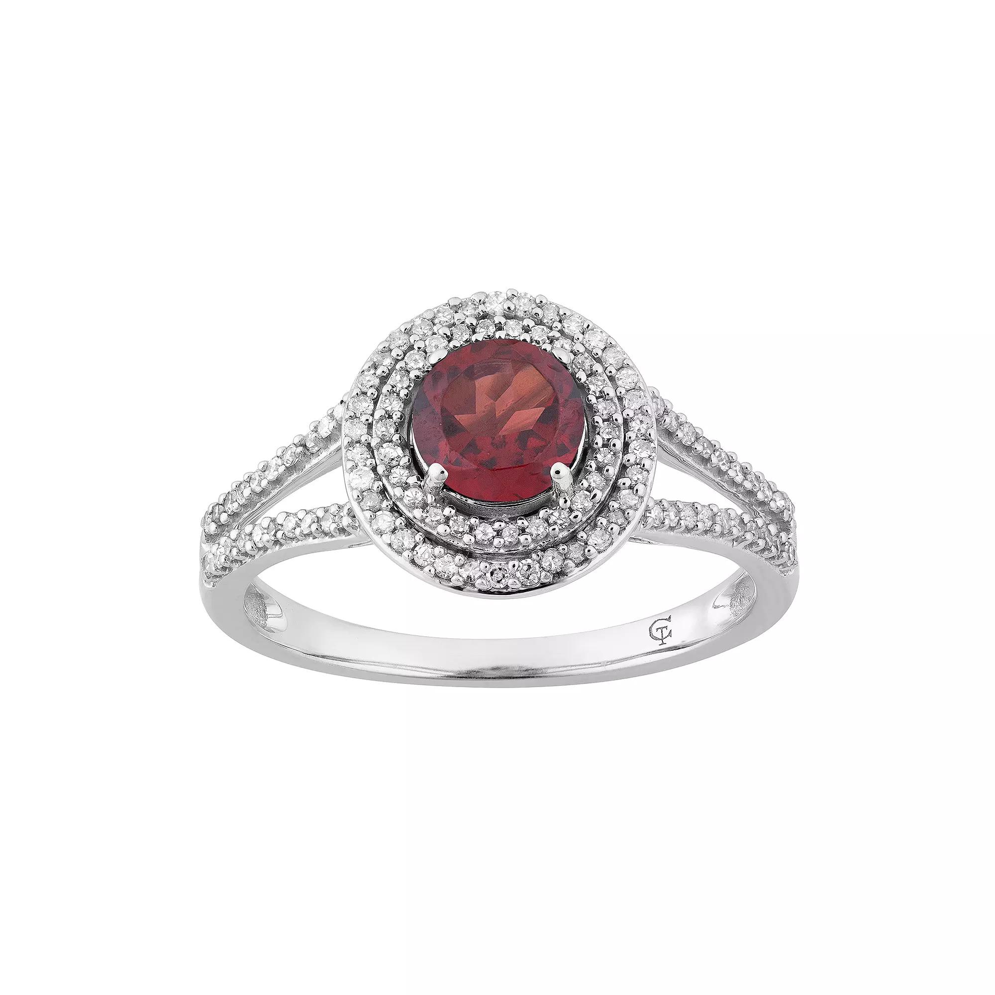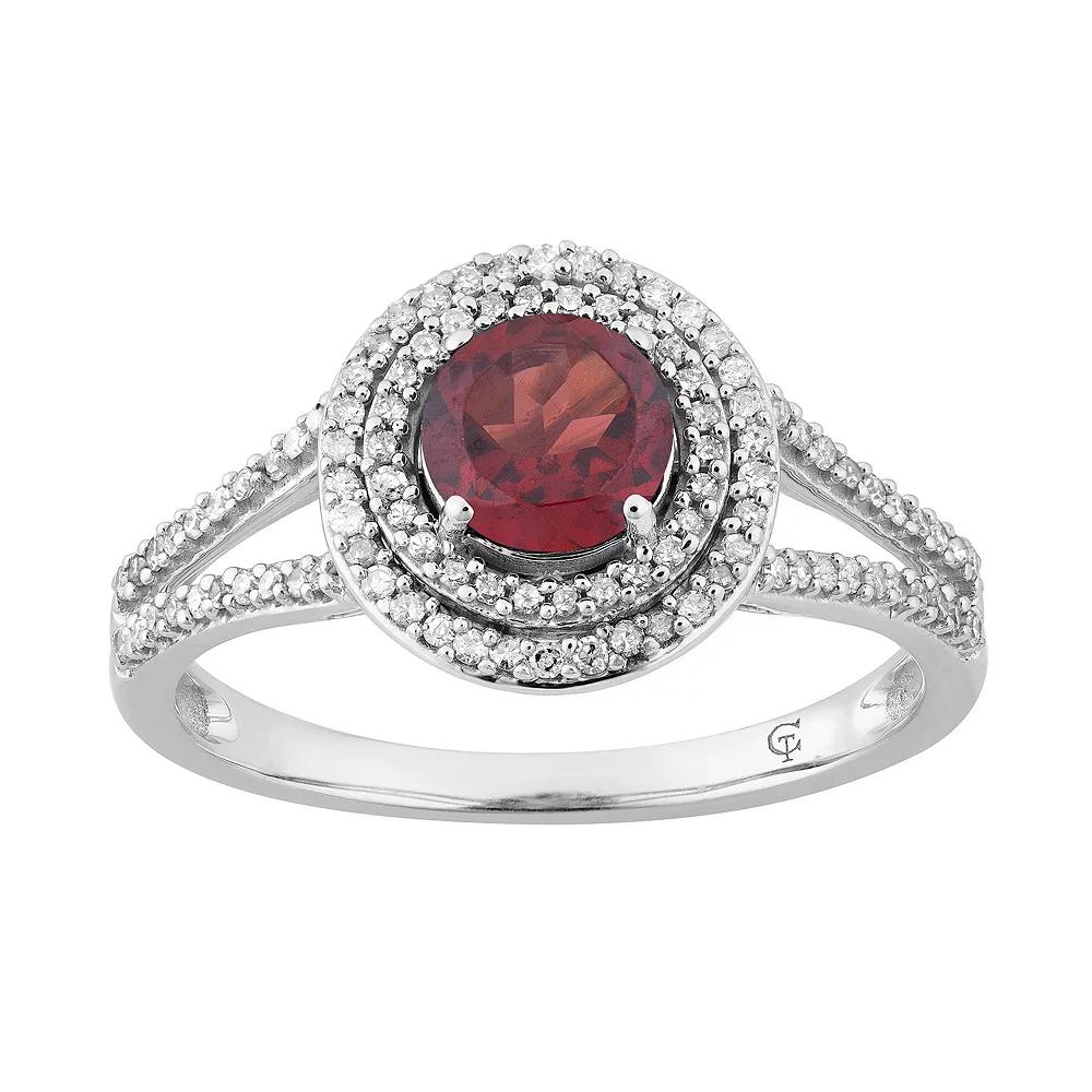 Crafted from 10k white gold, and beautifully adorned with a sparkling garnet center stone, this stunning double halo ring is simply beautiful.RING DETAILSWidth: 11.60 mmMetal: 10k white goldPlating: rhodiumFinish: polishedPackaging: boxedSTONE DETAILSStone type: garnetTotal weight: 9/10 ct.Center stone size: 6 mm x 4 mmShape: roundSetting: prongDIAMOND DETAILSTotal weight: 1/3 ct.Color grade: I-JClarity: I2-I3Shape: roundSetting: prongGemstones may have been treated to enhance their appearance. Special care may be required. Please visit our Gemstone Treatment & Special Care Guide for more information. Image(s) may be enlarged to show detail.Diamond weights are approximate. Diamond total weights may vary between .01 and .08 ct. Some diamonds have fewer than 17 facets. Gender: female. Age Group: adult.