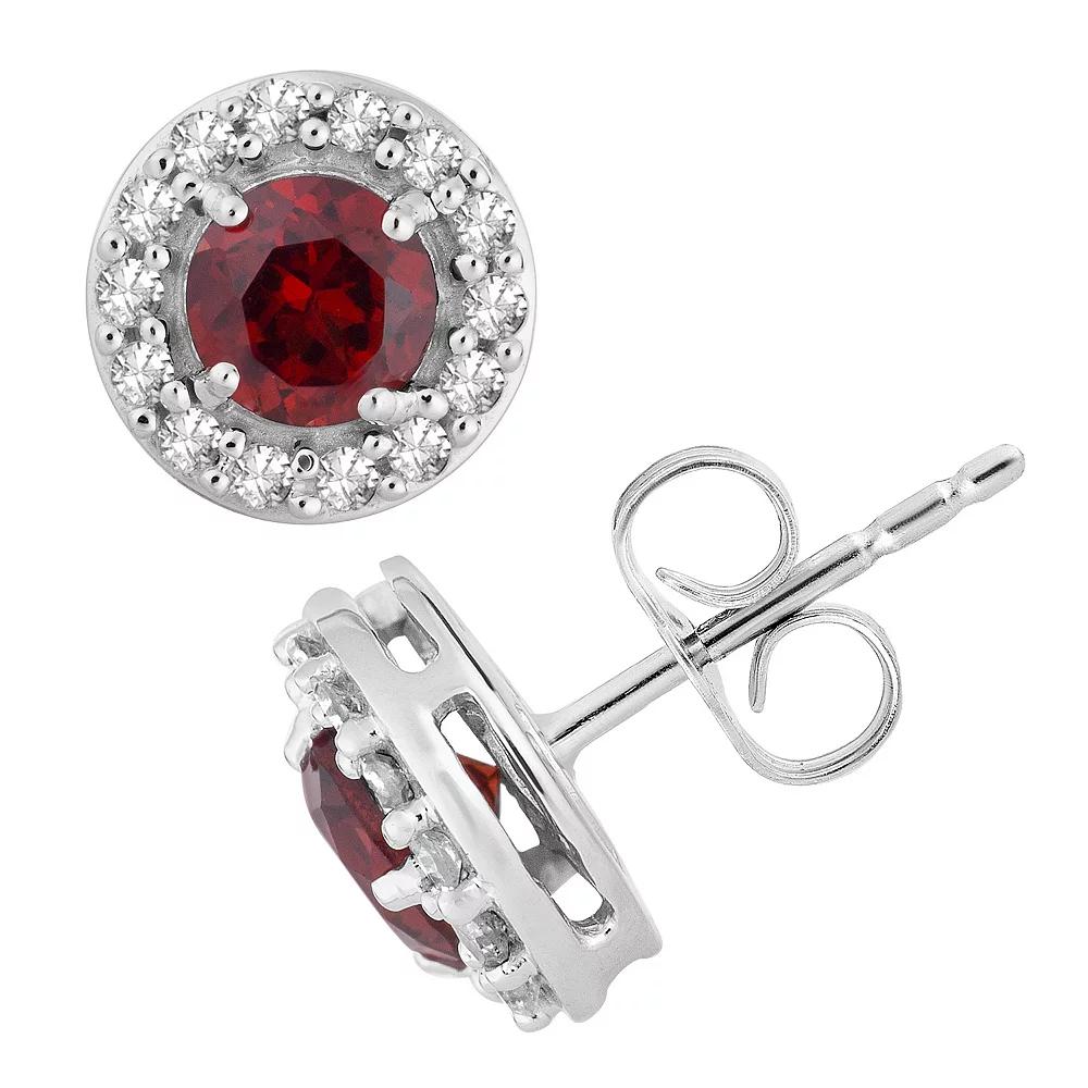 Decorated with round-cut garnets and a halo of scintillating diamonds, these 10k white gold earrings lend a touch of elegance to your ensembles.EARRING DETAILSLength: 7.15 mmBackings: postMetal: 10k white goldFinish: polishedPackaging: boxedSTONE DETAILSStone type: garnetTotal weight: 5/8 ct.Center stone size: 4 mmShape: roundSetting: prongDIAMOND DETAILSTotal weight: 1/6 ct.Color grade: I-JClarity: I2-I3Shape: roundSetting: prongGemstones may have been treated to enhance their appearance. Special care may be required. Please visit our Gemstone Treatment & Special Care Guide for more information. Image(s) may be enlarged to show detail.Diamond weights are approximate. Diamond total weights may vary between .01 and .08 ct. Some diamonds have fewer than 17 facets. Size: 18". Gender: female. Age Group: adult.