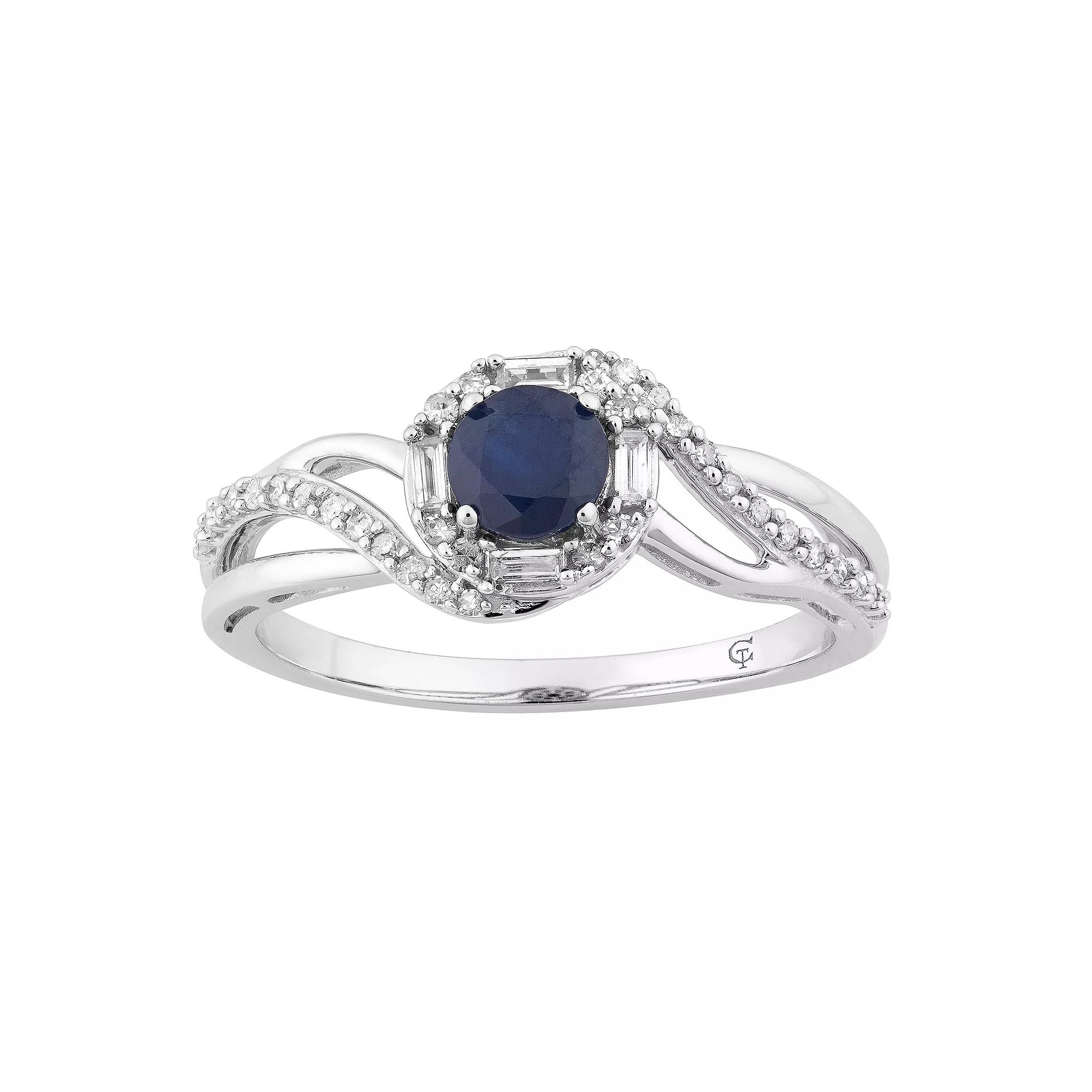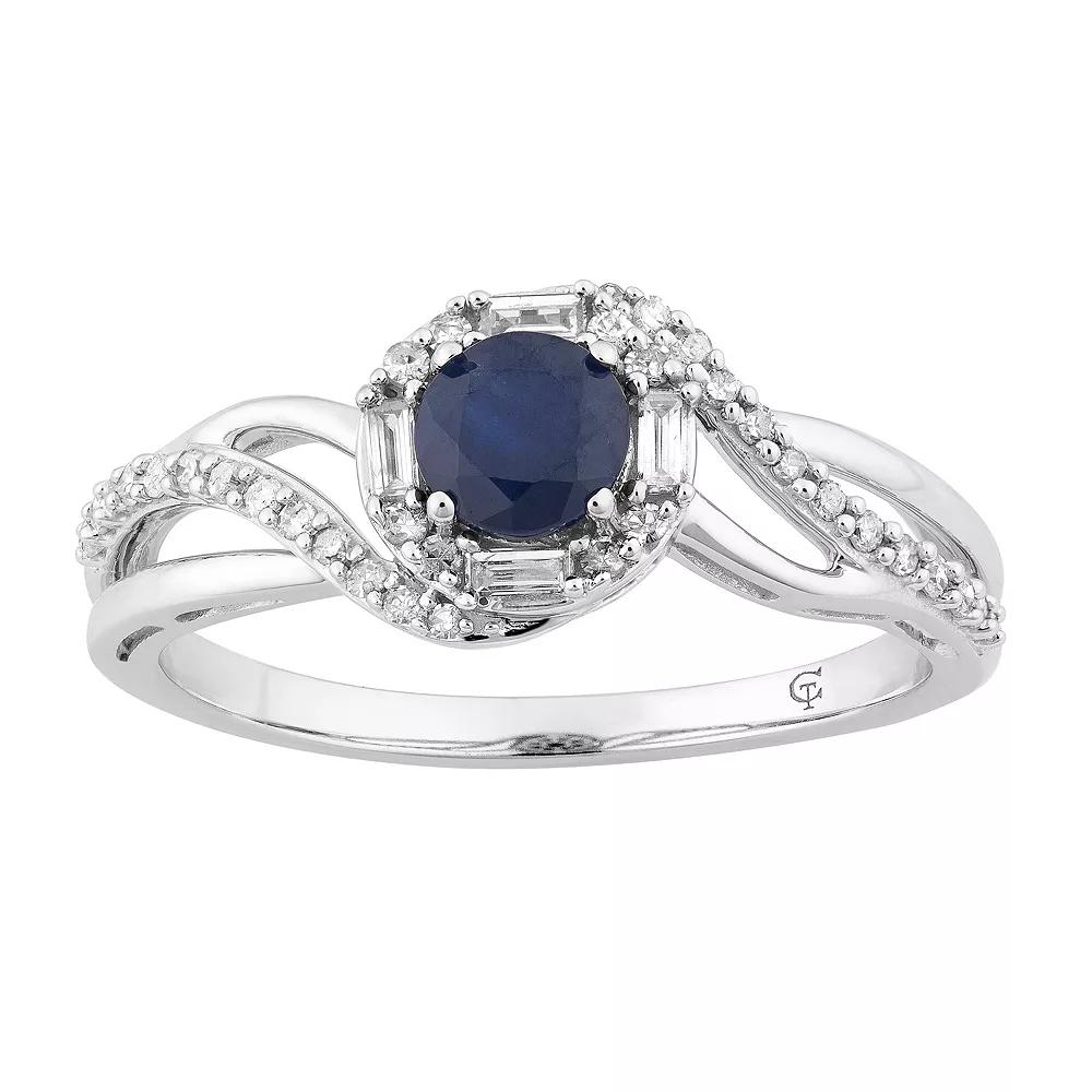 Complete your elegant look with this 10k white gold swirl ring. Adorned with a round-cut sapphire center stone, and a swirl of diamonds, it's a fashionable finishing touch to your outfits. RING DETAILSWidth: 9.20 mmMetal: 10k white goldPlating: rhodiumFinish: polishedPackaging: boxedSTONE DETAILSStone type: sapphireTotal weight: 3/4 ct.Center stone size: 6 mm x 4 mmShape: roundSetting: prongDIAMOND DETAILSTotal weight: 1/4 ct.Color grade: I-JClarity: I2-I3Shape: round, baguetteSetting: prongGemstones may have been treated to enhance their appearance. Special care may be required. Please visit our Gemstone Treatment & Special Care Guide for more information. Image(s) may be enlarged to show detail.Diamond weights are approximate. Diamond total weights may vary between .01 and .08 ct. Some diamonds have fewer than 17 facets. Color: Blue. Gender: female. Age Group: adult.