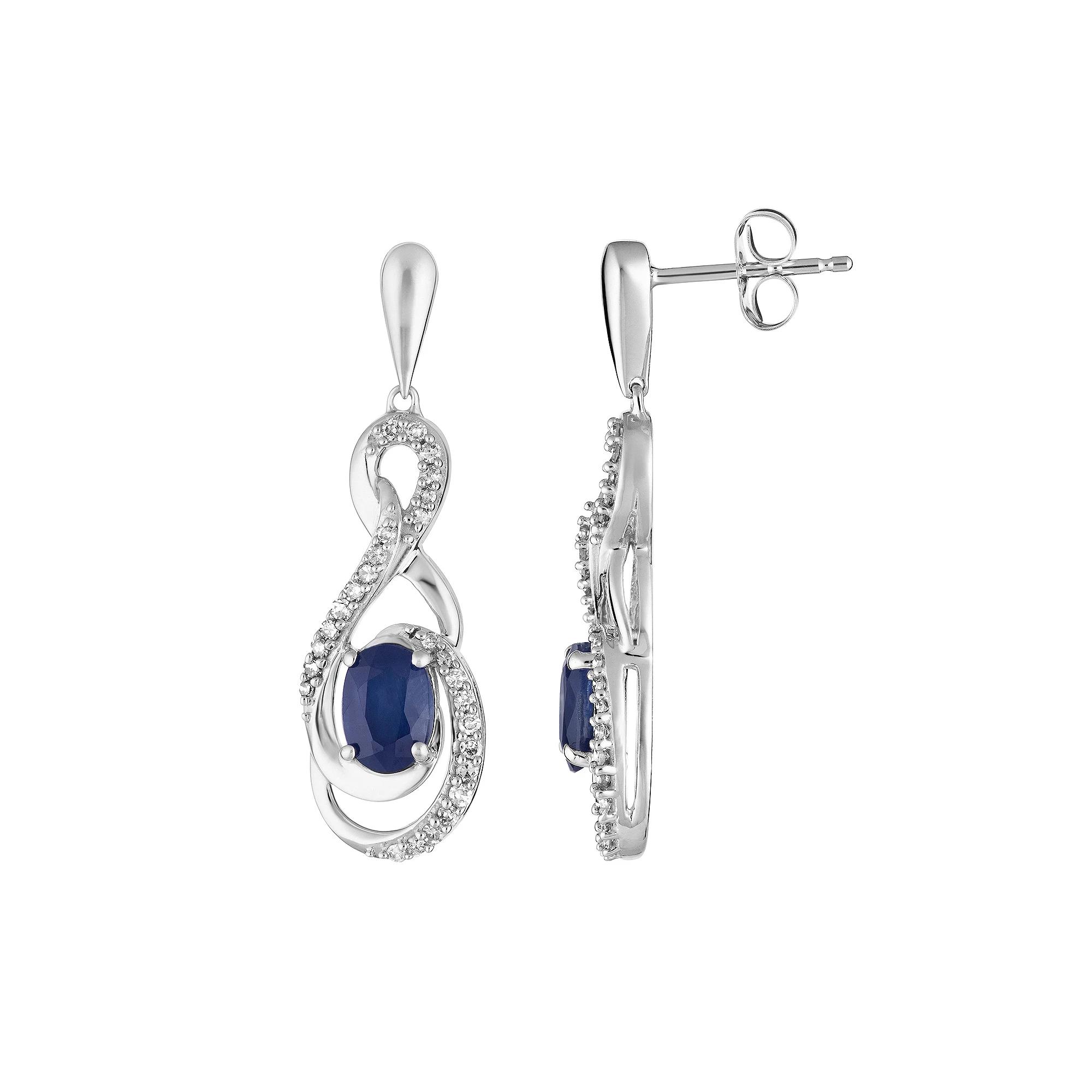Sleek and sophisticated, these 10k white gold sapphire and diamond earrings lend a touch of elegance to your look.EARRING DETAILSLength: 27.20 mmBackings: postMetal: 10k white goldFinish: polishedPackaging: boxedSTONE DETAILSStone type: sapphire Total weight: 1 ct.Center stone size: 6 mm x 4 mmShape: ovalSetting: prongDIAMOND DETAILSTotal weight: 1/5 ct.Color grade: I-JClarity: I2-I3Shape: roundSetting: prongGemstones may have been treated to enhance their appearance. Special care may be required. Please visit our Gemstone Treatment & Special Care Guide for more information. Image(s) may be enlarged to show detail.Diamond weights are approximate. Diamond total weights may vary between .01 and .08 ct. Some diamonds have fewer than 17 facets.Not appropriate for children 14 years old and younger. Color: Blue. Gender: female. Age Group: adult.