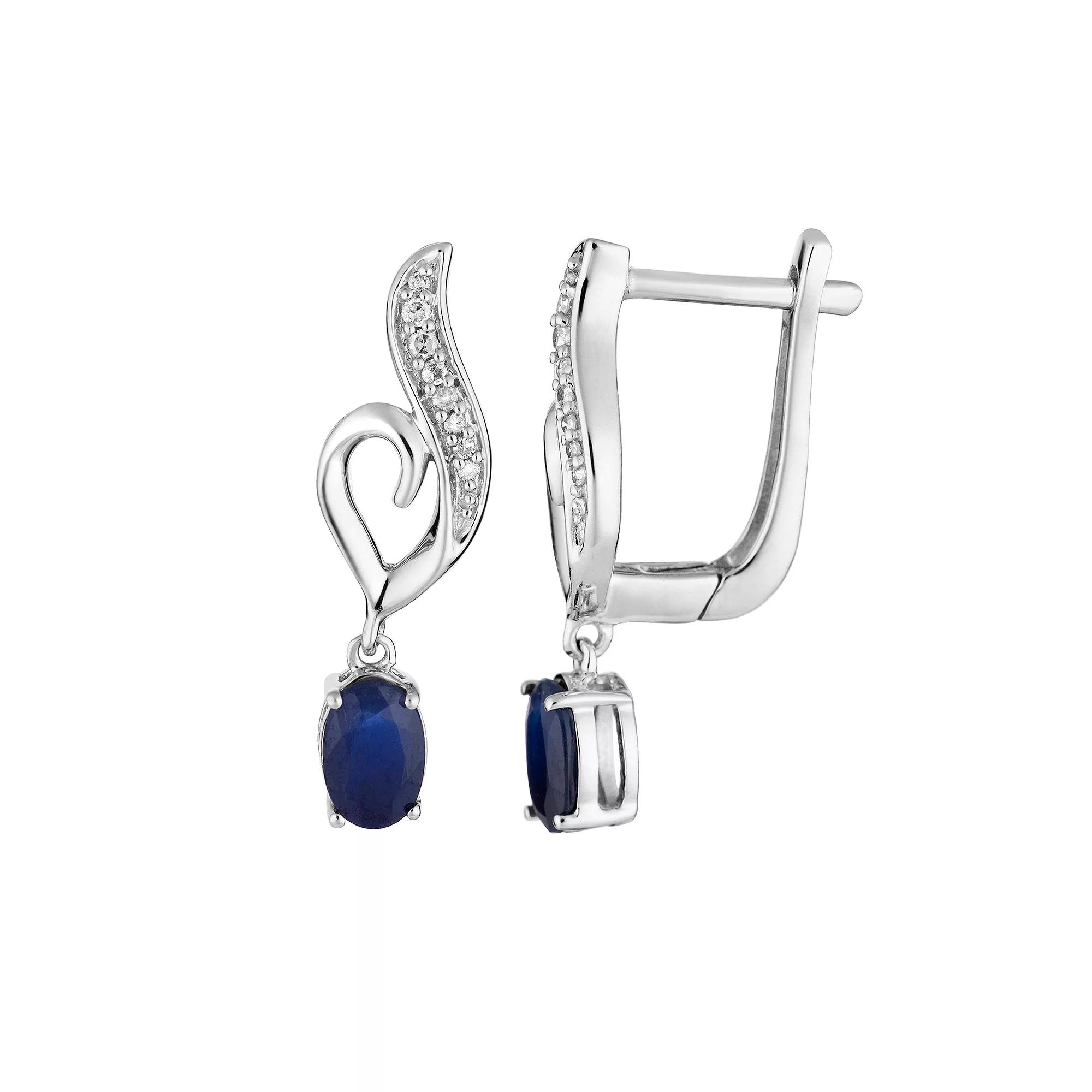 Add a lovely touch of color to your ensembles whenever you wear these 10k white gold sapphire and diamond heart earrings.EARRING DETAILS Length: 22.70 mm Backings: latch back Metal: 10k white gold Finish: polished Packaging: boxed STONE DETAILS Stone type: sapphire Total weight: 1 ct. Center stone size: 6 mm x 4 mm Shape: oval Setting: prong DIAMOND DETAILS Total weight: less than 1/10 ct. Color grade: I-J Clarity: I2-I3 Shape: round Setting: prong Gemstones may have been treated to enhance their appearance. Special care may be required. Please visit our Gemstone Treatment & Special Care Guide for more information.Image(s) may be enlarged to show detail.Diamond weights are approximate. Diamond total weights may vary between .01 and .08 ct. Some diamonds have fewer than 17 facets. Color: Blue. Gender: female. Age Group: adult.