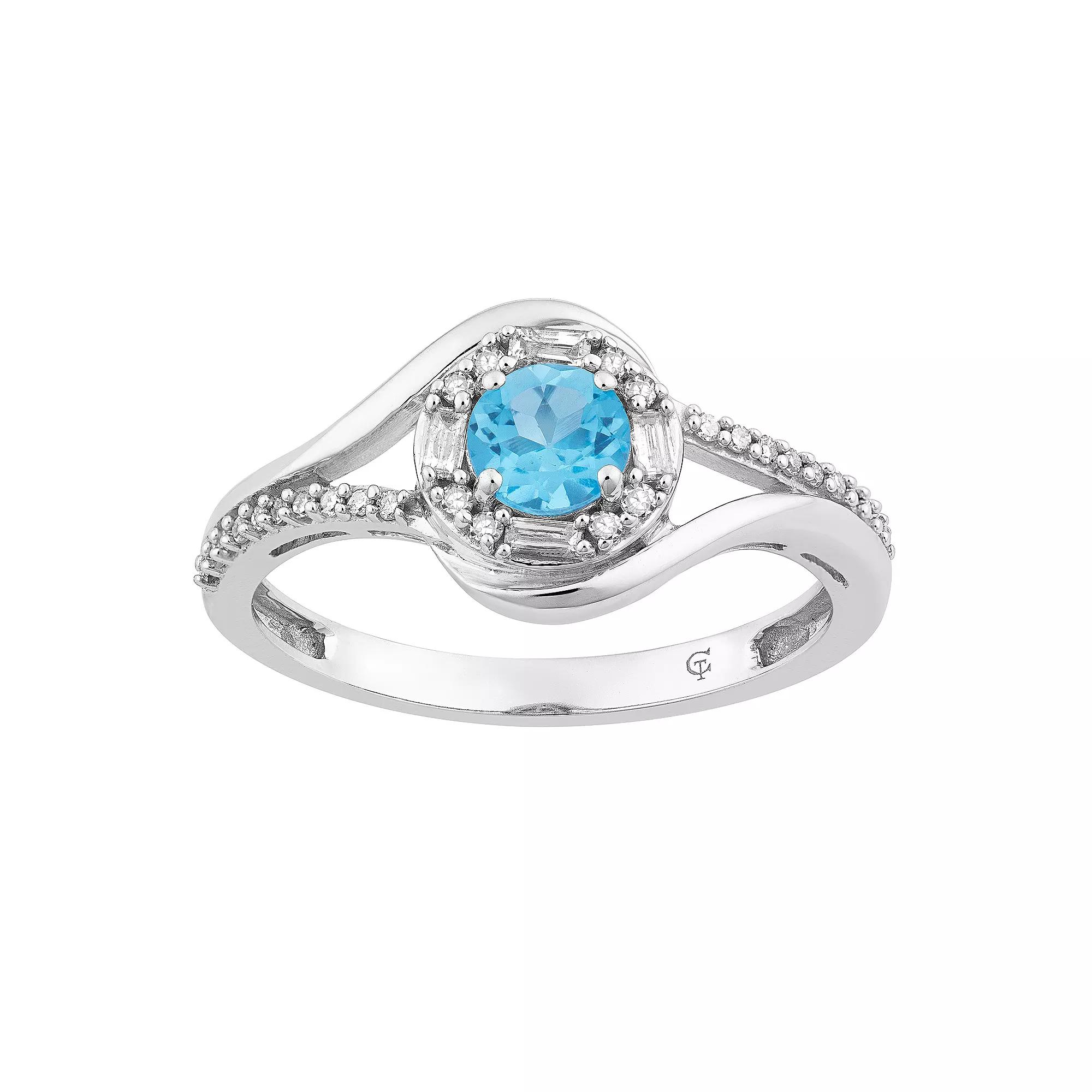Take your look to new heights with this elegant 10k white gold halo ring. It features a genuine Swiss blue topaz center stone accented with round- and baguette-cut diamonds set within a distinctive swirl band. RING DETAILSWidth: 10.70 mmMetal: 10k white goldPlating: rhodiumFinish: polishedPackaging: boxedSTONE DETAILSStone type: Swiss blue topazTotal weight: 5/8 ct.Center stone size: 6 mm x 4 mmShape: roundSetting: prongDIAMOND DETAILSTotal weight: 1/5 ct.Color grade: I-JClarity: I2-I3Shape: round, baguetteSetting: prongGemstones may have been treated to enhance their appearance. Special care may be required. Please visit our Gemstone Treatment & Special Care Guide for more information. Image(s) may be enlarged to show detail.Diamond weights are approximate. Diamond total weights may vary between .01 and .08 ct. Some diamonds have fewer than 17 facets. Gender: female. Age Group: adult.