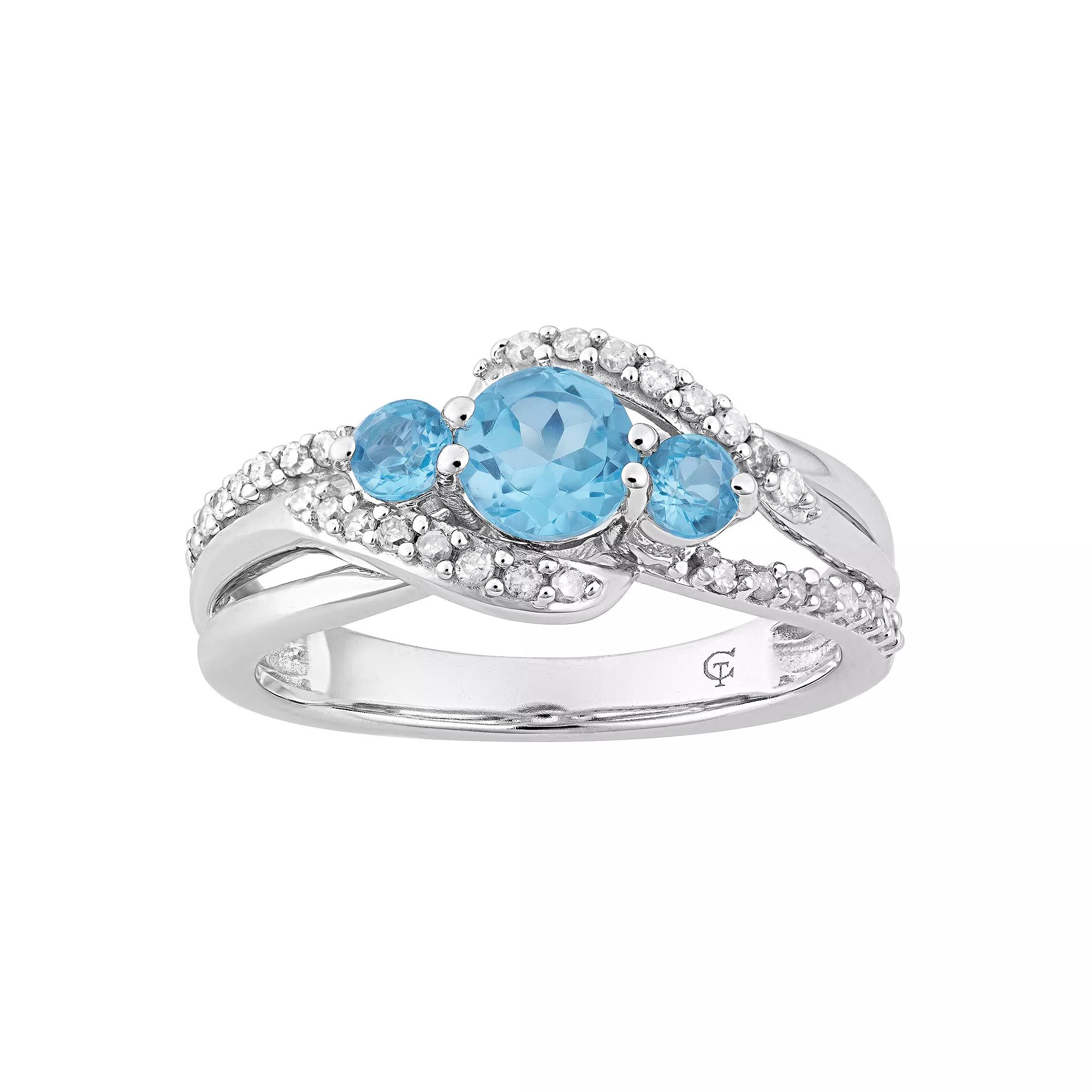 A trio of genuine Swiss blue topaz and diamond accents beautifully adorn this 10k white gold ring, making it a elegant complement to your attire.RING DETAILSWidth: 9.30 mmMetal: 10k white goldPlating: rhodiumFinish: polishedPackaging: boxedSTONE DETAILSStone type: Swiss blue topazTotal weight: 1/8 ct.Center stone size: 6 mm x 4 mmShape: roundSetting: prongDIAMOND DETAILSTotal weight: less than 1/10 ct.Color grade: I-JClarity: I2-I3Shape: roundSetting: prongGemstones may have been treated to enhance their appearance. Special care may be required. Please visit our Gemstone Treatment & Special Care Guide for more information. Image(s) may be enlarged to show detail.Diamond weights are approximate. Diamond total weights may vary between .01 and .08 ct. Some diamonds have fewer than 17 facets. Gender: female. Age Group: adult.