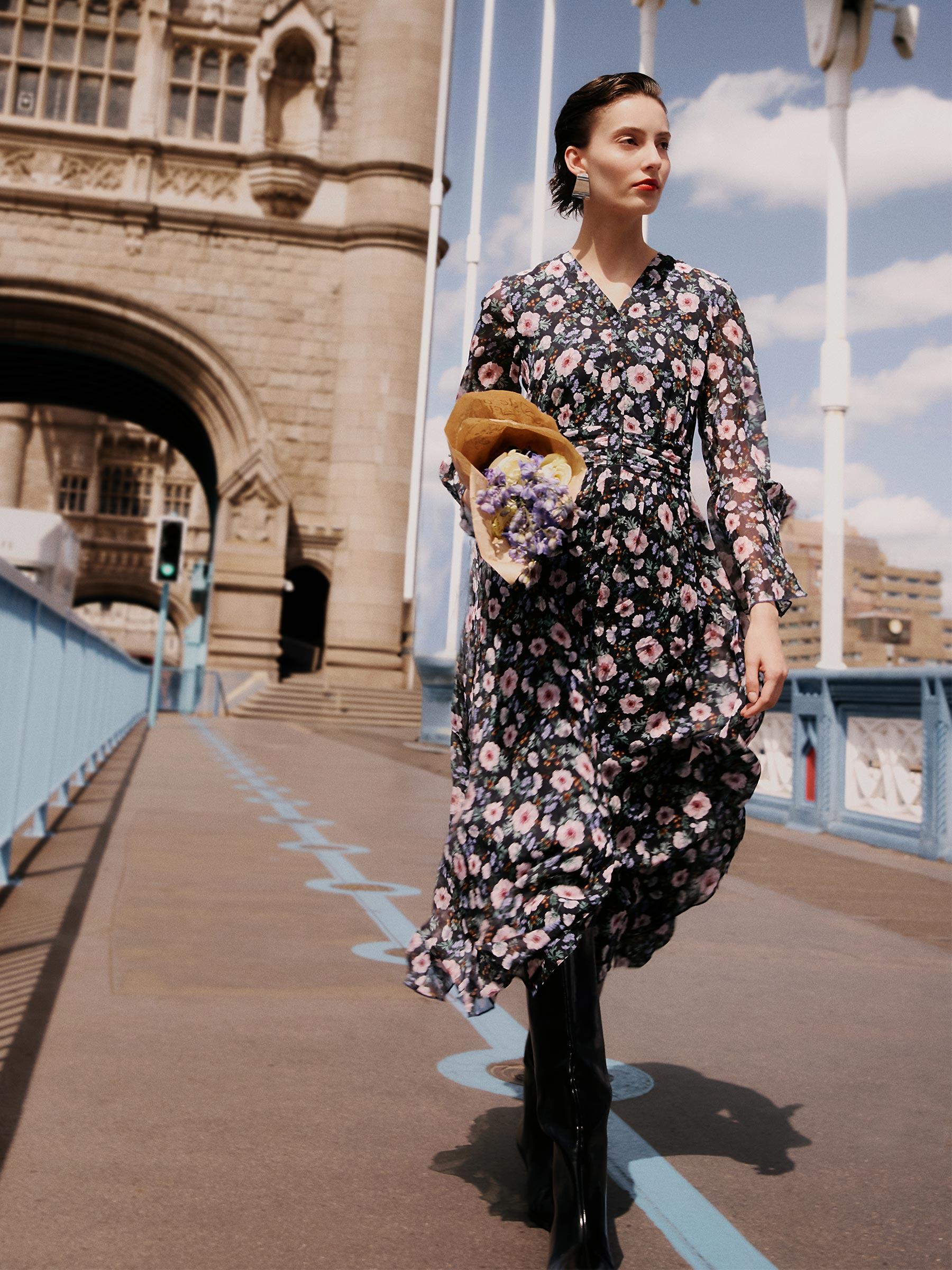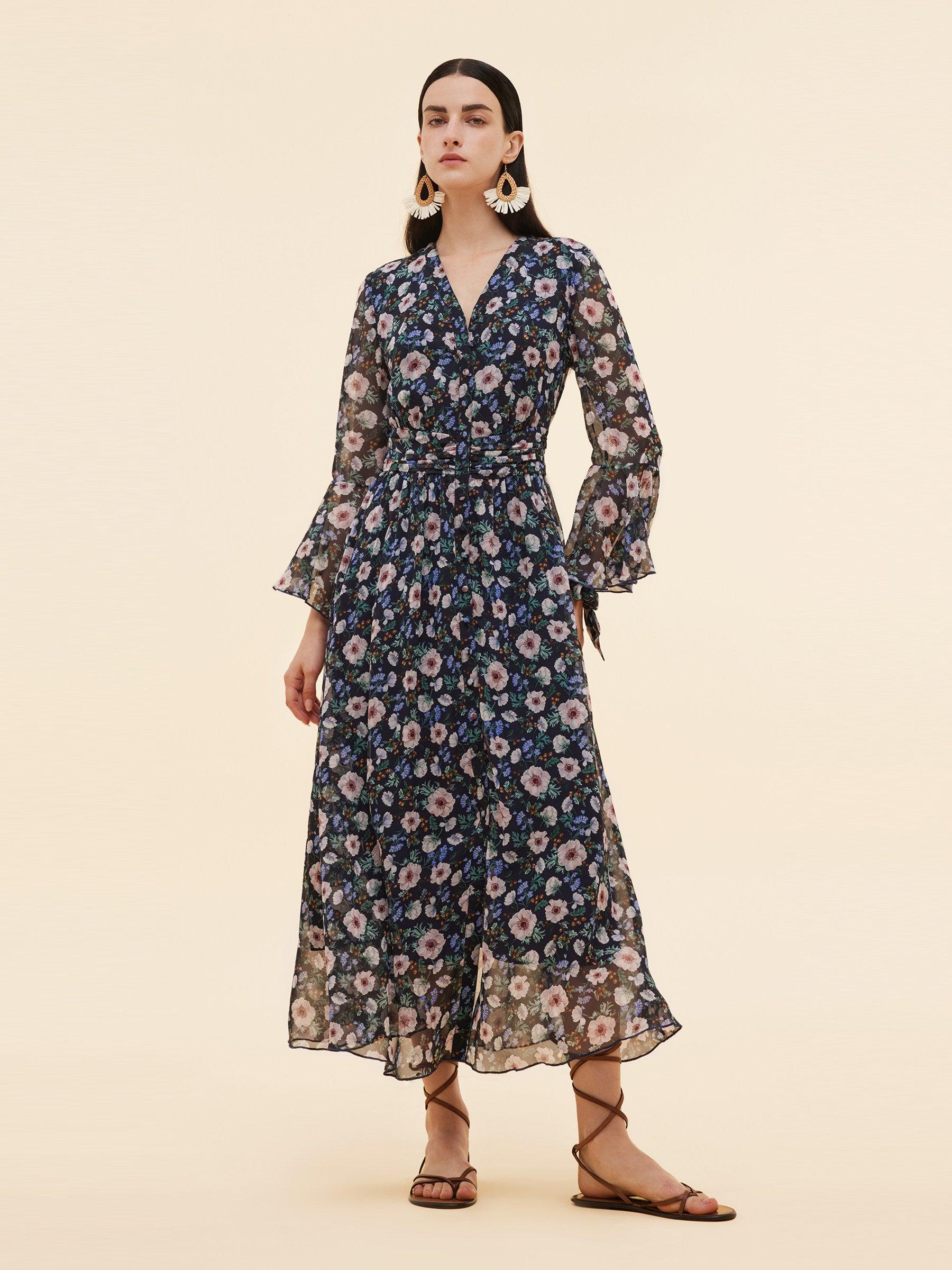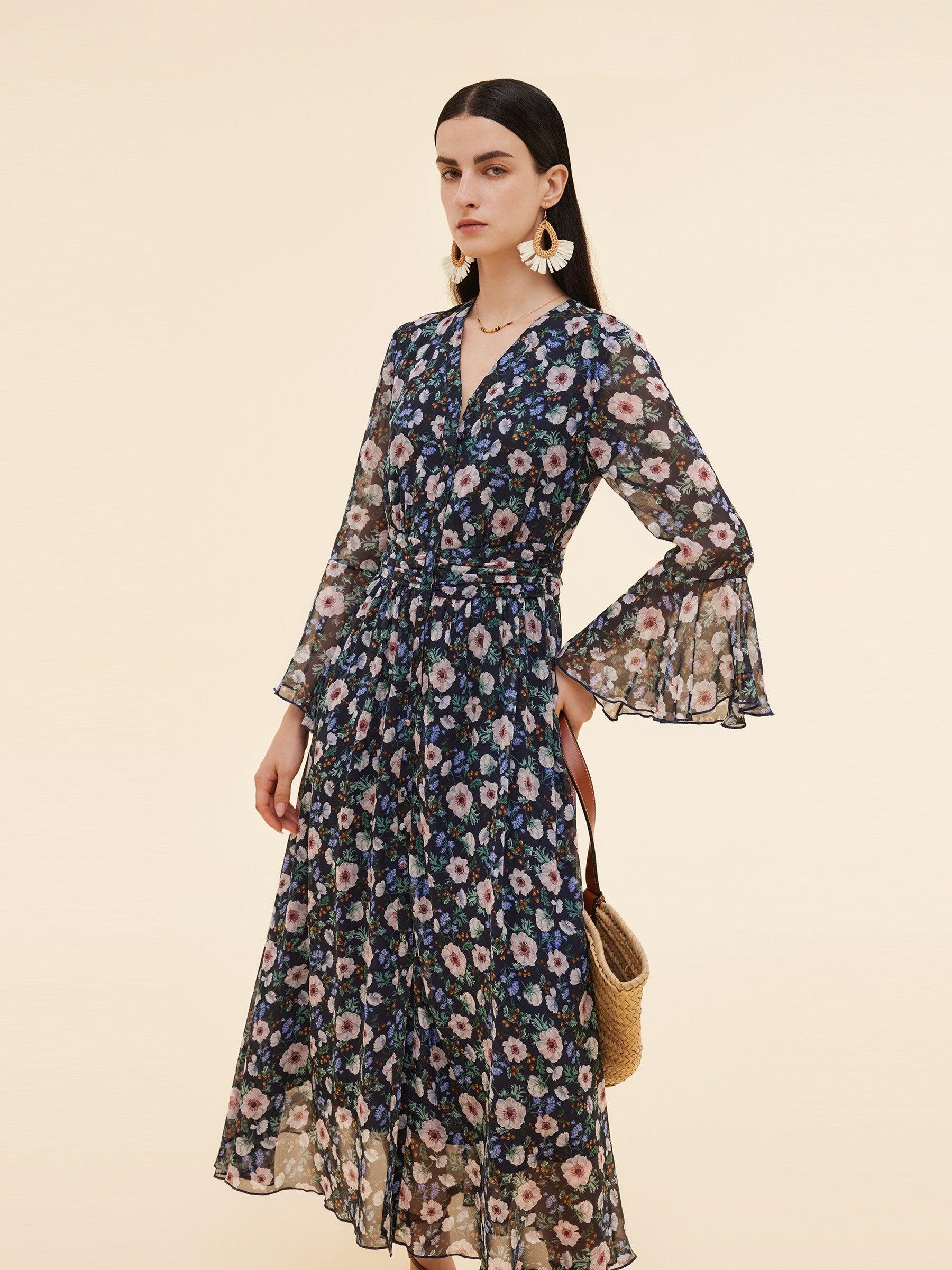 -10MM Mulberry Silk -With scrunchie -Ruffle cuffs Rendered in British-inspired navy floral print, this 10MM Mulberry Silk dress is soft, airy, and weightless—perfect for warm weather. A cinched waist and flared hem flatter the figure and elongate the legs. Thoughtful details include ruched waist shaping, functional but