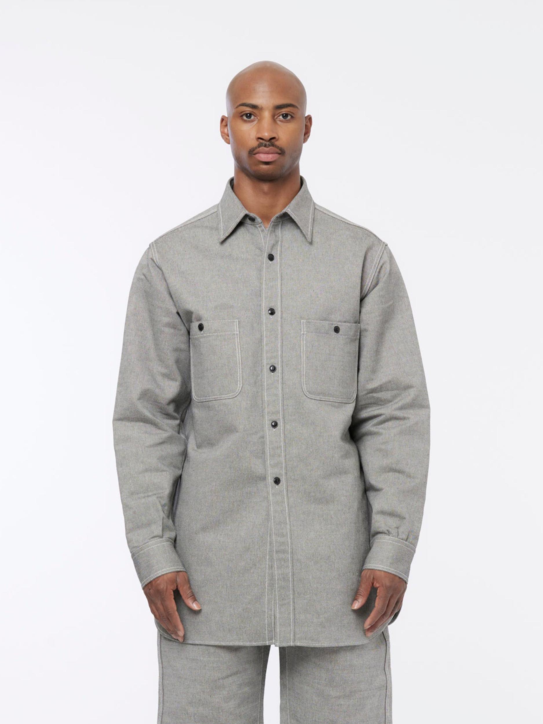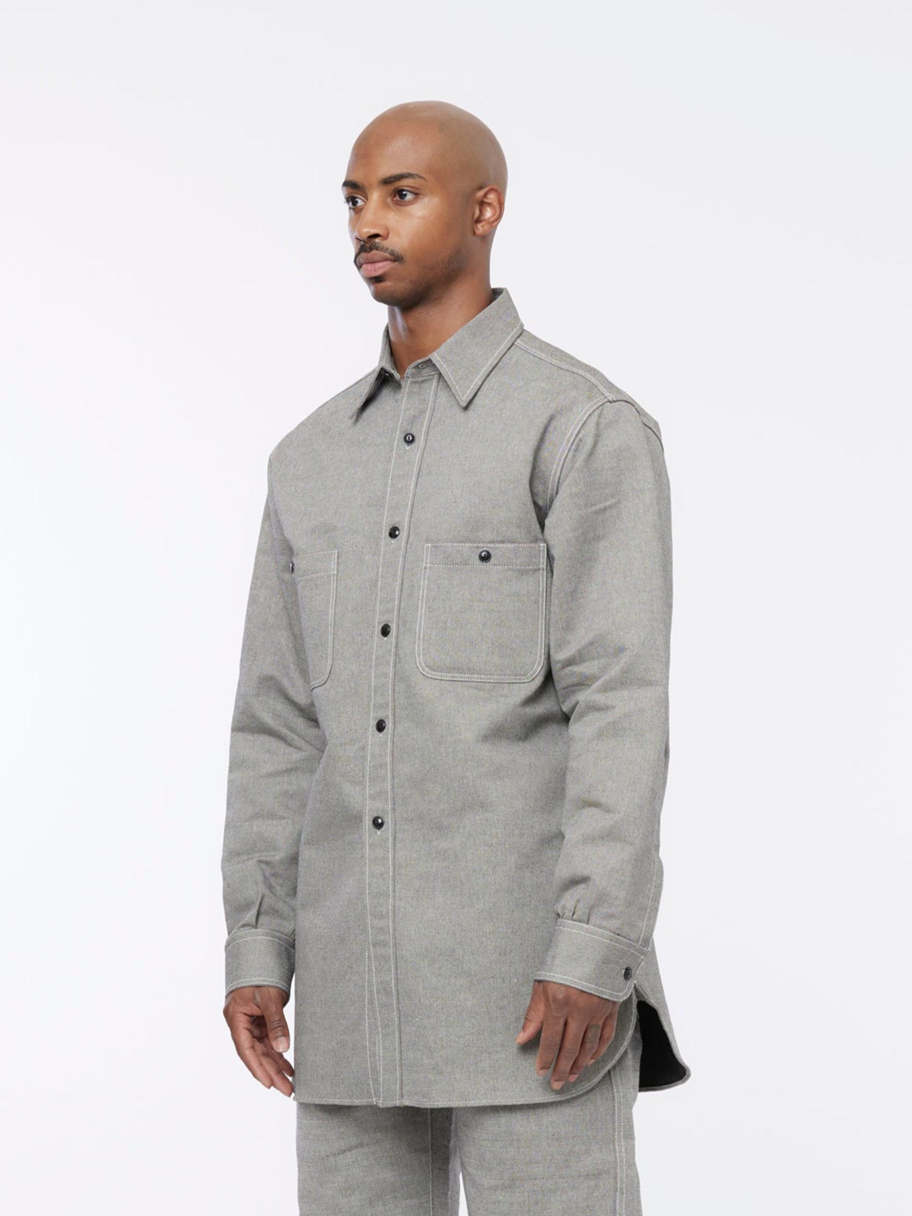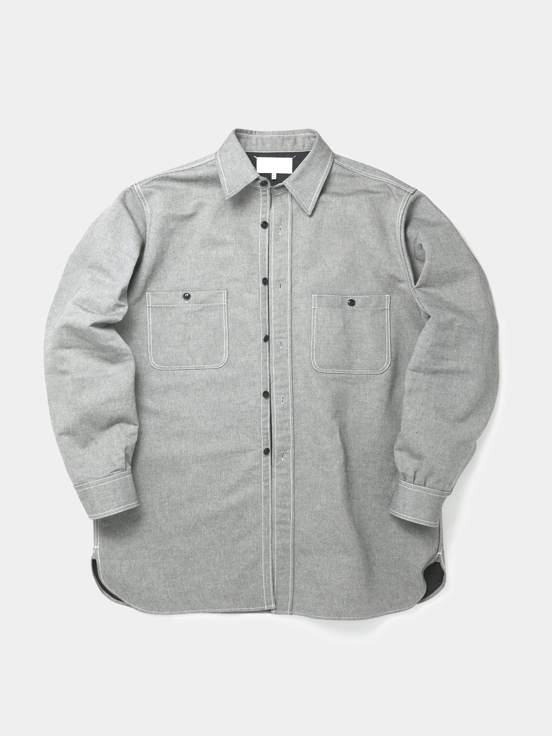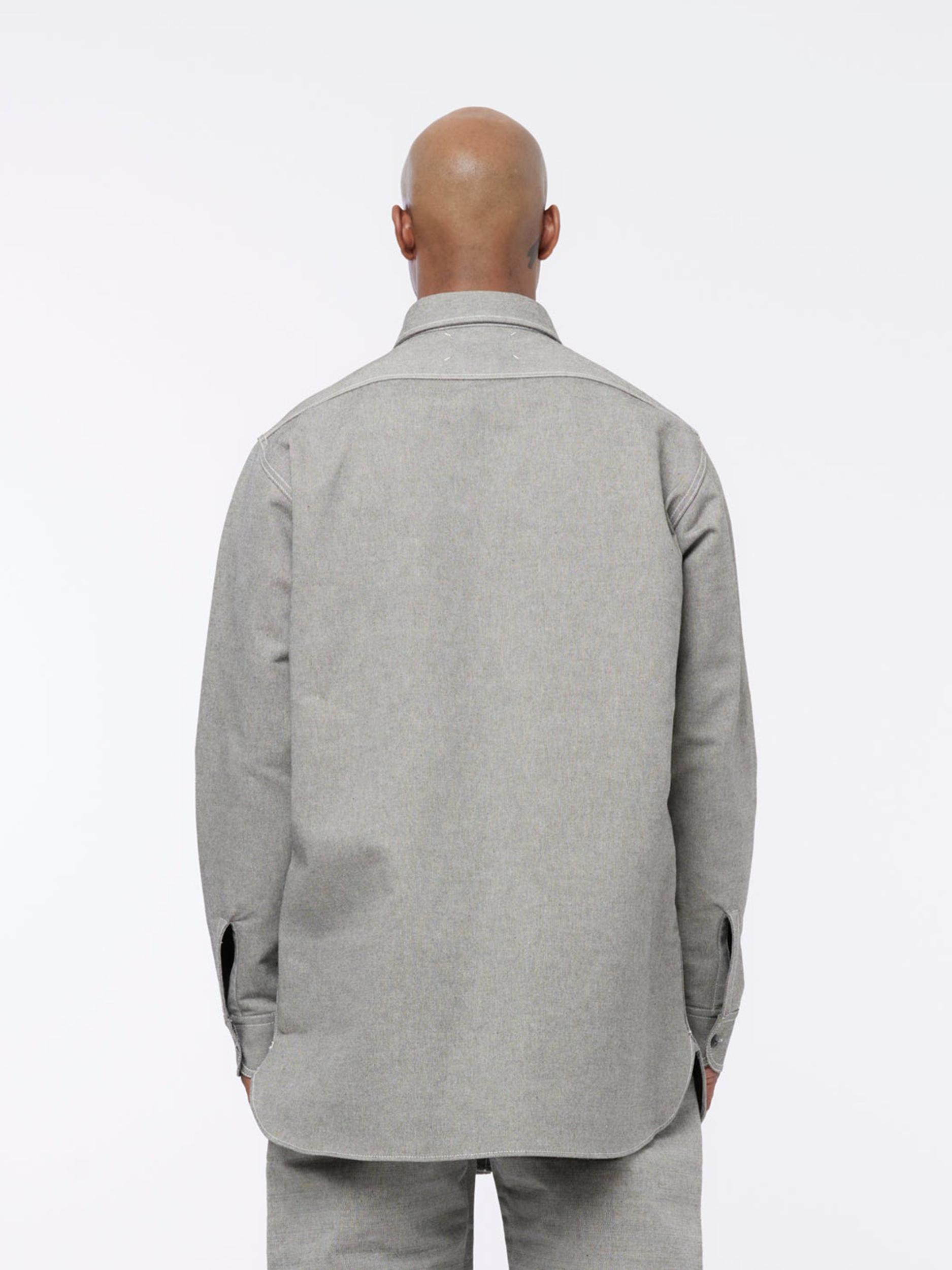 In broken twill, this Maison Margiela button-up shirt features contrasting interior, left chest pocket, and elongated length. Maison Margiela’s signature Four stitches appear at the back; the opposite of a label. Model is 6'0 wearing size 42