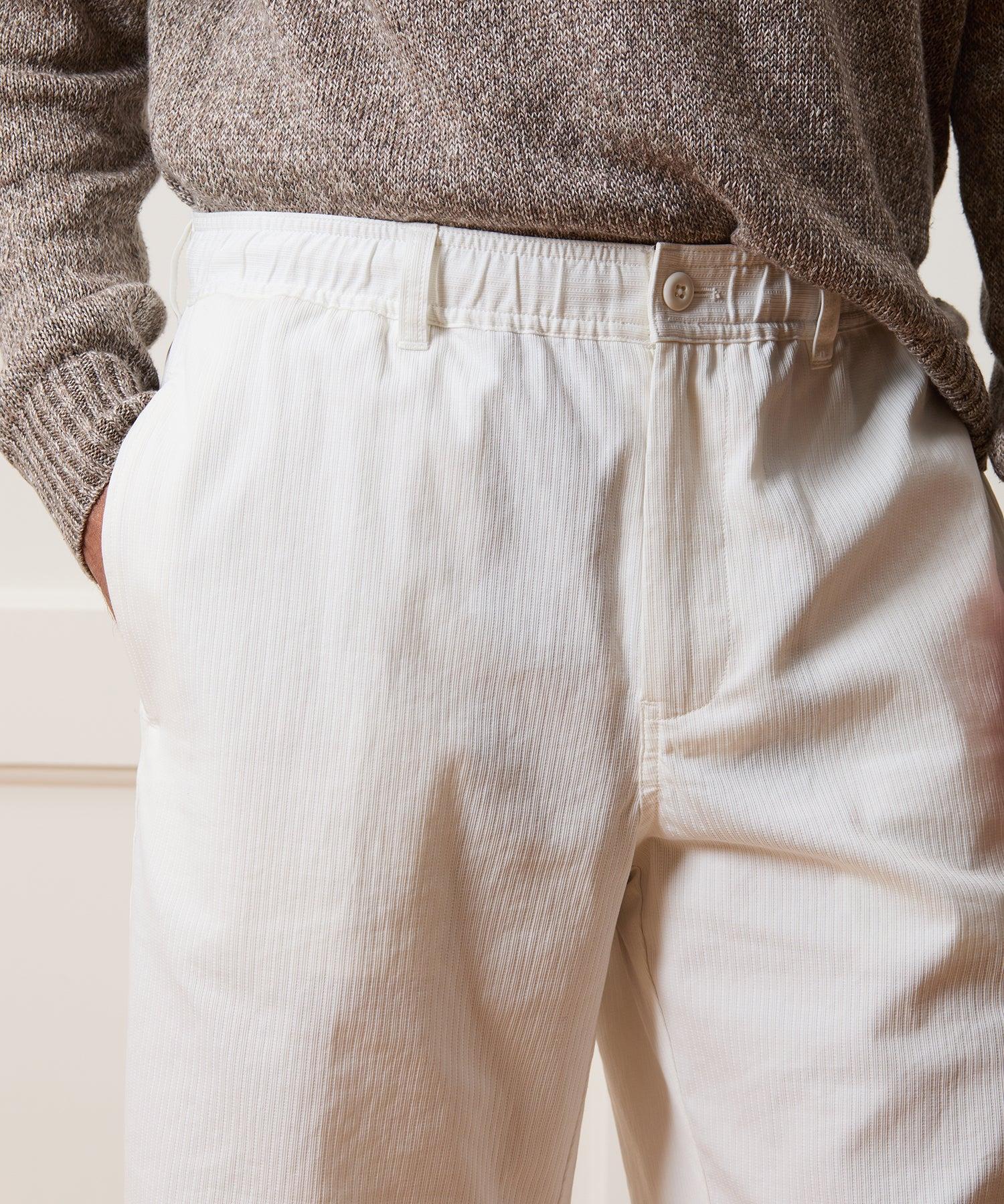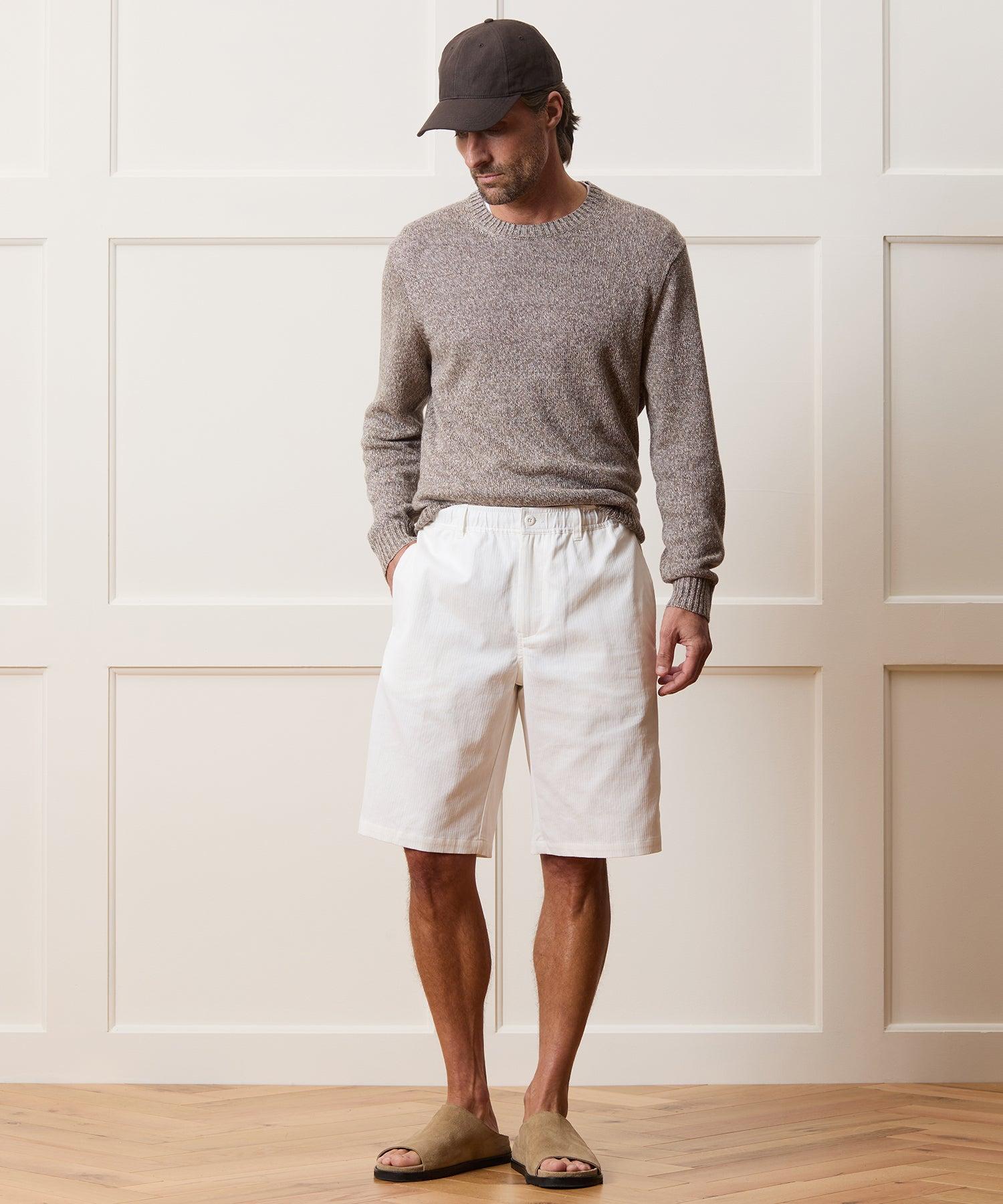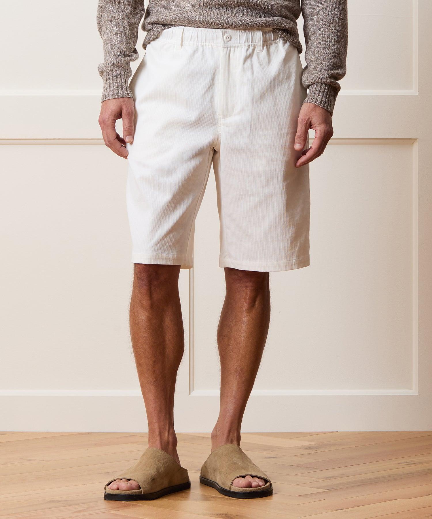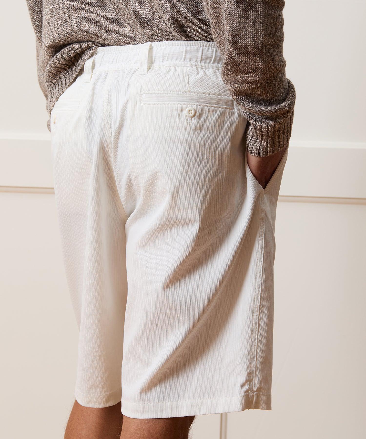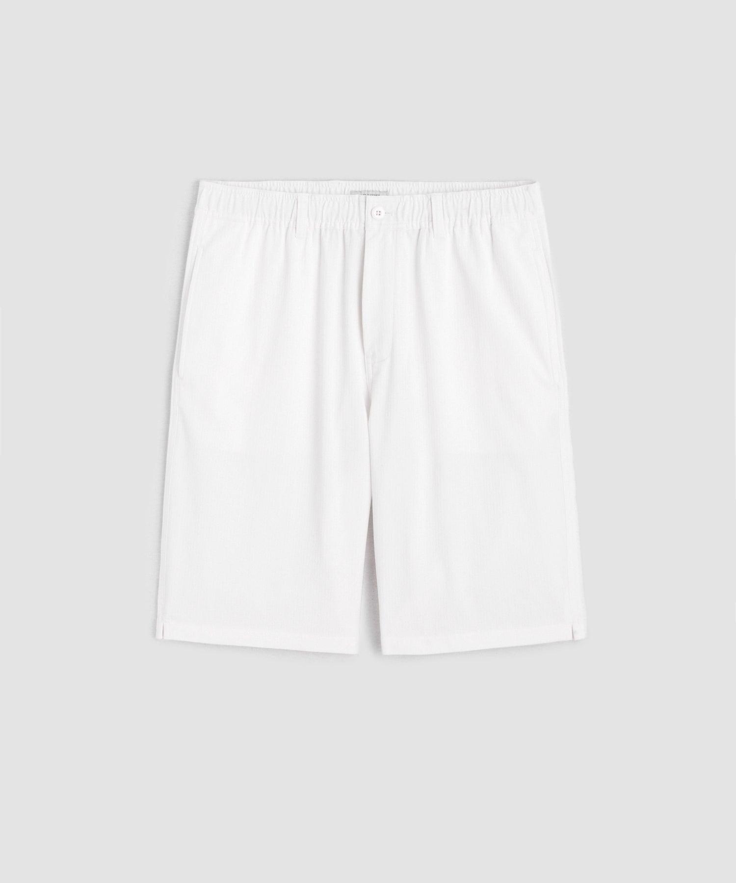 These easy-wearing shorts have a vintage vibe thanks to a full, relaxed fit and lengthy, 11” inseam, designed to hit right around the knee. On the one hand, it has a comfortable elastic waist and interior drawcord — on the other, it has belt loops and a true zip-up fly, for a more tailored look. Crafted from cool, soft Italian cotton in white with a jacquard stripe and cut with a long 11” inseam, this short has a chic look that works well styled with everything from a tee and sneakers to a button-down and espadrilles. 100% Cotton Relaxed Fit 11” Inseam 25” Leg Opening Elastic Waist Concealable Drawcord Belt Loops Side Seam Hand Pockets Button-Through Back Welt Pockets Fabric From Italy Machine wash cold with like colors, gentle cycle. Do not bleach. Do not tumble dry; lay flat to dry, low iron if needed. Style PA66R0465