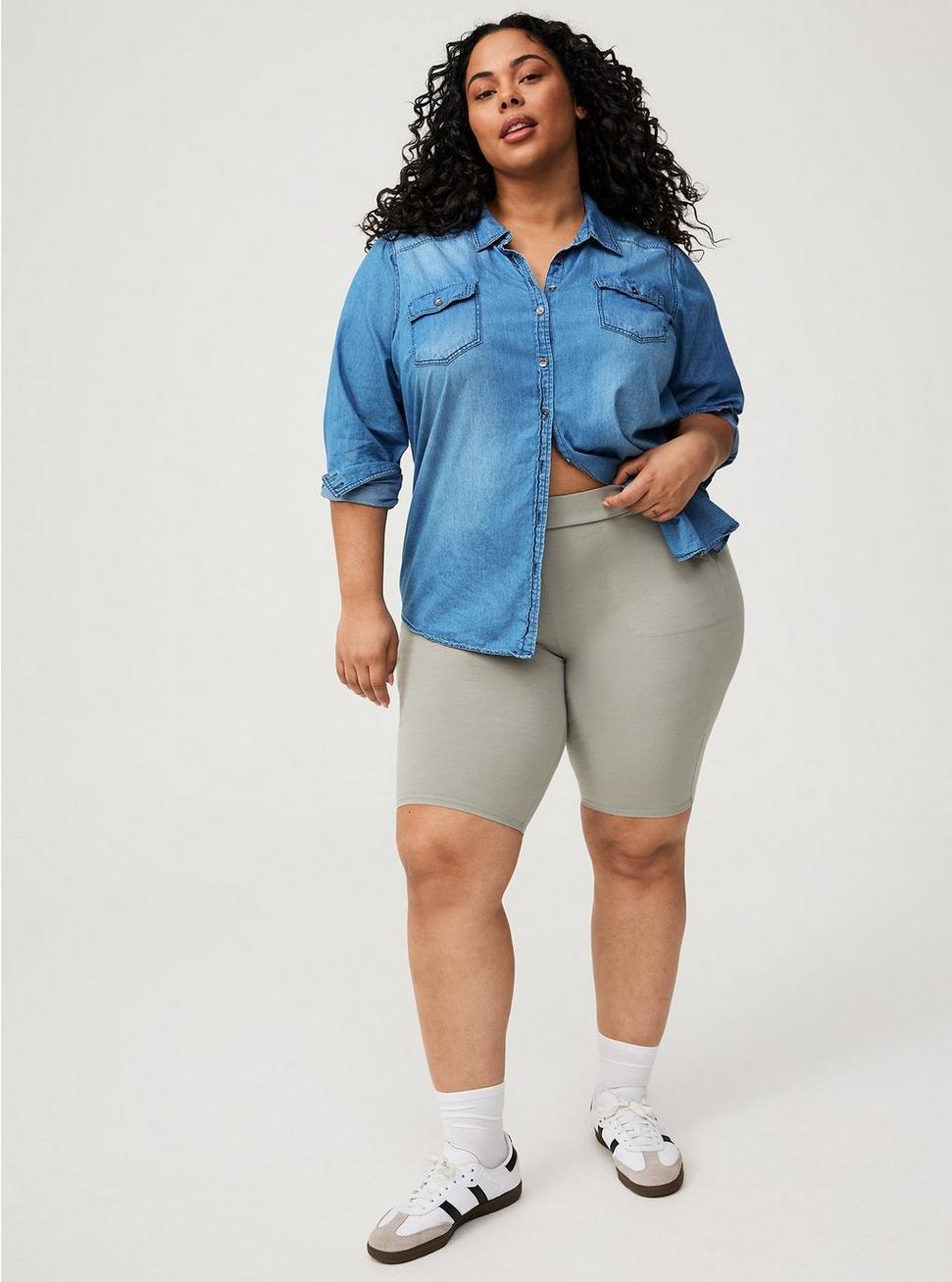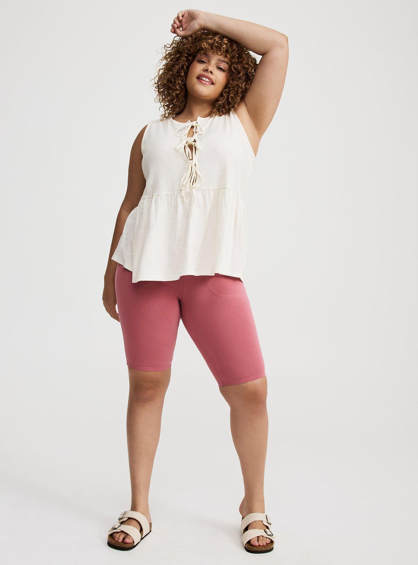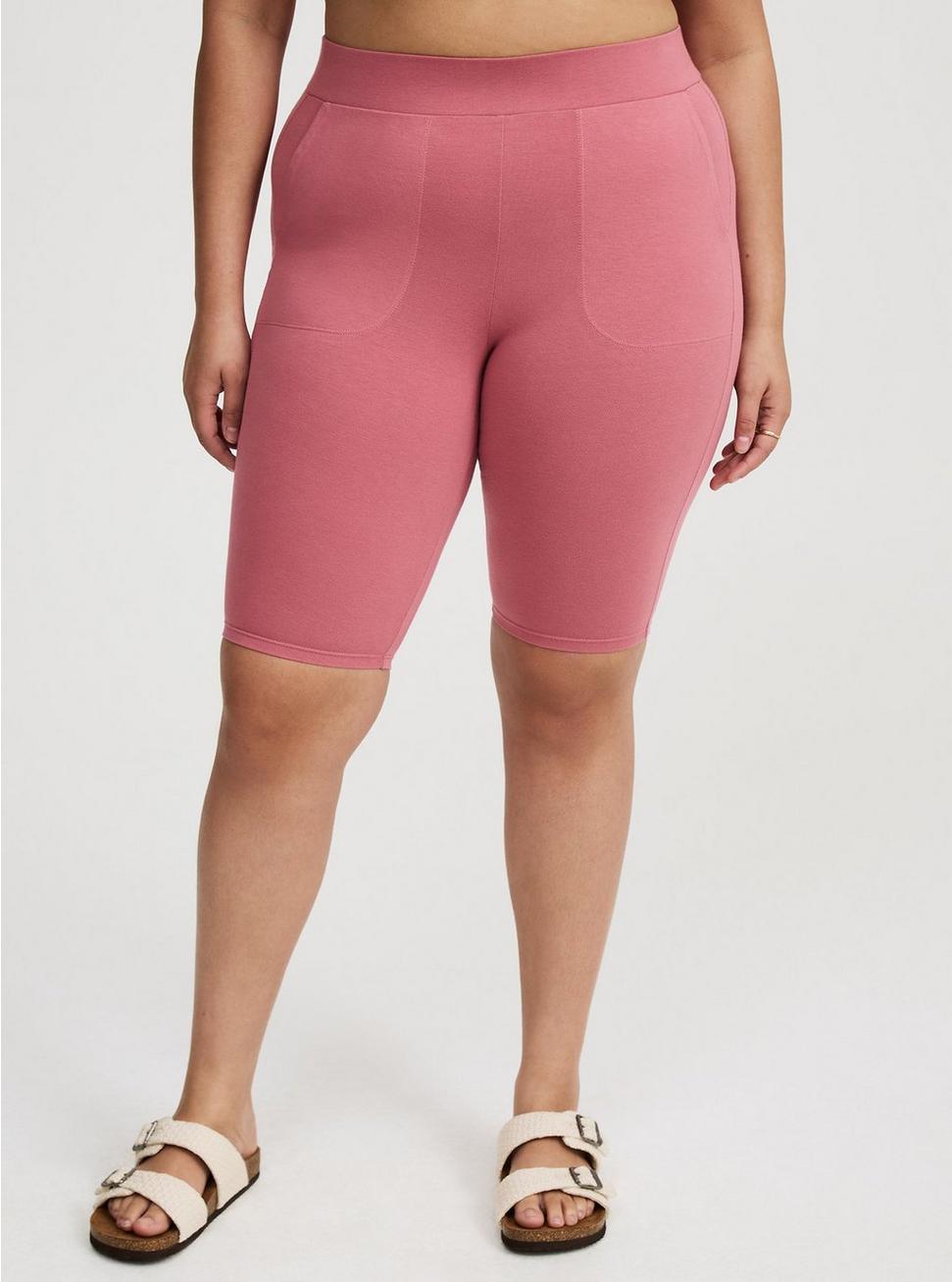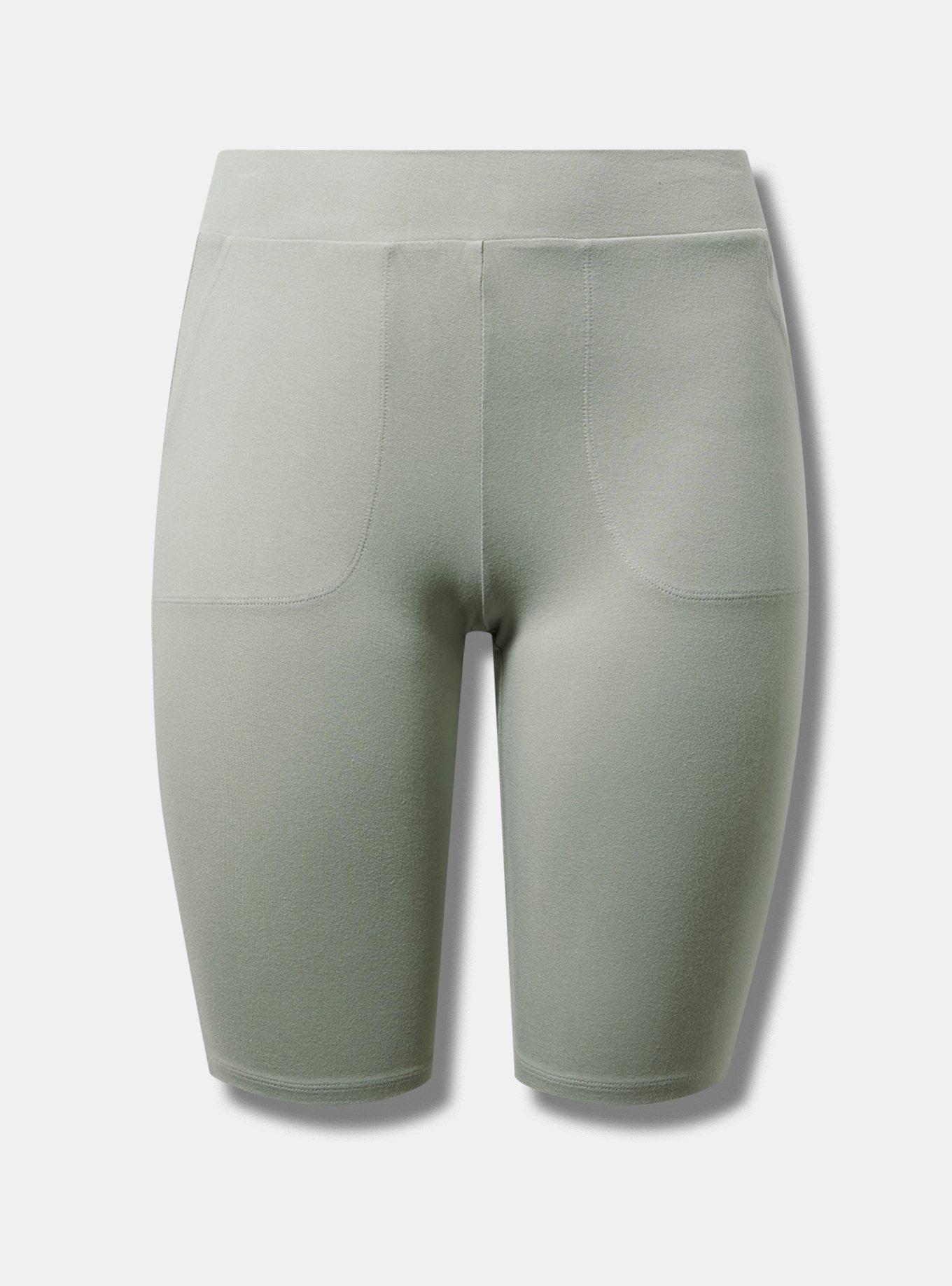 FITHigh rise.2'' Signature Waistband keeps things smooth and won't roll down.11'' inseam.MATERIALS + CAREThick cotton-blend fabric that smooths and flatters.4-way stretch with great recovery.95% cotton, 5% spandex.Machine wash cold. Dry low.Imported.DETAILSSeamless construction.Opaque (not see-through).Prevents leg chafing.Pocket detail. WHY WE LOVE ITWith the same incredible fit as our best-selling leggings, our bike shorts are perfect worn solo or under your fave dress or skirt to give you coverage and prevent chafing.