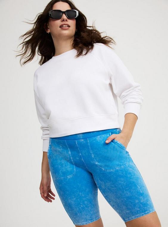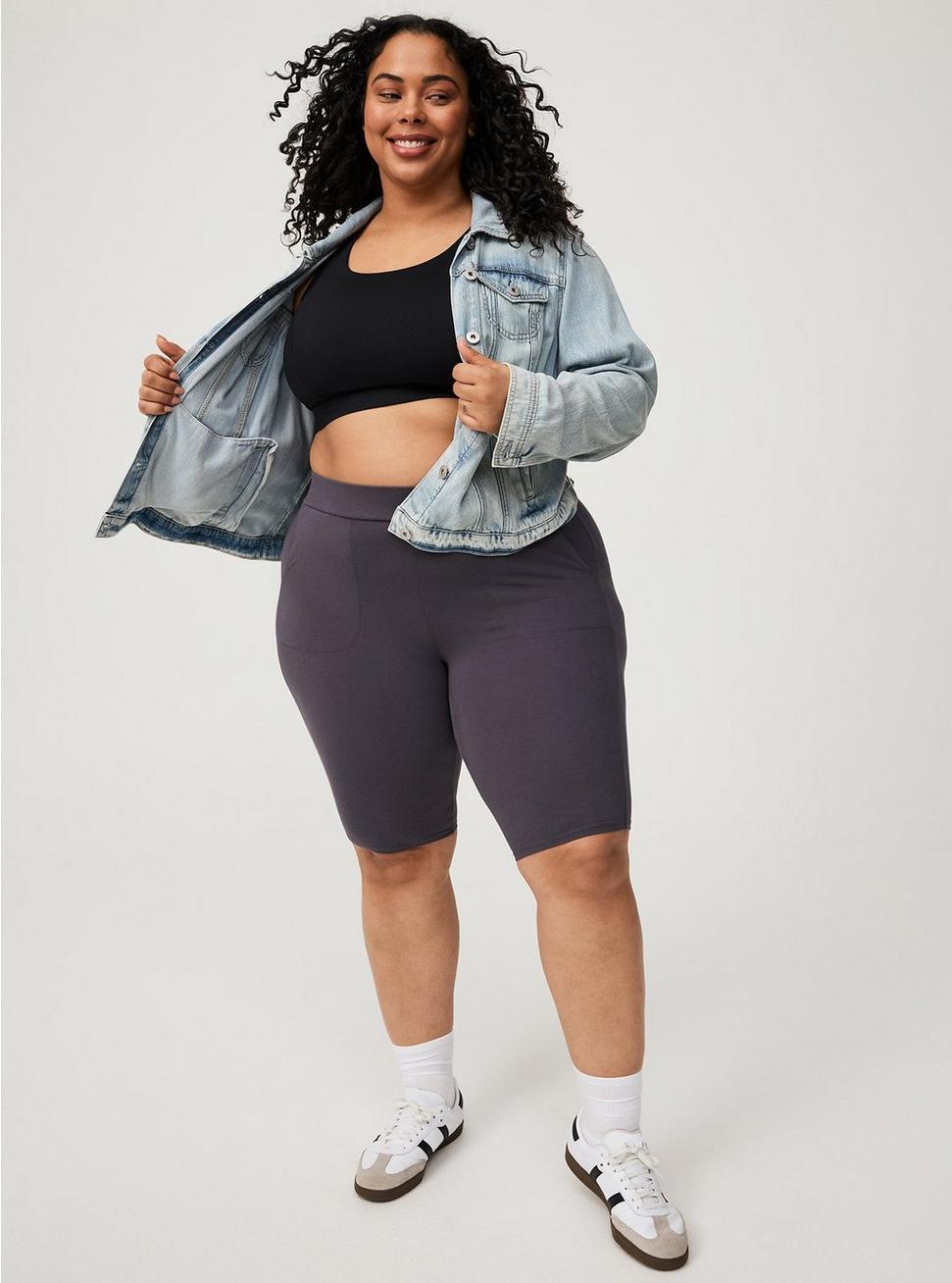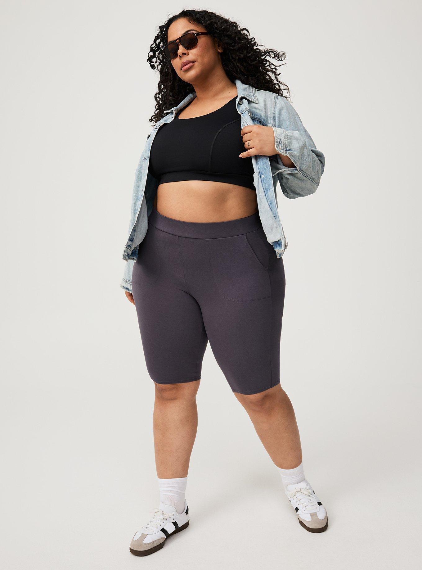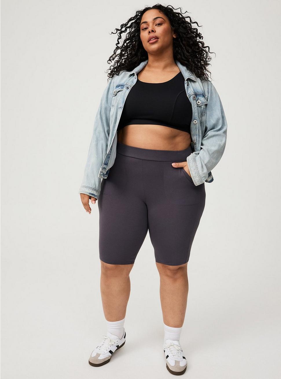 FITHigh rise.2'' Signature Waistband keeps things smooth and won't roll down.11'' inseam.MATERIALS + CAREThick cotton-blend fabric that smooths and flatters.4-way stretch with great recovery.95% cotton, 5% spandex.Machine wash cold. Dry low.Imported.DETAILSSeamless construction.Opaque (not see-through).Prevents leg chafing.Pocket detail. WHY WE LOVE ITWith the same incredible fit as our best-selling leggings, our bike shorts are perfect worn solo or under your fave dress or skirt to give you coverage and prevent chafing.