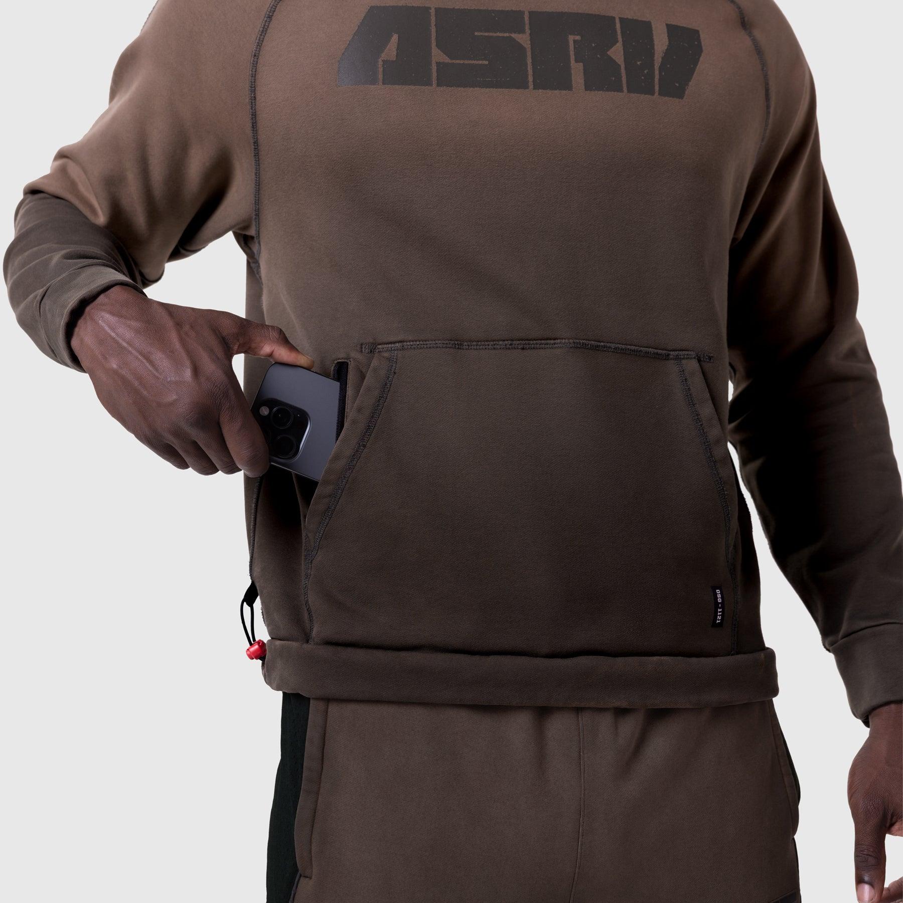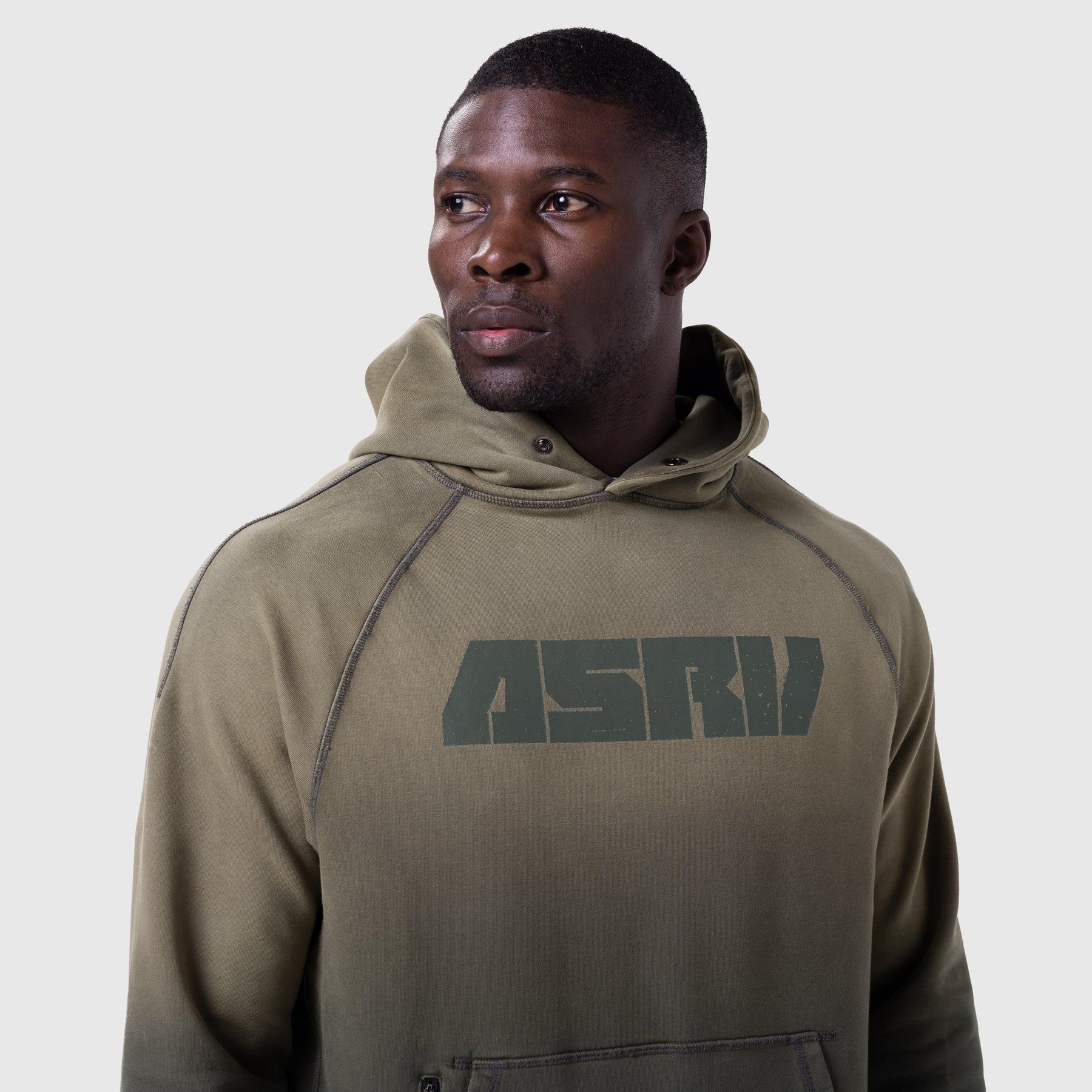 Relaxed-fit raglan sleeve hoodie constructed from our signature Tech-Terry™ fabric, combining the soft handfeel of French Terry with four-way stretch. Treated with a reactive “sun fade” dye process for a naturally worn, vintage aesthetic. Designed with reverse coverstitch detailing and a spacious kangaroo pocket, featuring an internal zip pocket on the right side for secure storage. Finished with a cinch hem for an adjustable fit, an ASRV “Blade” logo at the chest, and a woven patch label at the back neck. Model is 6’1 185lbs wearing size Medium.