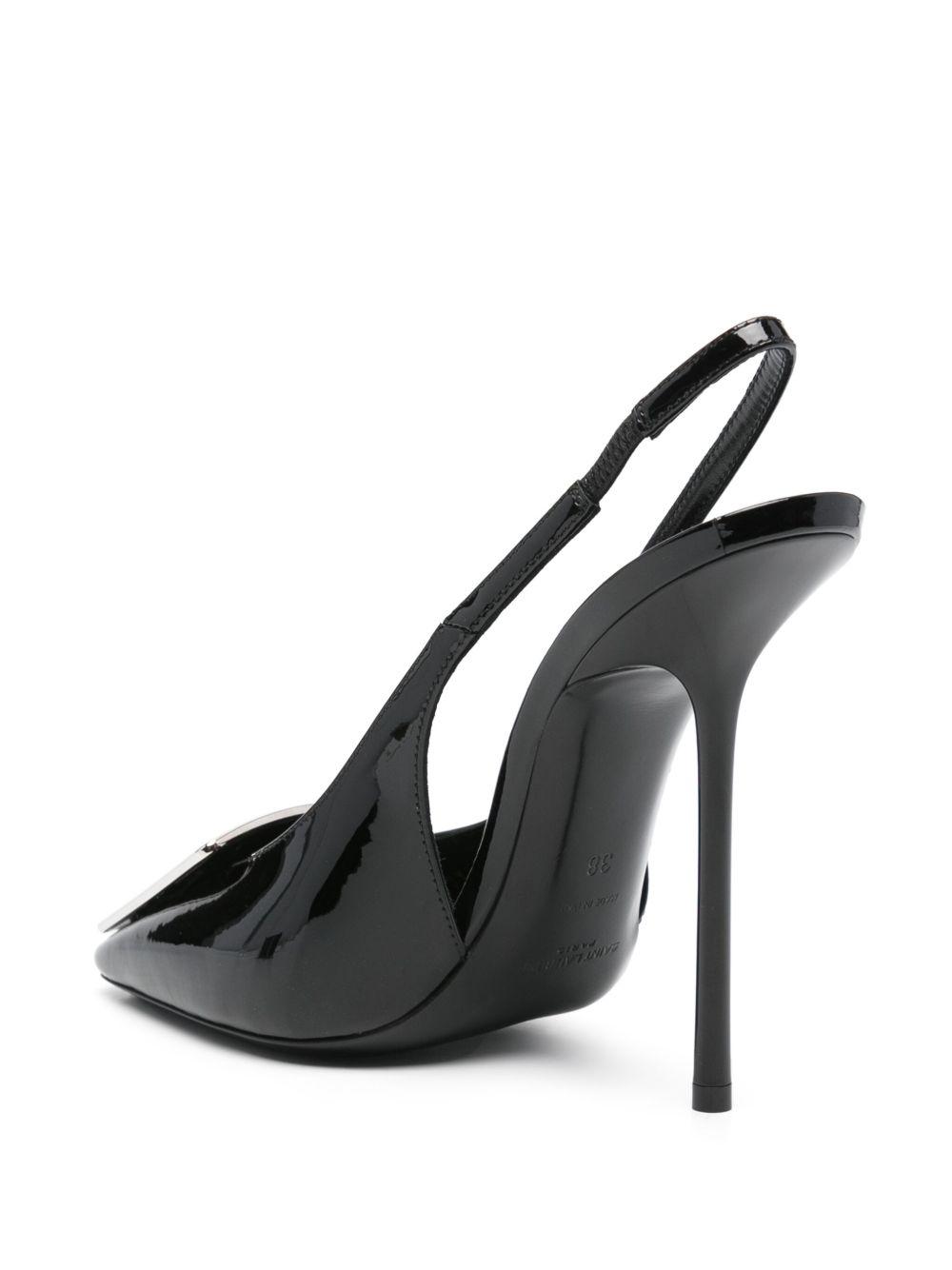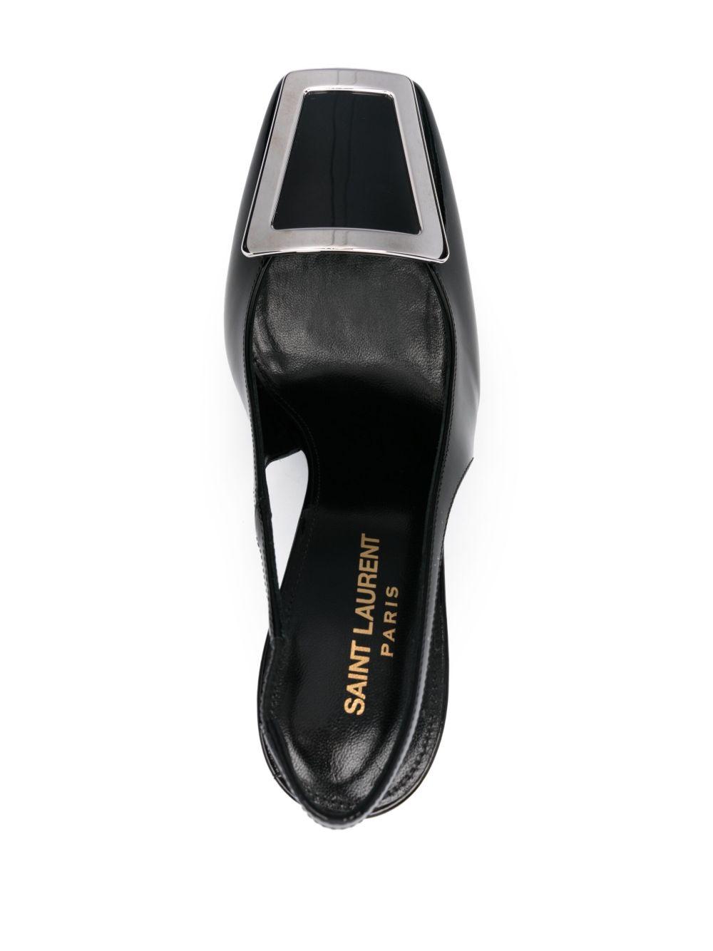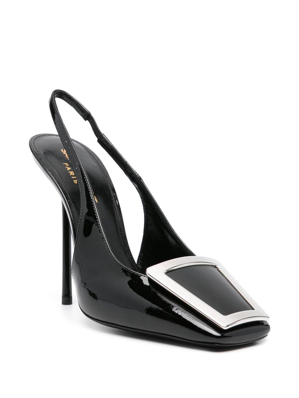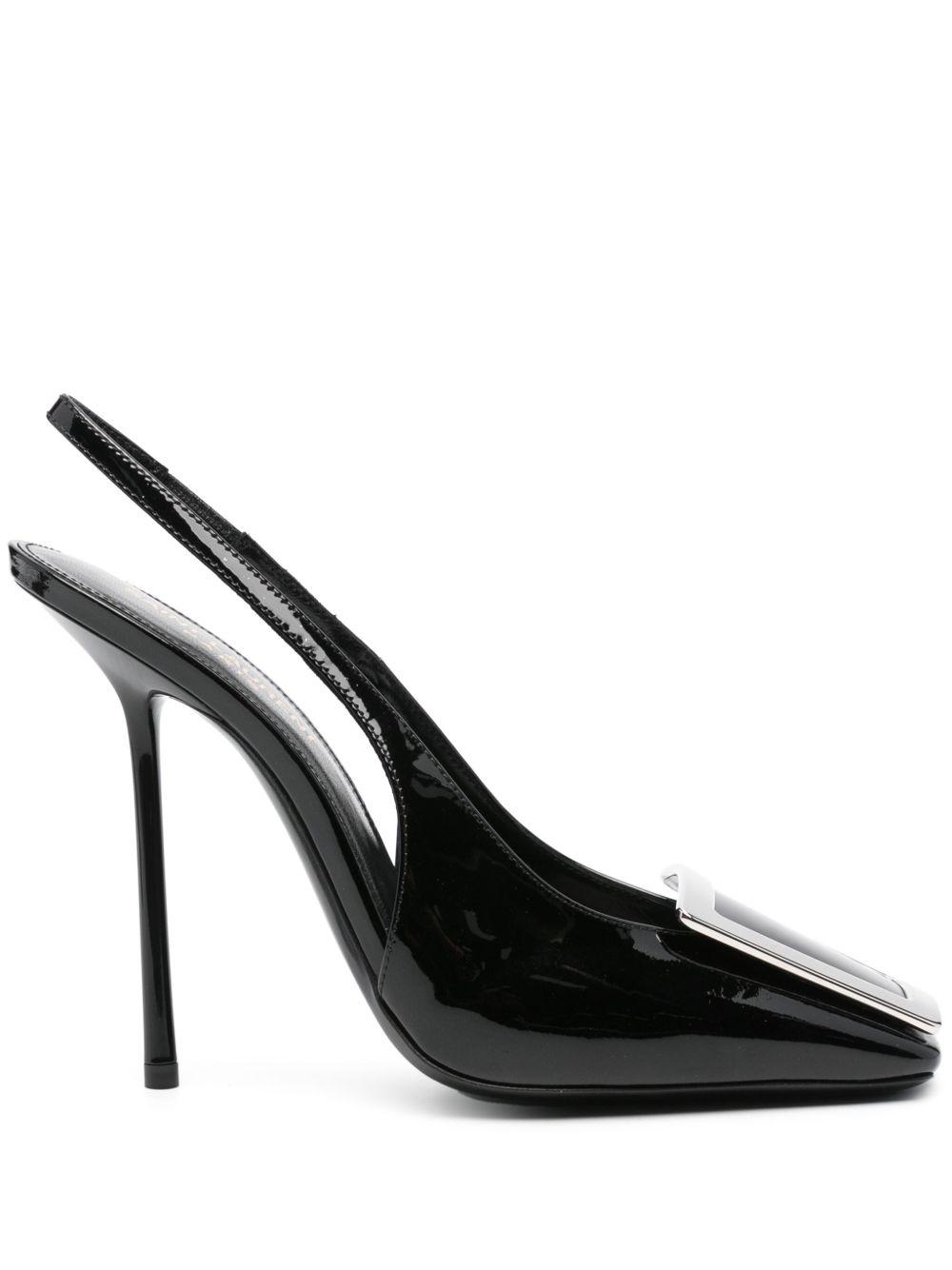 Saint Laurent 115mm George pumps | Black | black | leather | patent finish | square toe | ring hardware detailing | elasticated slingback strap | branded footbed | high stiletto heel | slip-on style | Calf Leather/Calf Leather/Rubber/Patent Calf Leather | Heeled Pumps | Pumps | Shoes | Women