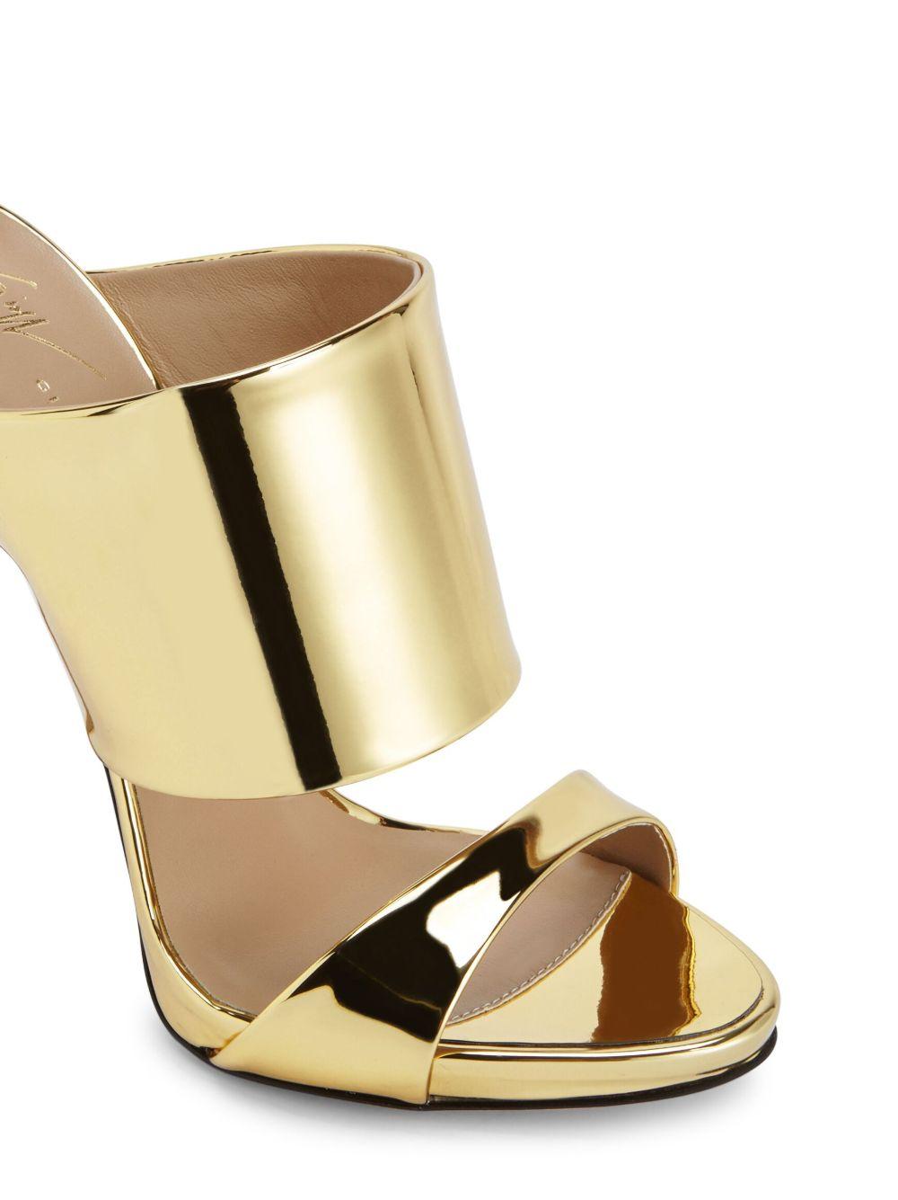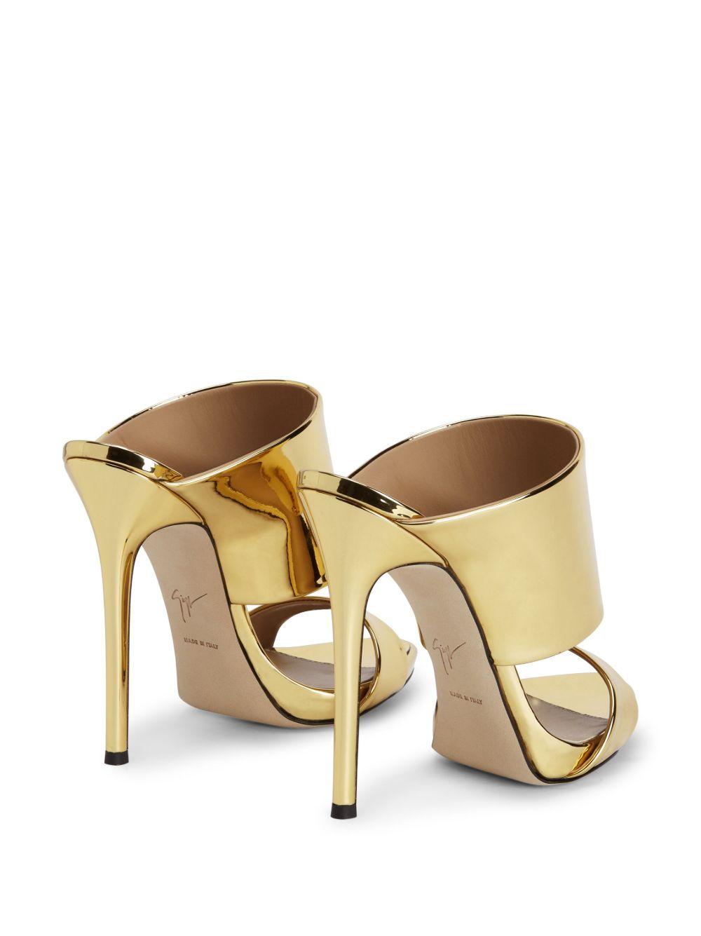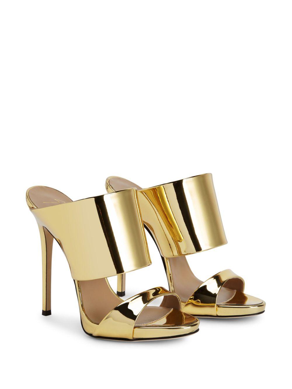 Giuseppe Zanotti 120mm Andrea metallic-finish sandals | Gold | gold-tone | leather | metallic finish | slip-on style | open toe | branded insole | high heel | Leather/Polyurethane/Polyester/Thermoplastic Polyurethane (TPU)/Polyurethane/Polyester/Thermoplastic Polyurethane (TPU) | Heeled Sandals | Sandals | Shoes | Women