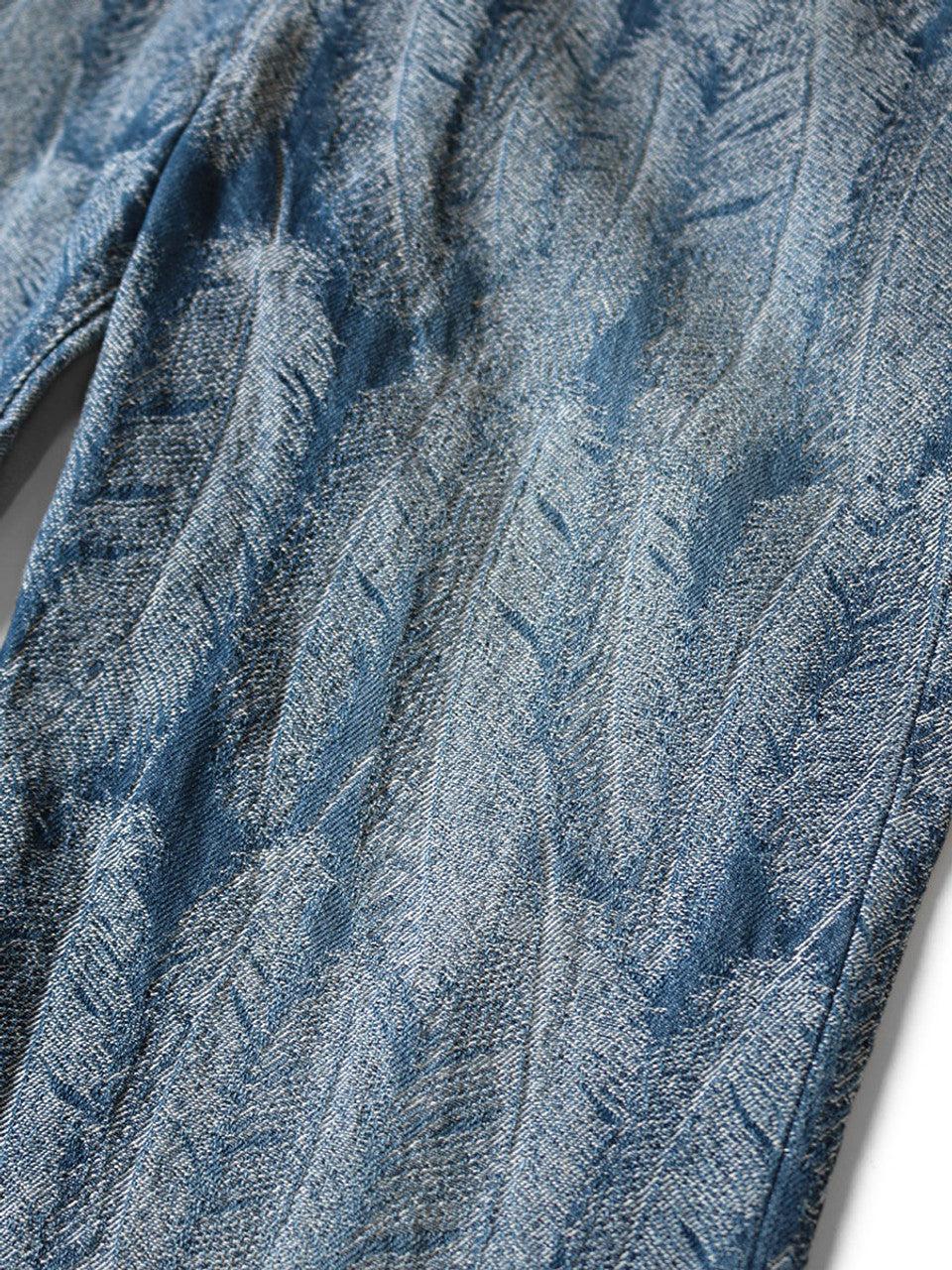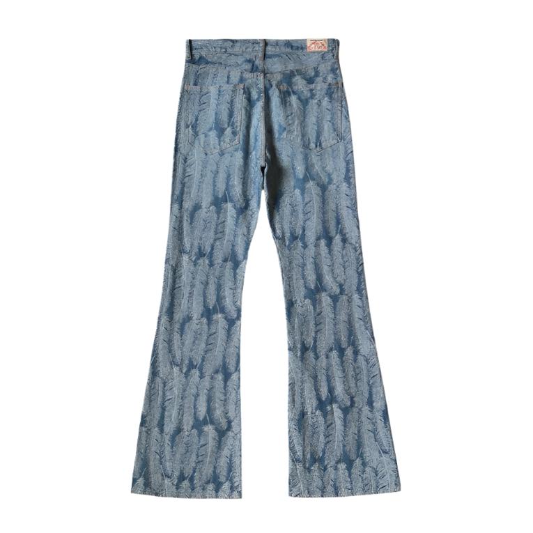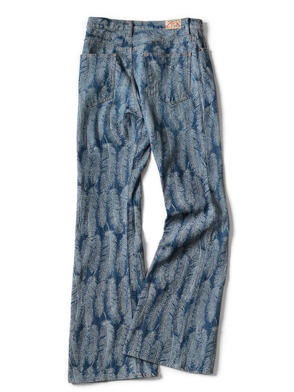 One of KAPITAL's standard denims, OKABELLBO features a deep rise and a flared silhouette. It uses jacquard denim that expresses the beautiful blue feathers of a magpie in three dimensions. *IDG dyes are used for indigo (dark color) and indigo (light color). The color may transfer to other clothing when worn. *This product has been processed to look secondhand. Tears and damage caused by processing are the design intent and are not product defects. Since it expresses changes due to aging, weakening of the fabric may be visible. Jacquard denim that expresses the beautiful feathers of a magpie in three dimensions. 12oz Denim High rise Flare silhouette Zipper fly One wash 100% cotton Made In Japan K2403LP015