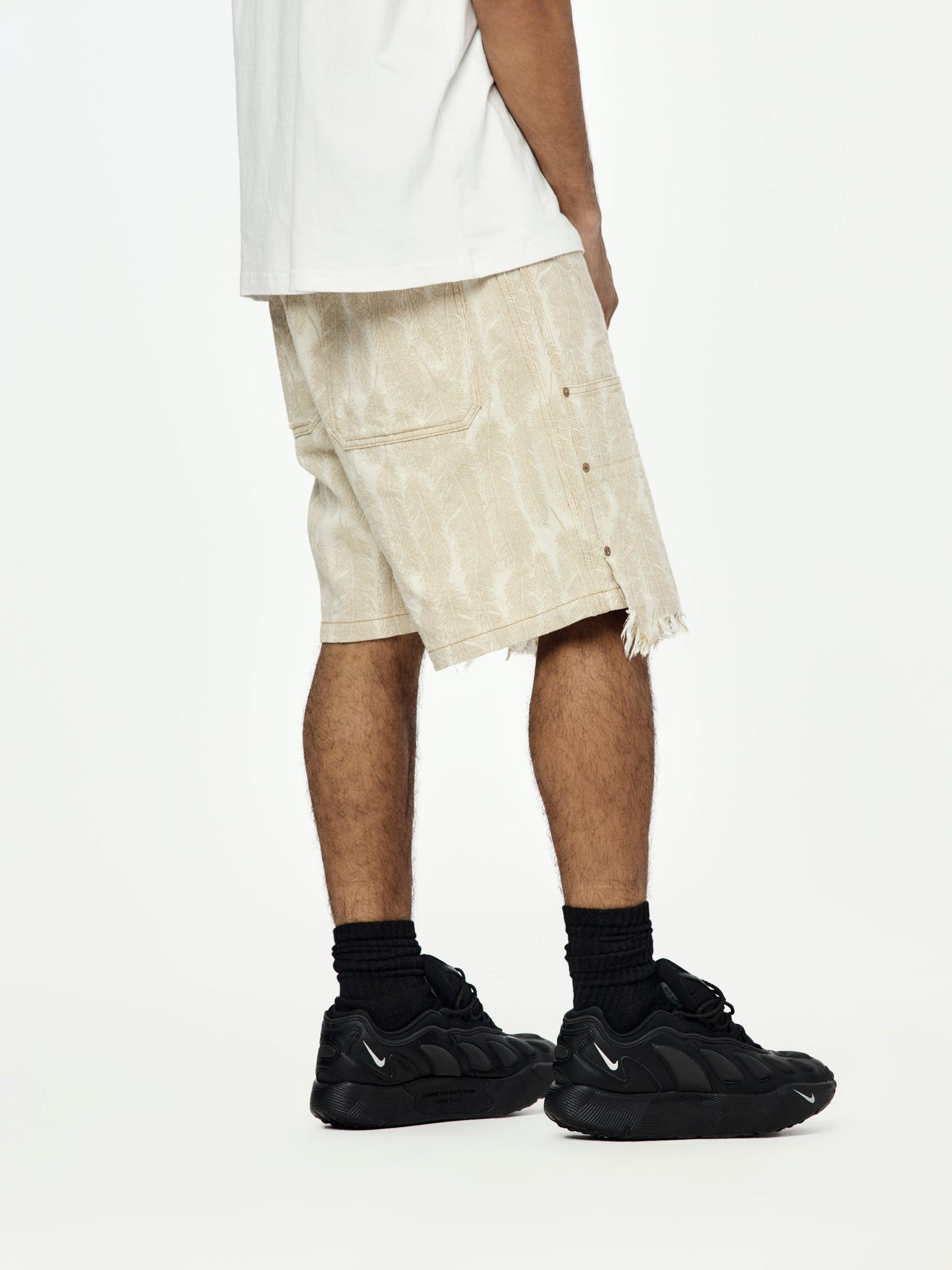 Cut from patterned 12oz denim, these easy shorts balance function and flair with reinforced double knees and raw hems. The relaxed silhouette and deconstructed wash give them a worn-in feel that pairs effortlessly with oversized shirts or light outerwear. Made in Japan. SKU: EK-1721SP