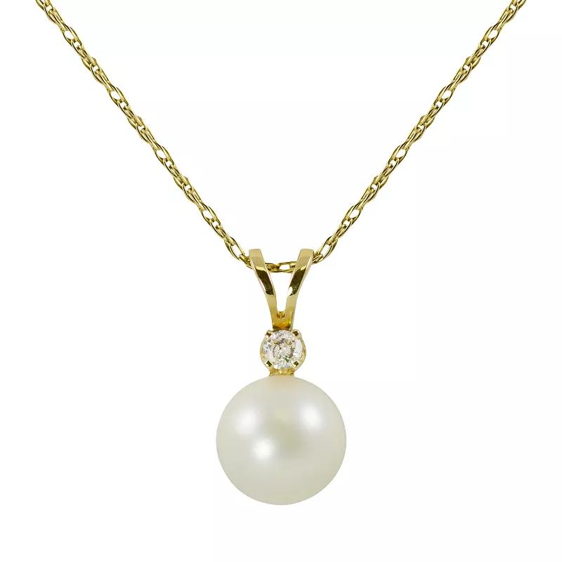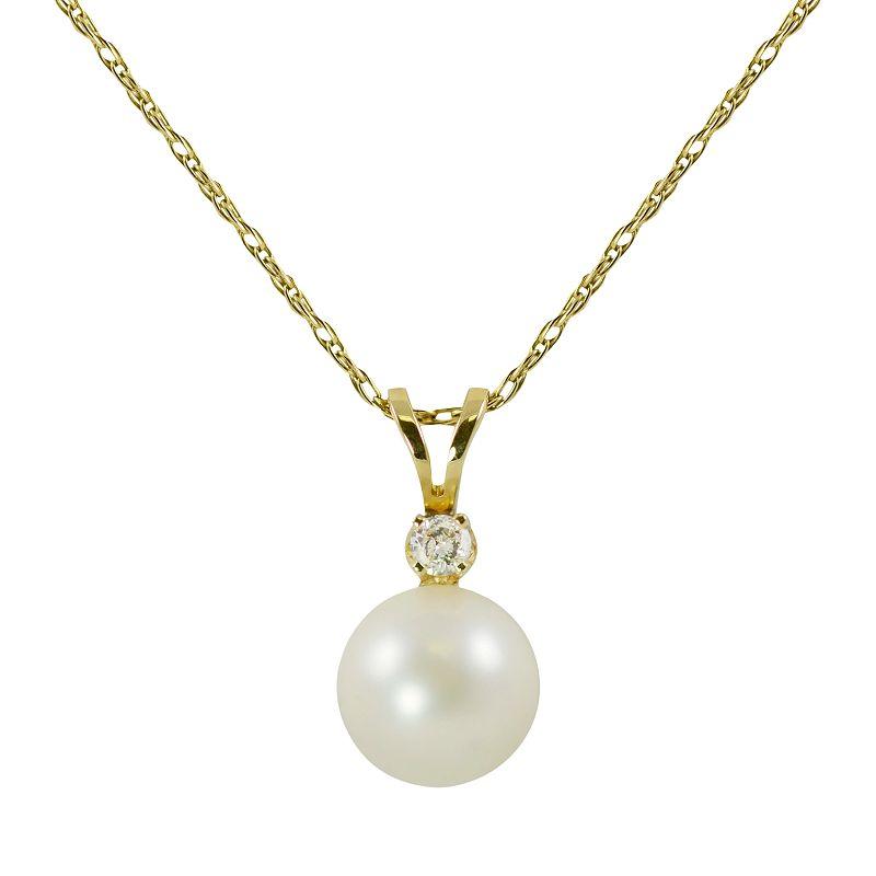 An Akoya cultured pearl and a diamond accent give this necklace exquisite beauty. Pendant Details: Pendant length: .55-in. Chain length: 18-in. Clasp: spring-ring Metal: 14k goldCultured Pearl Details: Type: Akoya Shape: round Size: 7-7.5-mm Color: whiteDiamond Details: Carat total weight: less than .1 Cut: round Color: G-H Clarity: I1 Setting: prongImage(s) may be enlarged to show detail.Diamond weights are approximate. Diamond total weights may vary between .01 and .08 ct. Some diamonds have fewer than 17 facets.Gemstones may have been treated to enhance their appearance. Special care may be required. Please visit our Gemstone Treatment & Special Care Guide for more information. Size: 18". Gender: female. Age Group: adult.