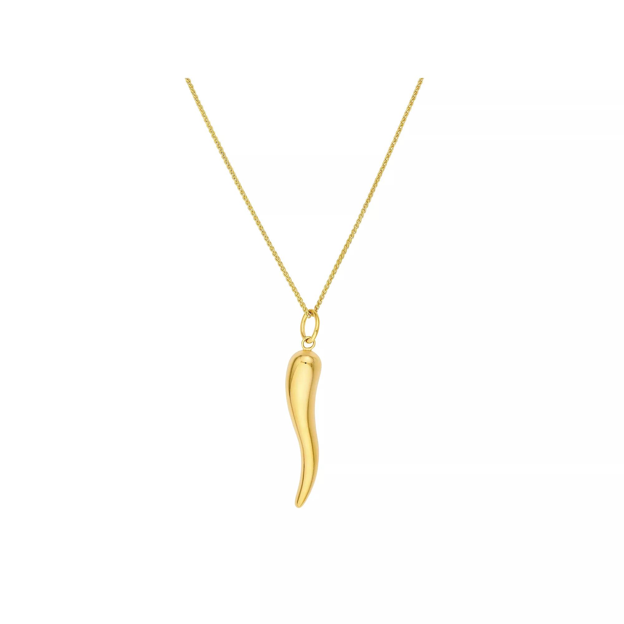 Symbolizing good luck and protection the Italian horn is captured beautifully in this polished pendant. Hanging from a wheat chain, it can be removed and added to other chains in your collection for a different look. Click on this JEWELRY & WATCHES GUIDE to learn about fit, styles, materials and more! Symbolizing good luck and protection the Italian horn is captured beautifully in this polished pendant. Hanging from a wheat chain, it can be removed and added to other chains in your collection for a different look. Click on this JEWELRY & WATCHES GUIDE to learn about fit, styles, materials and more! FEATURES Pendant dimensions: 1 1/8L x 3/16W Chain length: 18 in. Chain type: wheat Clasp: lobster-claw Nickel safe Metal: 14k gold Finish: polished Packaging: boxed Size: 18. Gender: female. Age Group: adult.