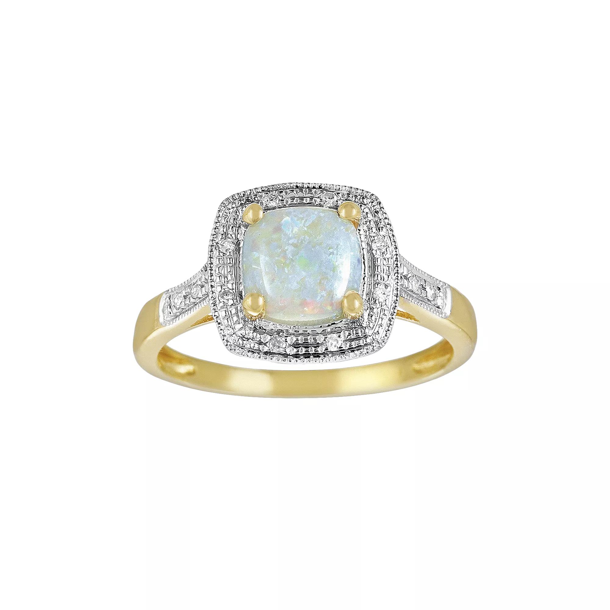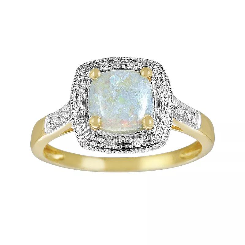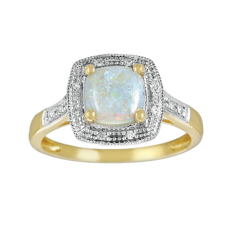A shimmering genuine opal center stone framed by diamond accents and milgrain details gives this ring stunning beauty.Ring Details: Width: 11-mm Metal: 14k gold Features: milgrainGemstone Details: Gemstone type: genuine opal Cut: cushion-shape Setting: prongDiamond Details: Carat total weight: less than .1 Cut: round Color: I-J Clarity: I2-I3 Setting: prongImage(s) may be enlarged to show detail.Diamond weights are approximate. Diamond total weights may vary between .01 and .08 ct. Some diamonds have fewer than 17 facets.Please note, due to the high value of this item, a signature may be required upon delivery.Gemstones may have been treated to enhance their appearance. Special care may be required. Please visit our Gemstone Treatment & Special Care Guide for more information. Color: White. Gender: female. Age Group: adult.