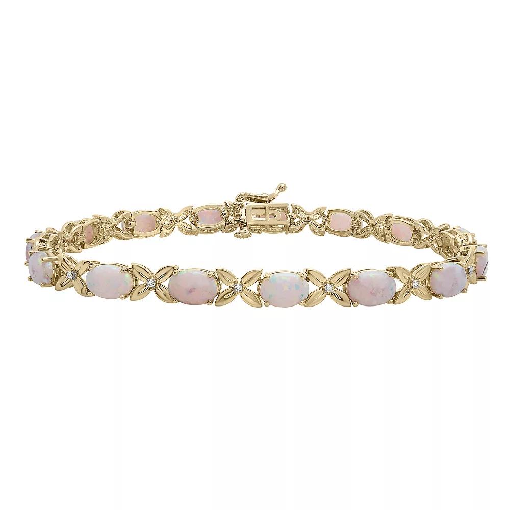 With its eye-catching white opal gemstones and a shiny polished finish, this captivating bracelet is the perfect way to add a touch of color to any ensemble. With its eye-catching white opal gemstones and a shiny polished finish, this captivating bracelet is the perfect way to add a touch of color to any ensemble. Metal: sterling silver Length: 7.25 in. Packaging: boxed Plating: 14k gold flash plated, rhodium Finish: polishedSTONE DETAILS Stone type: lab-created white opal Total weight: 5 1/2 ct. Shape: oval Setting: prongDIAMOND DETAILS Total weight: 1/10 ct. Shape: round Setting: prong Diamond weights are approximate. Diamond Total Weights may vary between .01 and .13 ct. Some diamonds consist of fewer than 17 facets. Gemstones may have been treated to enhance their appearance. Special care may be required. Please visit our Gemstone Treatment & Special Care Guide for more information. Image(s) may be enlarged to show detail. Please note, due to the high value of this item, a signature may be required upon delivery. Size: 7.25". Gender: female. Age Group: adult.