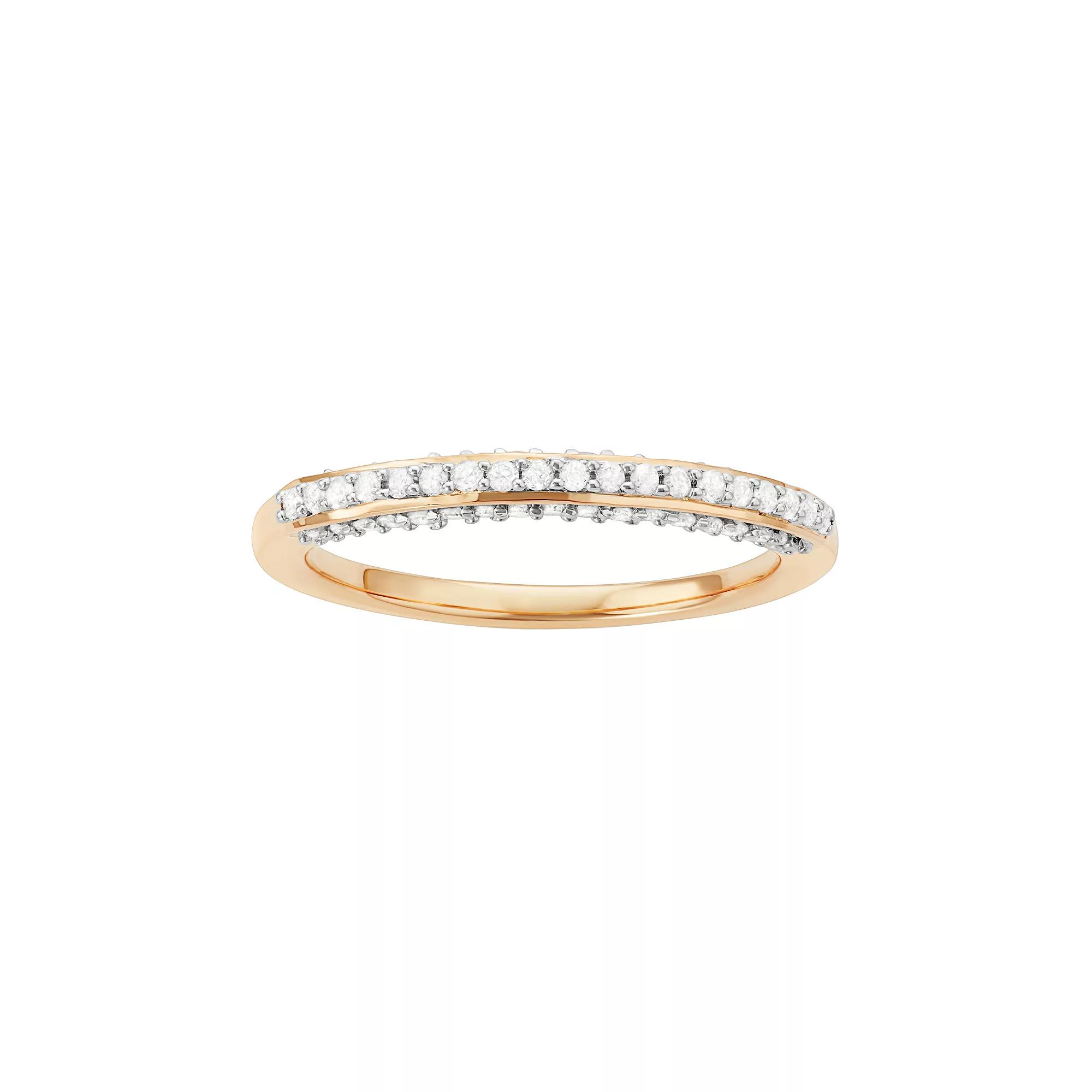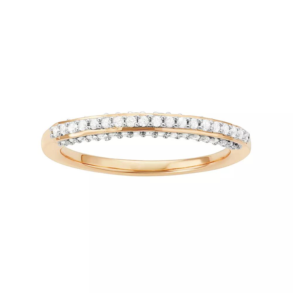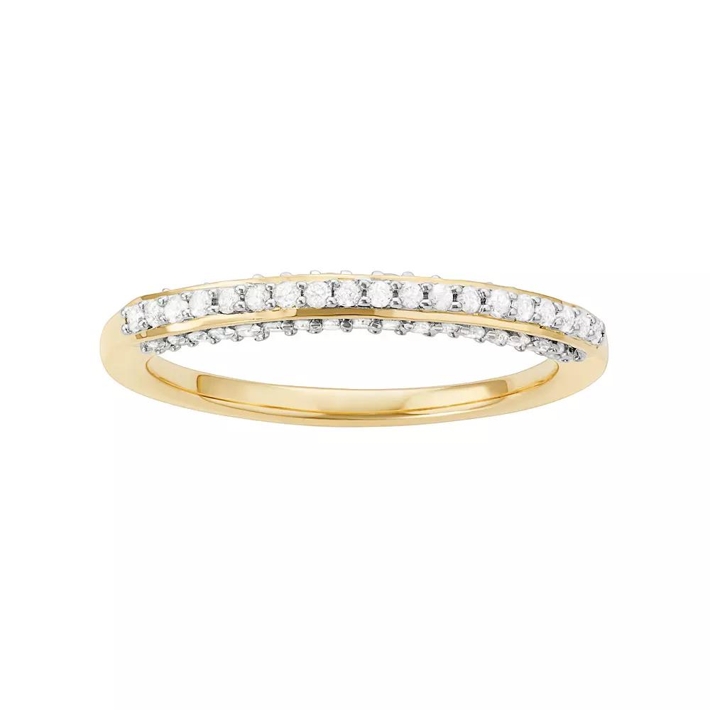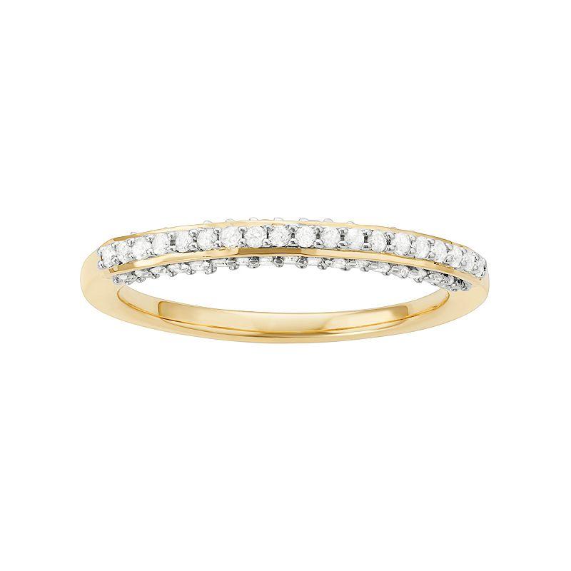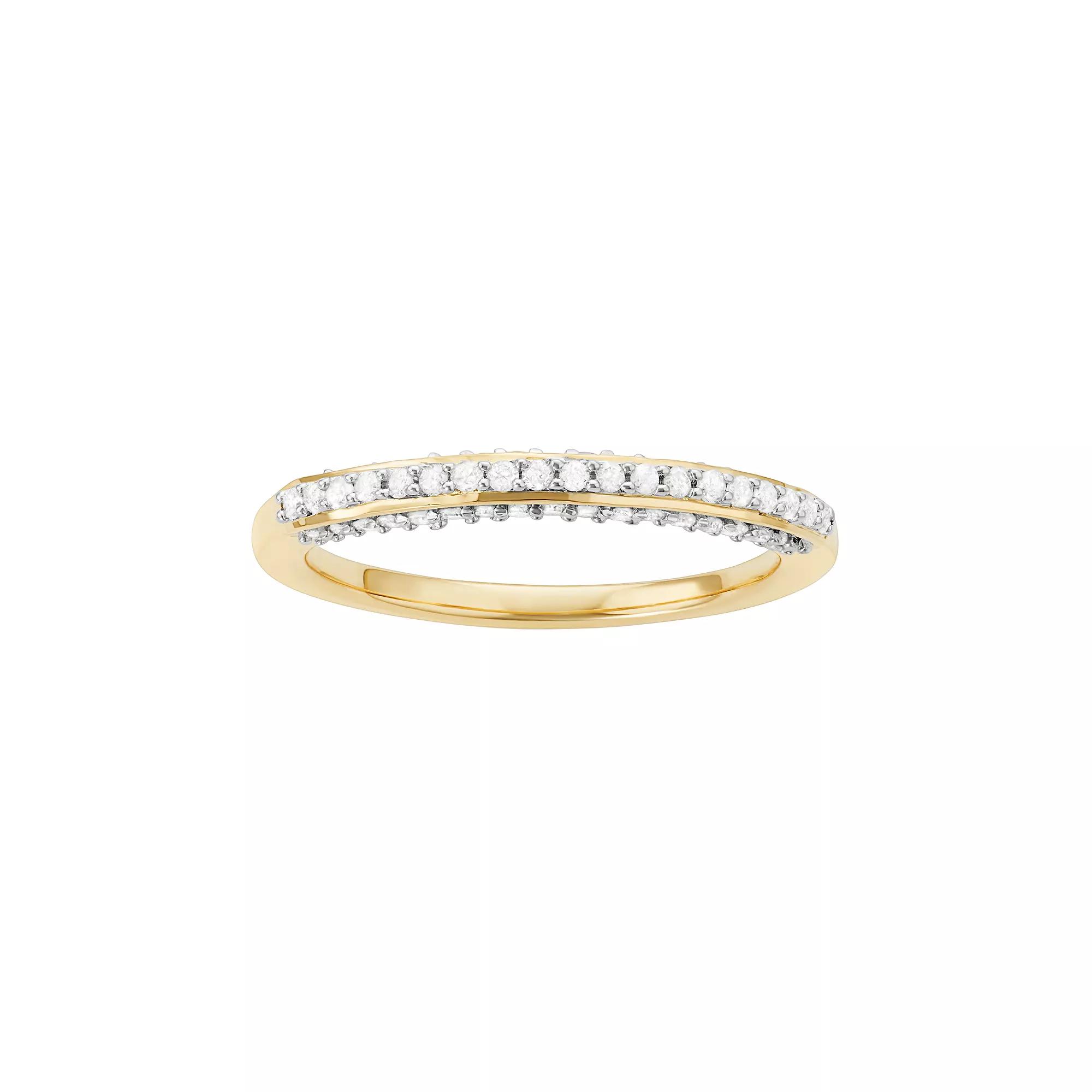 Accentuated with diamonds, this wedding ring beautifully celebrates your everlasting love. RING DETAILS Width: 2.5 mm Metal: sterling silver Plating: 14k gold DIAMOND DETAILS Total weight: 1/3 ct. Shape: single cut Color grade: H-I Clarity: I1-I2 Setting: prong Gemstones may have been treated to enhance their appearance. Special care may be required. Please visit our Gemstone Treatment & Special Care Guide for more information. Image(s) may be enlarged to show detail.Diamond weights are approximate. Diamond total weights may vary between .01 and .08 ct. Some diamonds have fewer than 17 facets. Color: White. Gender: female. Age Group: adult. Material: Gold Over Sterling.