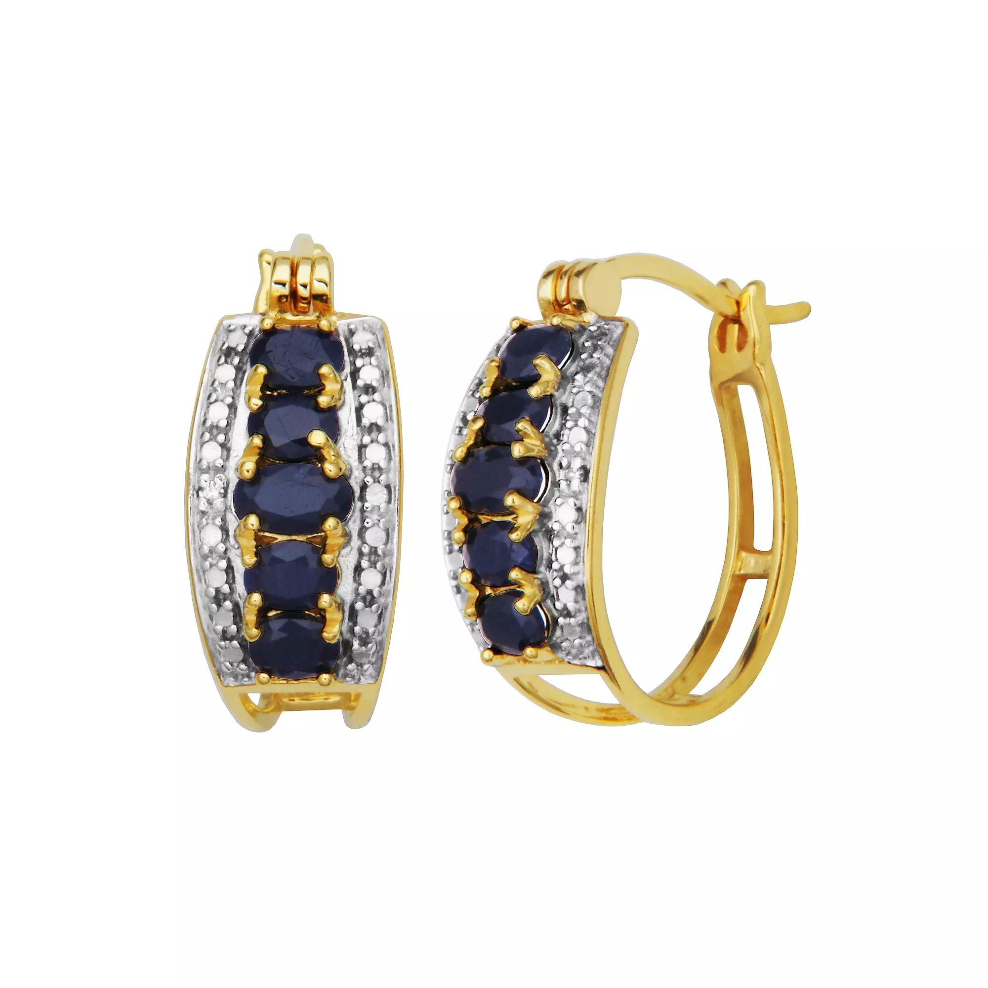 Dress to impress when you pair these stylish black sapphire and diamond accent hoops with your favorite ensembles. EARRING DETAILS Length: 0.75 in. Backings: click-it Metal: sterling silver Plating: 14k gold, rhodium Packaging: boxed STONE DETAILS Stone type: black sapphire Total weight: 2 ct. Shape: oval Setting: prong DIAMOND DETAILS Total weight: less than 1/10 ct. Shape: round Setting: prong Gemstones may have been treated to enhance their appearance. Special care may be required. Please visit our Gemstone Treatment & Special Care Guide for more information.Image(s) may be enlarged to show detail.Diamond weights are approximate. Diamond total weights may vary between .01 and .08 ct. Some diamonds have fewer than 17 facets. Size: One Size. Color: Blue. Gender: female. Age Group: adult. Material: Gold Over Sterling.