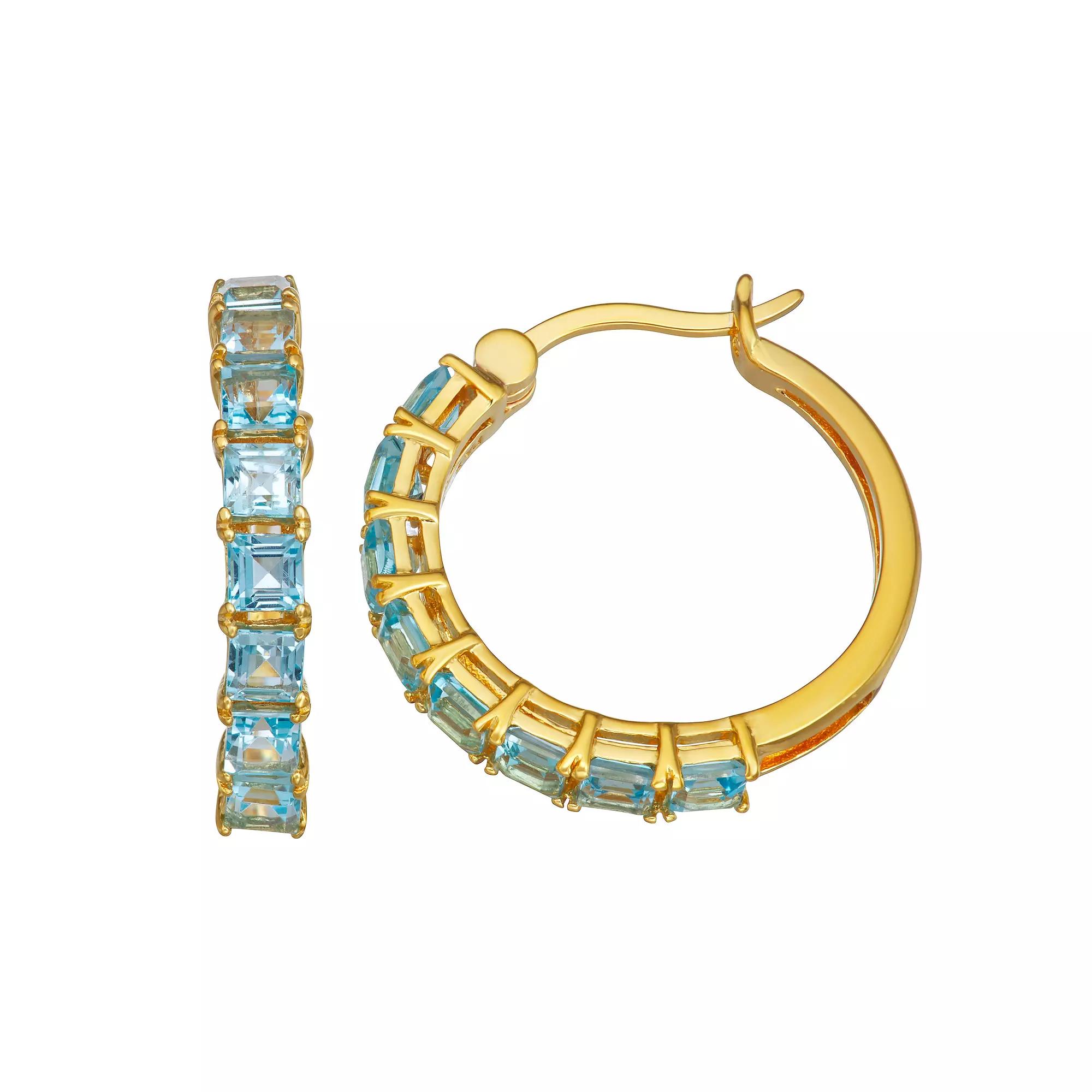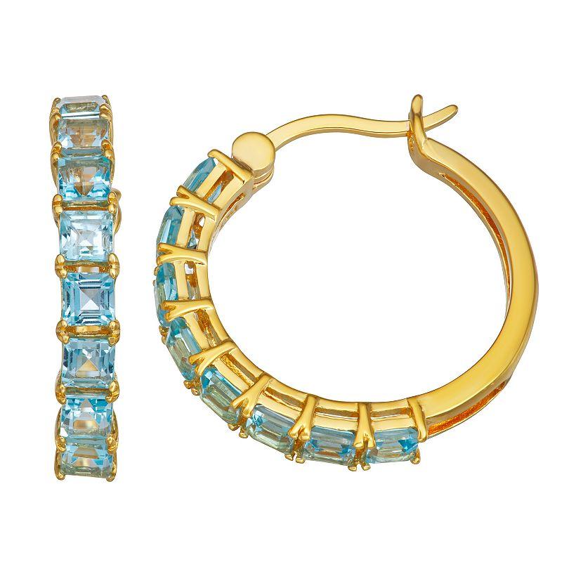 Decorated with beautiful, square-cut blue topaz gemstones, these 14k gold-over-silver hoops add a cool touch to your wardrobe. Decorated with beautiful, square-cut blue topaz gemstones, these 14k gold-over-silver hoops add a cool touch to your wardrobe. Length: 7/8 in. Backings: fishhook Metal: sterling silver Plating: 14k gold Finish: polished Packaging: boxedSTONE DETAILS Stone type: Swiss blue topaz Total weight: 2 1/2 ct. Shape: square Setting: prong Please note, due to the high value of this item, a signature may be required upon delivery. Gemstones may have been treated to enhance their appearance. Special care may be required. Please visit our Gemstone Treatment & Special Care Guide for more information. Size: One Size. Gender: female. Age Group: adult. Material: Gold Over Sterling.