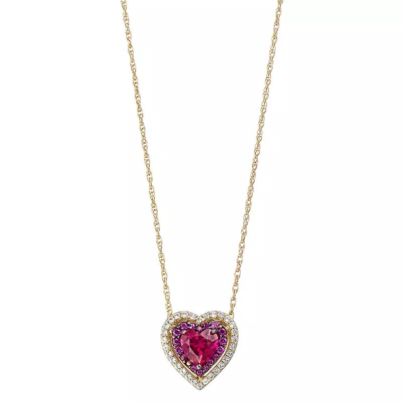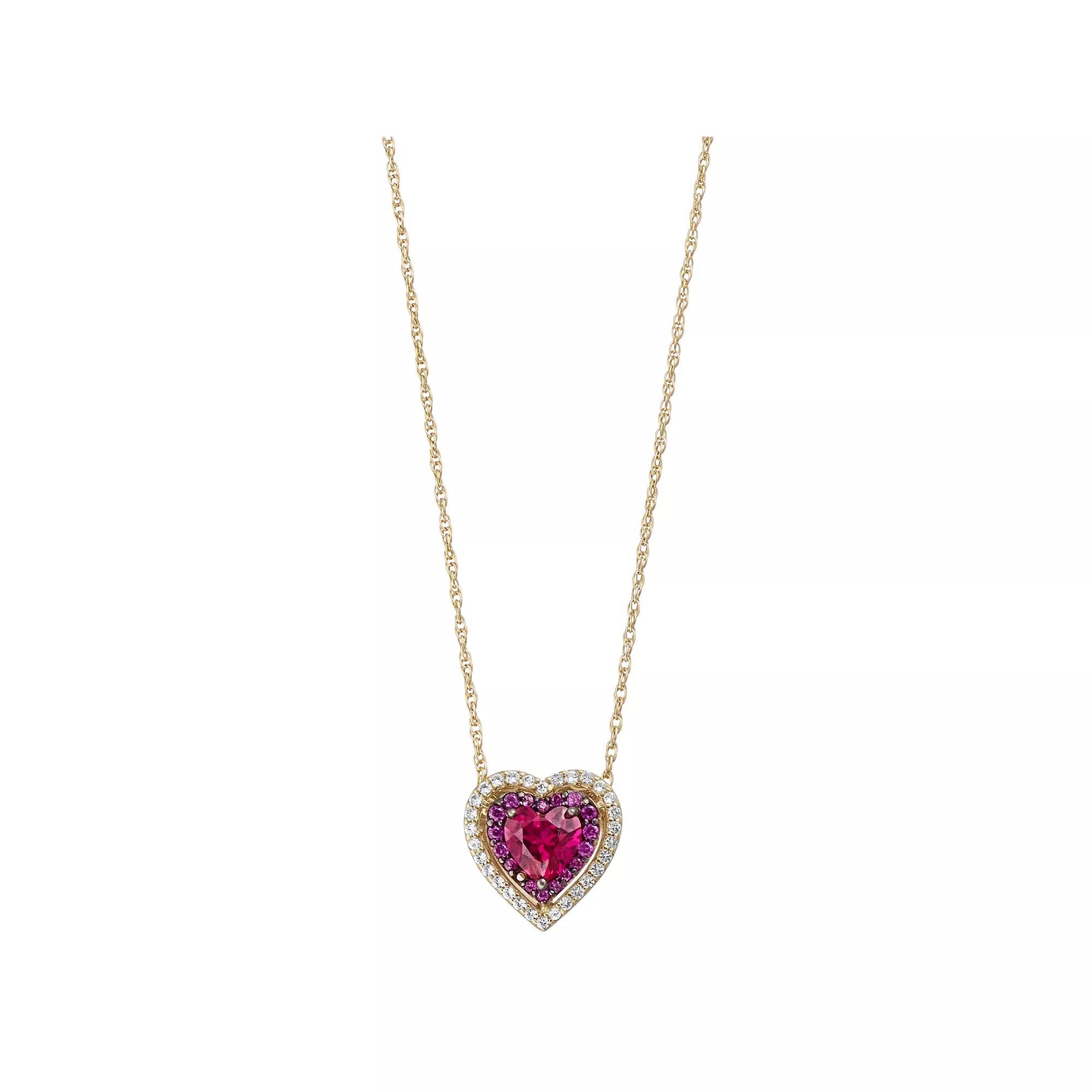 Add a touch of elegance and romance to your wardrobe with this 14k Gold Over Silver Lab-Created Ruby & Lab-Created White Sapphire Heart Pendant Necklace. Click on this JEWELRY & WATCHES GUIDE to learn about fit, styles, materials and more! Add a touch of elegance and romance to your wardrobe with this 14k Gold Over Silver Lab-Created Ruby & Lab-Created White Sapphire Heart Pendant Necklace. Click on this JEWELRY & WATCHES GUIDE to learn about fit, styles, materials and more! FEATURES Pendant dimensions: 0.5L x 0.49W Chain length: 18 in. Chain type: rope Clasp: spring-ring Nickel safe Metal: sterling silver Plating: 14k gold, black rhodium Finish: polished Packaging: boxedSTONE DETAILS Stone type: lab-created ruby, lab-created white sapphire Total weight: 1 3/8 ct. Center stone weight: 1 1/10 ct. Center stone size: 6 mm x 6 mm Shape: heart, round Setting: prong, shared prong Gemstones may have been treated to enhance their appearance. Special care may be required. Please visit our Gemstone Treatment & Special Care Guide for more information. Size: 18. Gender: female. Age Group: adult. Material: Gold Over Sterling.