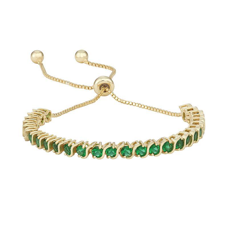 Featuring round-cut simulated emerald stones and S links, this adjustable lariat bracelet exudes a radiant look.BRACELET DETAILS Length: adjusts to 9 in. Metal: sterling silver Plating: 14k gold STONE DETAILS Stone type: simulated emerald Total weight: 3 ct. Shape: round Setting: prong Gemstones may have been treated to enhance their appearance. Special care may be required. Size: 9". Color: Green. Gender: female. Age Group: adult. Material: Gold Over Sterling.