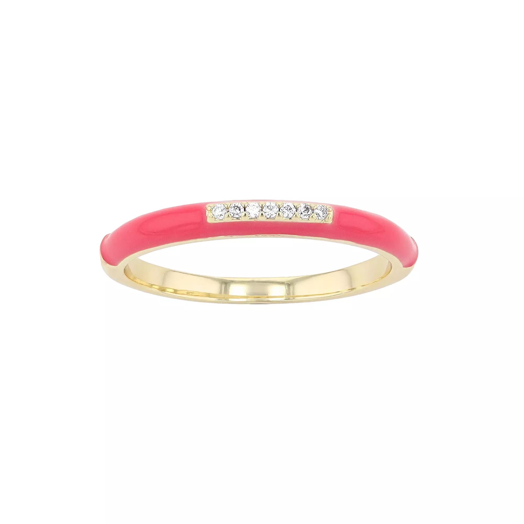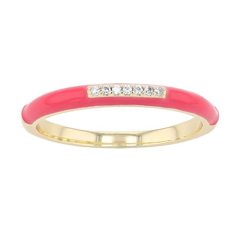 Complete your ensemble with this elegant 14k Gold-Plated Silver with Cubic Zirconia Hot Pink Enamel Slim Stacking Ring. Click on this JEWELRY & WATCHES GUIDE to learn about fit, styles, materials and more! Complete your ensemble with this elegant 14k Gold-Plated Silver with Cubic Zirconia Hot Pink Enamel Slim Stacking Ring. Click on this JEWELRY & WATCHES GUIDE to learn about fit, styles, materials and more! FEATURES Ring width: 3 mm Shank style: stackable Band fit: rounded Metal: sterling silver Plating: 14k gold Finish: enameled Packaging: boxedSTONE DETAILS Stone type: cubic zirconia Gemstones may have been treated to enhance their appearance. Special care may be required. Please visit our Gemstone Treatment & Special Care Guide for more information. Size: 6. Gender: female. Age Group: adult.