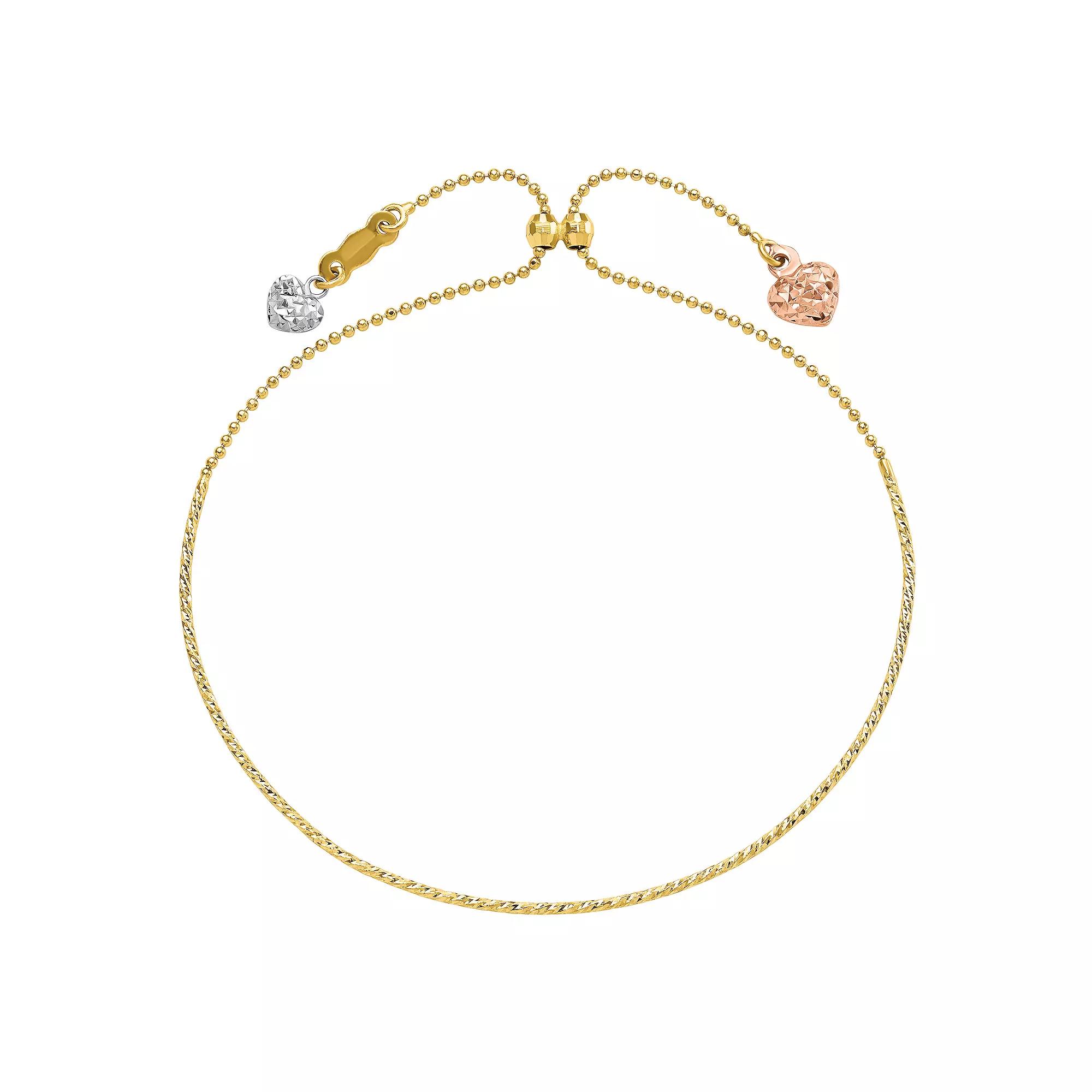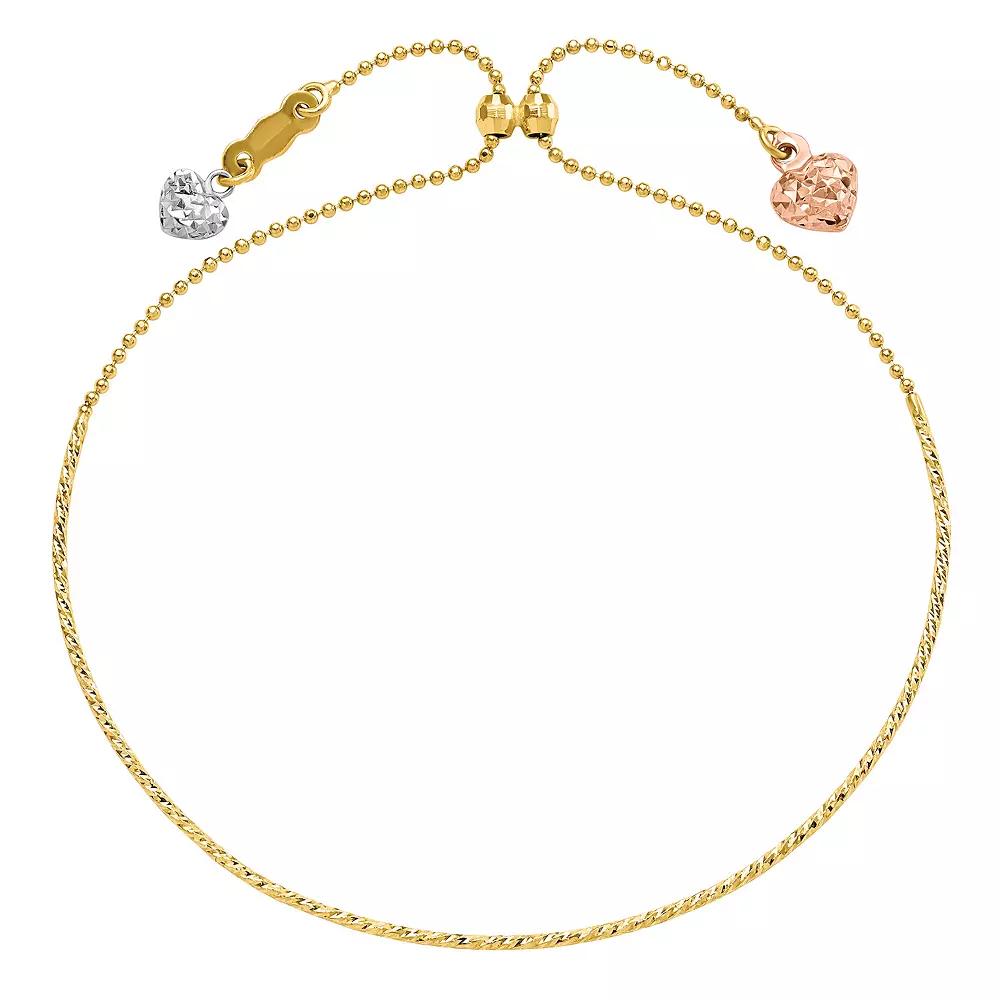 A wonderful reminder of your affection, this adjustable bracelet is a look she'll want to wear every day. Featuring two diamond-cut detailed hearts dangling at ends with bright shine, this 14K Yellow, White, and Rose Gold bracelet creates a beautiful design. This dainty and darling bolo bracelet reflects your love. | Belk & Co 14K Tri Color Diamond Cut Heart Adjustable Bracelet, Yellow