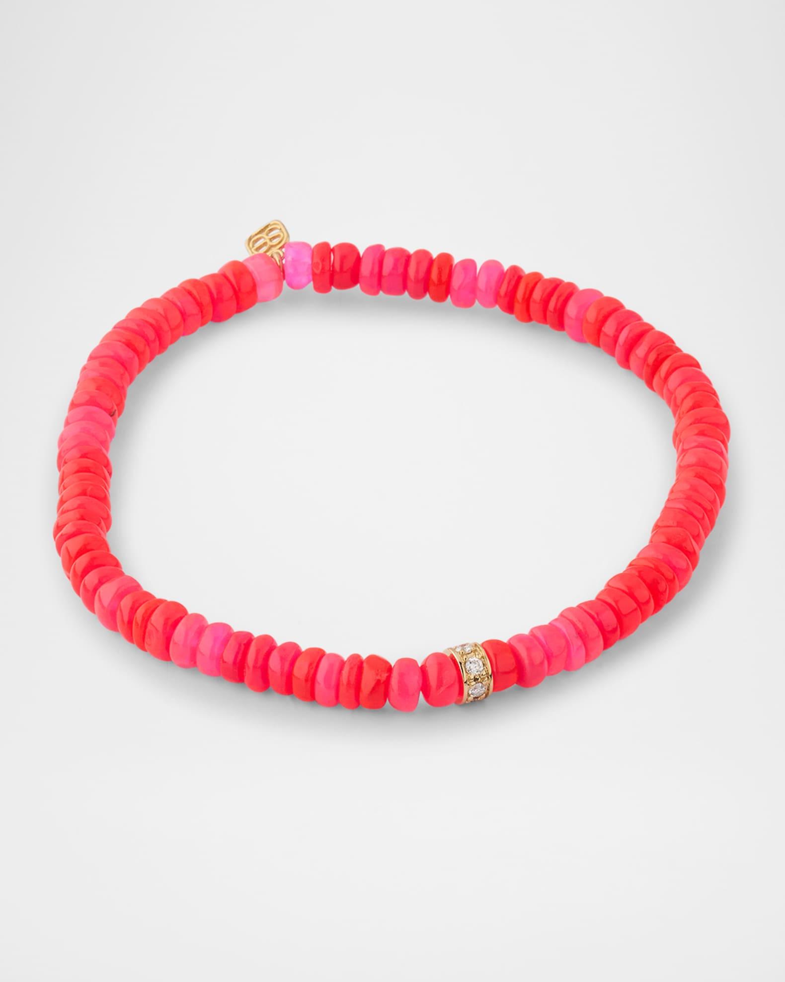 Hot pink Ethiopian opals are strung together for this stretch bracelet by Sydney Evan. A 4mm brilliant H-I diamond wheel accents the bracelet. Polished 14-karat yellow gold Diamond total carat weight: 0.04 Stretchy; slip-on style Imported