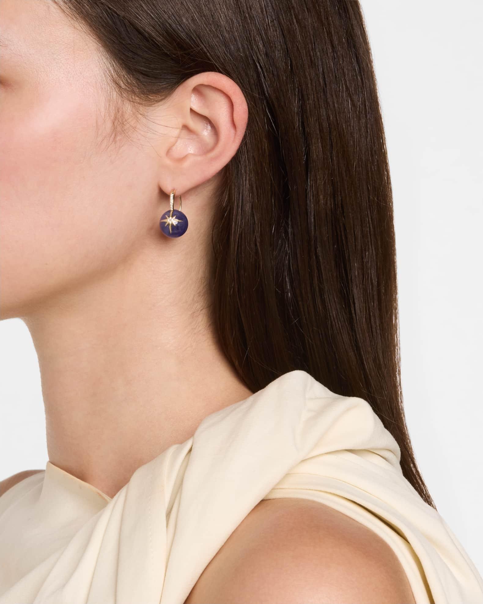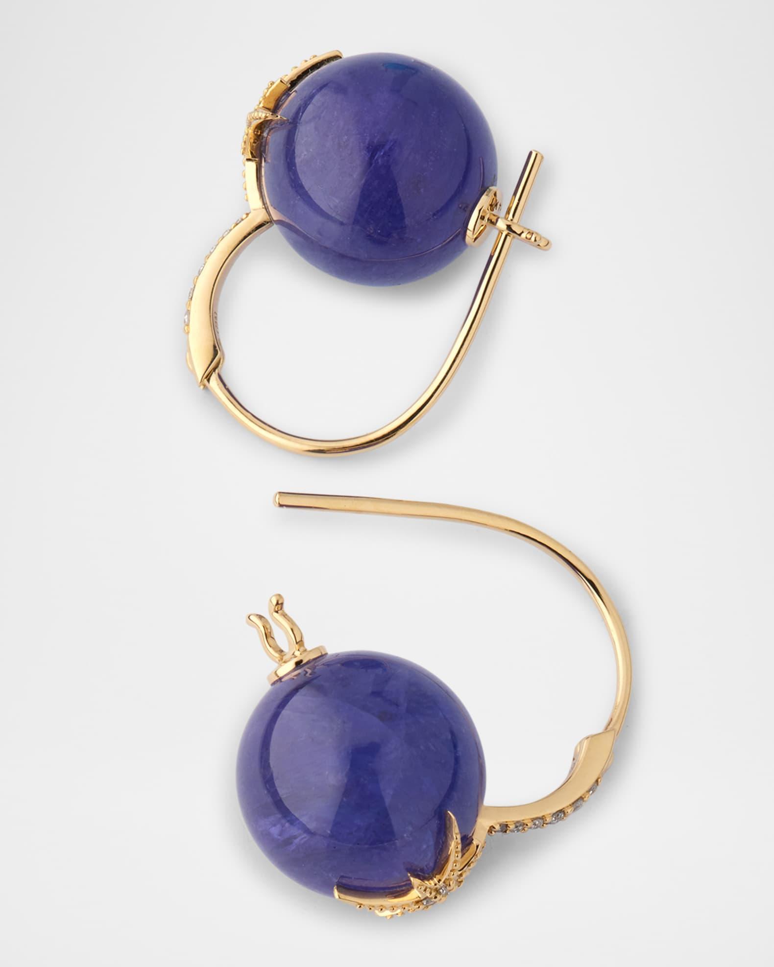 These tanzanite earrings from Sydney Evan depict a starburst with H-I brilliant-cut diamonds. Approz. 12mm beads Polished 14-karat yellow gold 20 pavé-set white diamonds 0.1 total diamond carat weight For pierced ears Spot clean, wipe clean Imported