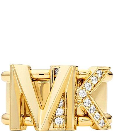 Showcasing the labels iconic monogram logo, Michael Kors ring is crafted of polished 14K-gold-plated metal accented with shimmering pav cubic zirconia. Cubic zirconia Brass Imported SIZE Band width, about 12mm ABOUT THE BRAND Since launching his eponymous brand in 1981, Michael Kors has been taking the fashion world by storm with his luxury accessories and ready-to-wear. With multiple labels under his name, Kors designs remain glamorous and effortless-and now include jewelry, handbags, shoes and eyewear. Fine Jewelry - Fashion Watches > Michael Kors > Saks Fifth Avenue > Barneys. Michael Kors. Size: 7.