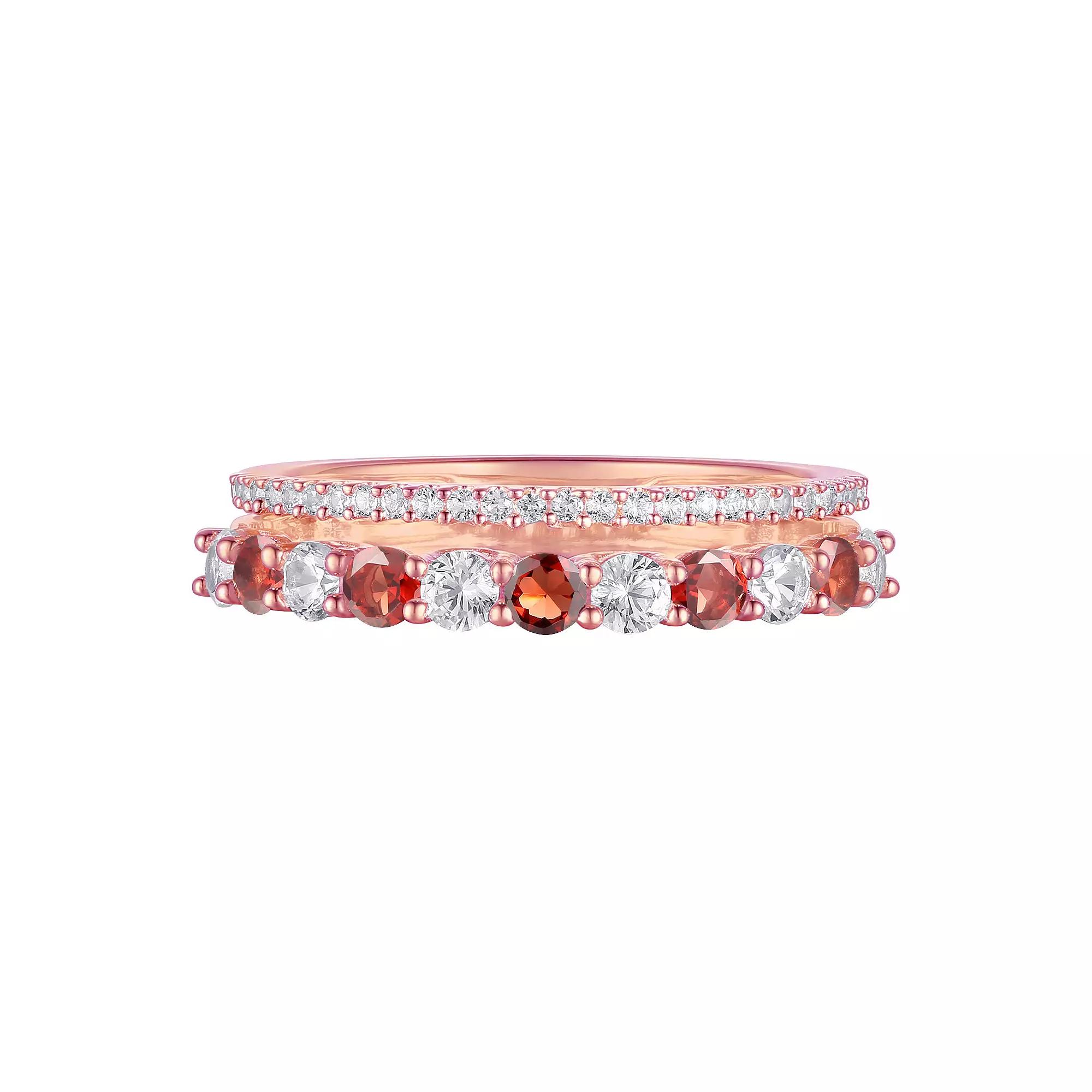 Elegantly designed with a row of round-cut garnet gemstones and accented with lab-created white sapphires, this 14k rose gold over silver ring completes your look in style. Click on this JEWELRY & WATCHES GUIDE to learn about fit, styles, materials and more! Elegantly designed with a row of round-cut garnet gemstones and accented with lab-created white sapphires, this 14k rose gold over silver ring completes your look in style. Click on this JEWELRY & WATCHES GUIDE to learn about fit, styles, materials and more! FEATURES Size: 7 Width: 19 mm Shank style: solitaire Band fit: comfort fit Nickel free Metal: sterling silver Plating: 14k rose gold flash plated Finish: polished Packaging: boxedSTONE DETAILS Stone type: garnet, lab-created white sapphire Total weight: 5/8 ct. Center stone size: 2.5 mm Shape: round Setting: prong Gemstones may have been treated to enhance their appearance. Special care may be required. Please visit our Gemstone Treatment & Special Care Guide for more information. Please note, due to the high value of this item, a signature may be required upon delivery. Color: Pink. Gender: female. Age Group: adult.