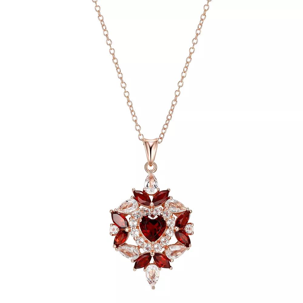 Radiant and lovely, this garnet and white topaz heart cluster pendant is a beautiful complement to your wardrobe. Radiant and lovely, this garnet and white topaz heart cluster pendant is a beautiful complement to your wardrobe. Length: 33 mm Chain length: 18 in. Chain type: cable Metal: sterling silver Plating: 14k rose gold Finish: polished Packaging: boxedSTONE DETAILS Stone type: garnet, white topaz Total weight: 3 1/2 ct. Center stone weight: 3/4 ct. Center stone size: 6 mm Shape: marquise, heart, pear, round Setting: prong Gemstones may have been treated to enhance their appearance. Special care may be required. Please visit our Gemstone Treatment & Special Care Guide for more information. Please note, due to the high value of this item, a signature may be required upon delivery. Gender: female. Age Group: adult. Material: Gold Over Sterling.