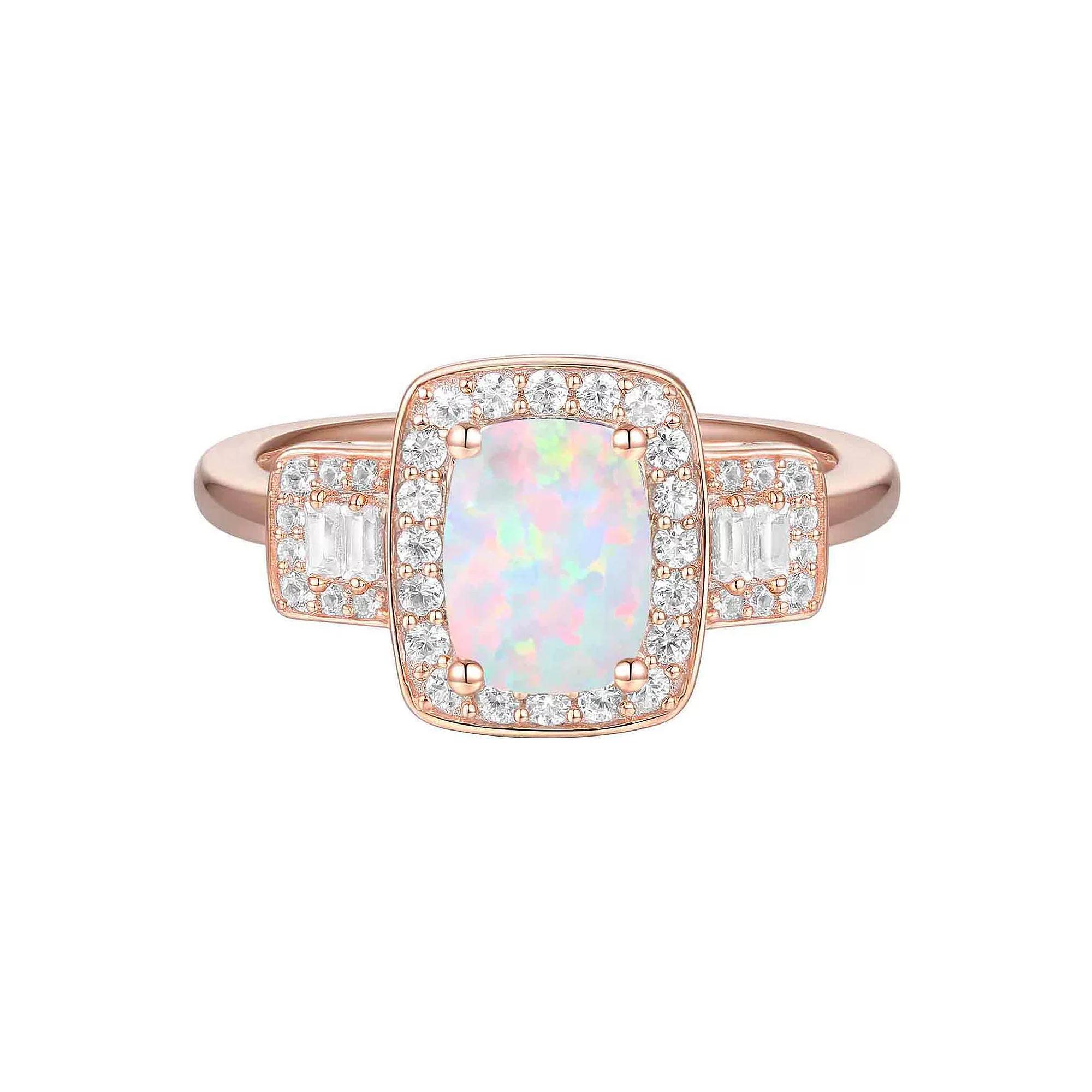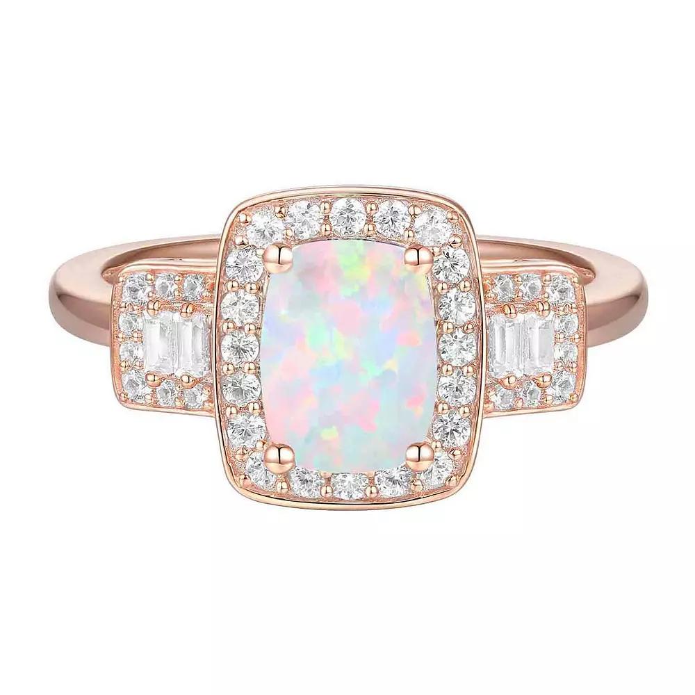 Youll sparkle with this 14k rose gold over silver lab-created opal and lab-created white sapphire ring. Click on this JEWELRY & WATCHES GUIDE to learn about fit, styles, materials and more! Youll sparkle with this 14k rose gold over silver lab-created opal and lab-created white sapphire ring. Click on this JEWELRY & WATCHES GUIDE to learn about fit, styles, materials and more! FEATURES Ring width: 19.5 mm. Shank style: solitaire Band fit: comfort fit Nickel free Metal: sterling silver Plating: 14k rose gold flash plated Finish: polished Packaging: boxedSTONE DETAILS Stone type: lab-created opal, lab-created white sapphire Total weight: 7/8 ct. Center stone weight: 3/8 ct. Center stone size: 8 mm. x 6 mm. Shape: baguette cut, round Setting: prong Gemstones may have been treated to enhance their appearance. Special care may be required. Please visit our Gemstone Treatment & Special Care Guide for more information. Color: Pink. Gender: female. Age Group: adult.