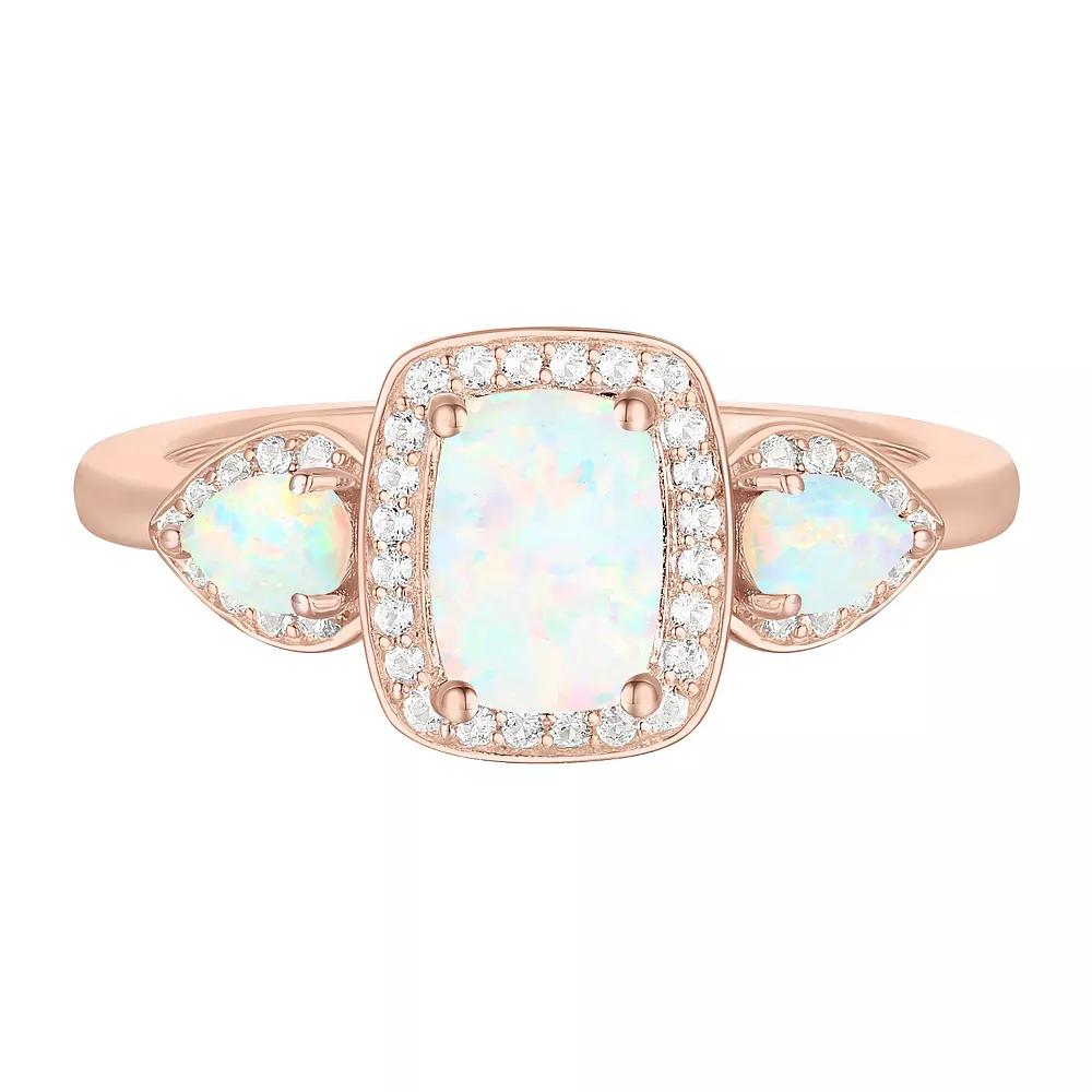 Dazzling with lab-created opal gemstones and lab-created white sapphires, this 14k rose gold over silver ring offers timeless beauty. Click on this JEWELRY & WATCHES GUIDE to learn about fit, styles, materials and more! Dazzling with lab-created opal gemstones and lab-created white sapphires, this 14k rose gold over silver ring offers timeless beauty. Click on this JEWELRY & WATCHES GUIDE to learn about fit, styles, materials and more! FEATURES Size: 7 Width: 19 mm Shank style: solitaire Band fit: comfort fit Nickel free Metal: sterling silver Plating: 14k rose gold flash plated Finish: polished Packaging: boxedSTONE DETAILS Stone type: lab-created opal, lab-created white sapphire Total weight: 5/8 ct. Center stone weight: 1/4 ct. Center stone size: 7 mm x 5 mm Shape: cushion cut, round Setting: prong Gemstones may have been treated to enhance their appearance. Special care may be required. Please visit our Gemstone Treatment & Special Care Guide for more information. Please note, due to the high value of this item, a signature may be required upon delivery. Color: Pink. Gender: female. Age Group: adult.