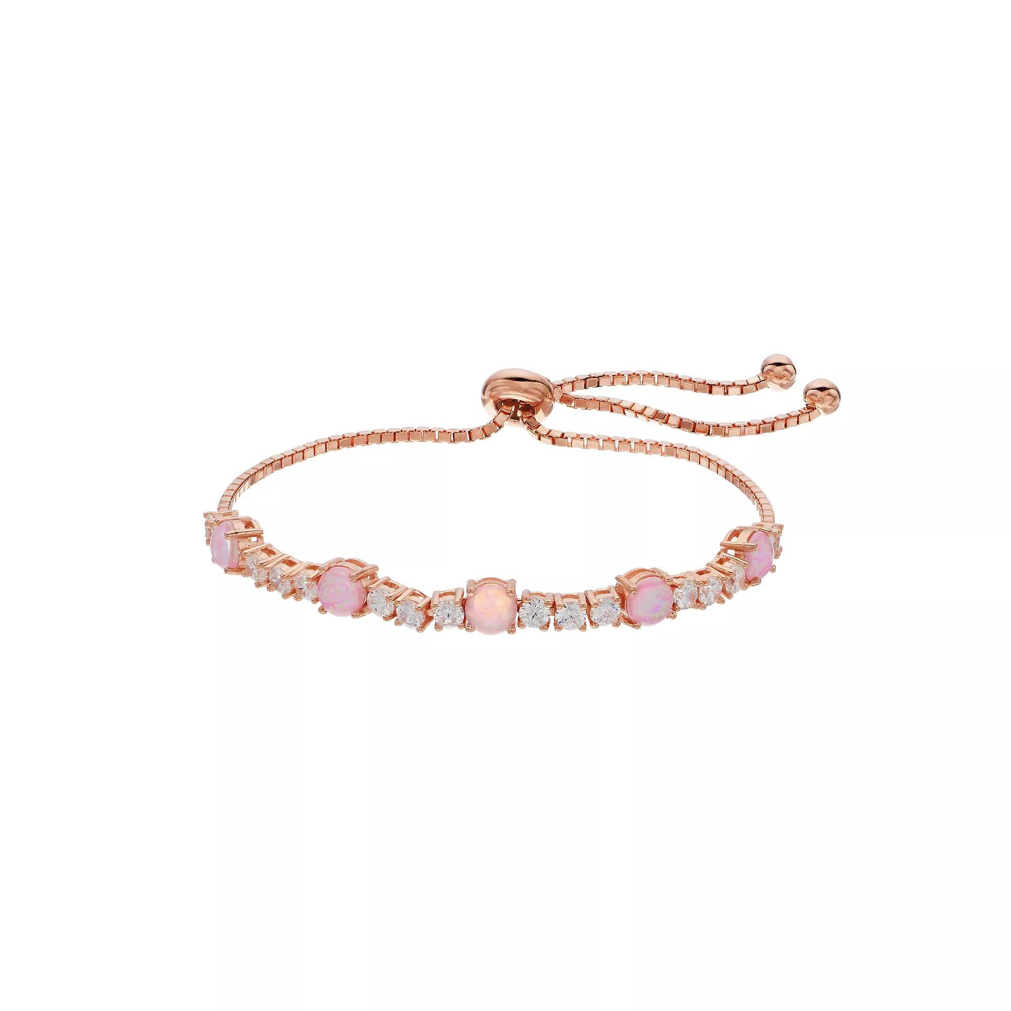 You're sure to captivate when you wear this enchanting lab-created pink opal bolo bracelet.BRACELET DETAILSLength: adjusts to 8 in.Clasp: sliderMetal: sterling silverPlating: 14k rose goldSTONE DETAILSStone type: lab-created pink opalTotal weight: 2 1/2 ct.Shape: round cabochonSetting: prongCUBIC ZIRCONIA DETAILSTotal weight: 2 3/4 ct.Shape: round brilliant cutSetting: prongGemstones may have been treated to enhance their appearance. Special care may be required. Size: One Size. Gender: female. Age Group: adult.