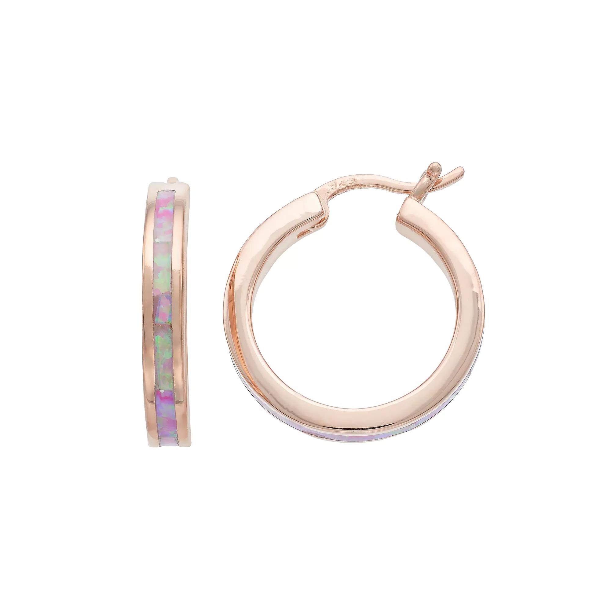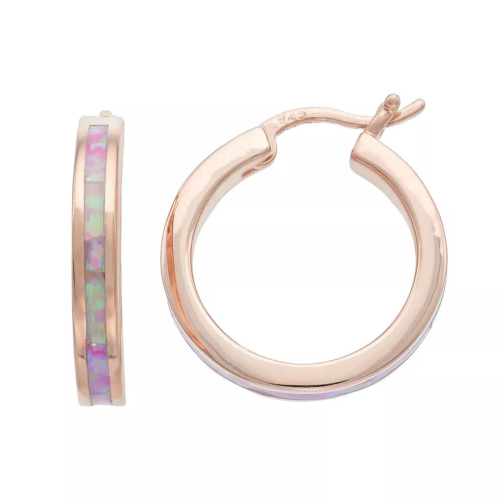 Decorated with illuminating lab-created pink opal inlays, these hoop earrings offer eye-catching style.EARRING DETAILSLength: 0.79 in. Backings: click-itMetal: sterling silverPlating: 14k goldPackaging: boxedSTONE DETAILSStone type: lab-created pink opalTotal weight: 1 1/6 ct.Setting: inlayGemstones may have been treated to enhance their appearance. Special care may be required. Size: One Size. Gender: female. Age Group: adult. Material: Gold Over Sterling.