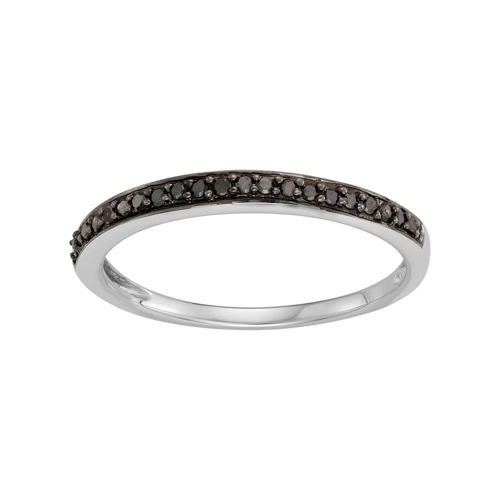 Decorated with a row of round-cut black diamonds, this 14k white gold stack ring can be worn alone or paired with other rings. RING DETAILS Width: 0.09 in. Metal: 14k white gold Plating: white & black rhodium Packaging: boxed DIAMOND DETAILS Total weight: 1/10 ct. Shape: round Color: black Setting: prong Gemstones may have been treated to enhance their appearance. Special care may be required. Please visit our Gemstone Treatment & Special Care Guide for more information. Image(s) may be enlarged to show detail.Diamond weights are approximate. Diamond total weights may vary between .01 and .08 ct. Some diamonds have fewer than 17 facets. Gender: female. Age Group: adult.