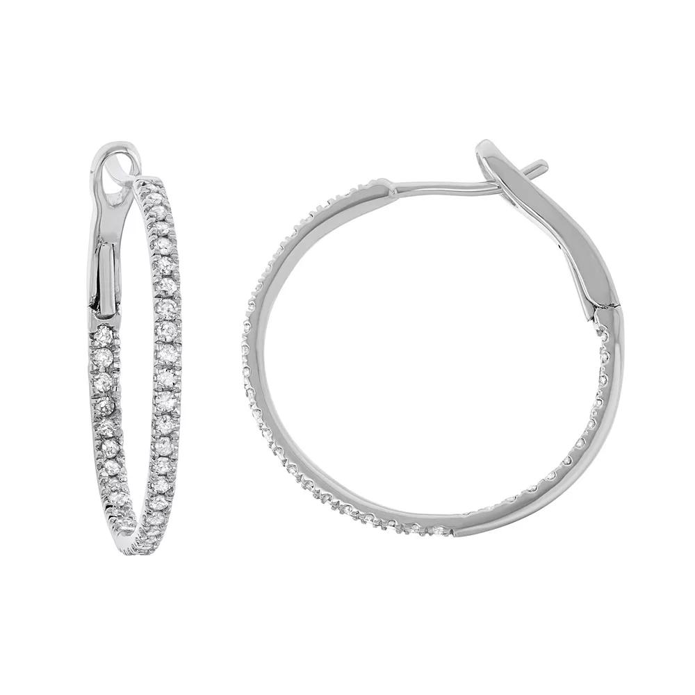 Featuring an inside-out design adorned with diamonds, these 14k white gold hoop earrings offer scintillating style.EARRING DETAILS Diameter: 1.34 in. Closures: leverback Metal: 14k white gold Plating: rhodium DIAMOND DETAILS Total weight: 1/2 ct. Shape: single cut Color grade: H-I Clarity: I1-I2 Setting: prong Gemstones may have been treated to enhance their appearance. Special care may be required. Please visit our Gemstone Treatment & Special Care Guide for more information. Image(s) may be enlarged to show detail.Diamond weights are approximate. Diamond total weights may vary between .01 and .08 ct. Some diamonds have fewer than 17 facets.Please note, due to the high value of this item, a signature may be required upon delivery. Size: One Size. Gender: female. Age Group: adult. Material: Rhodium|Gold.